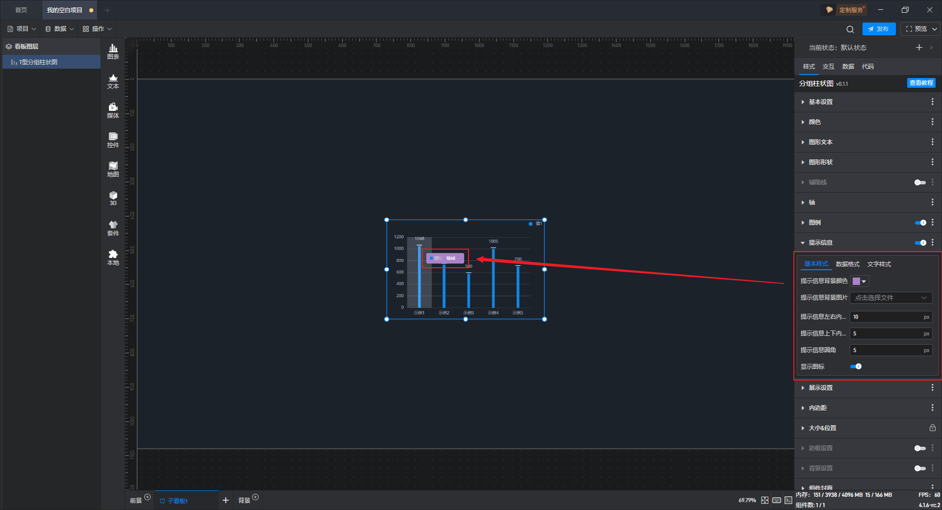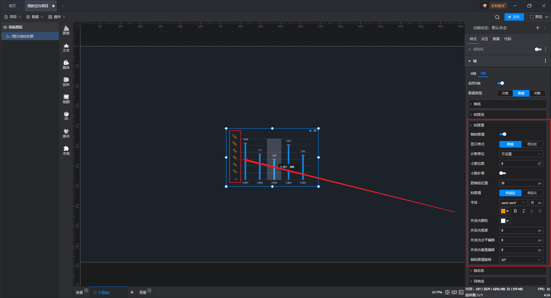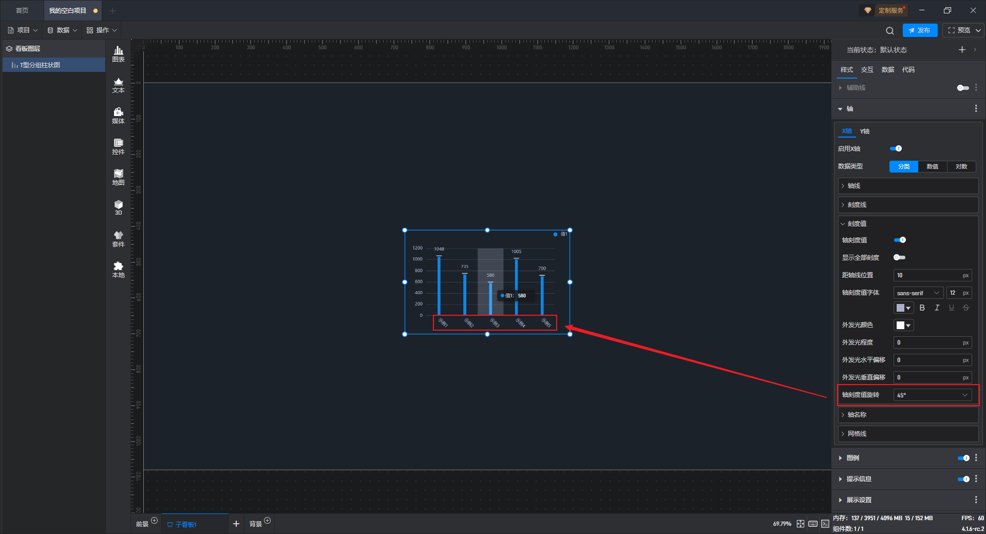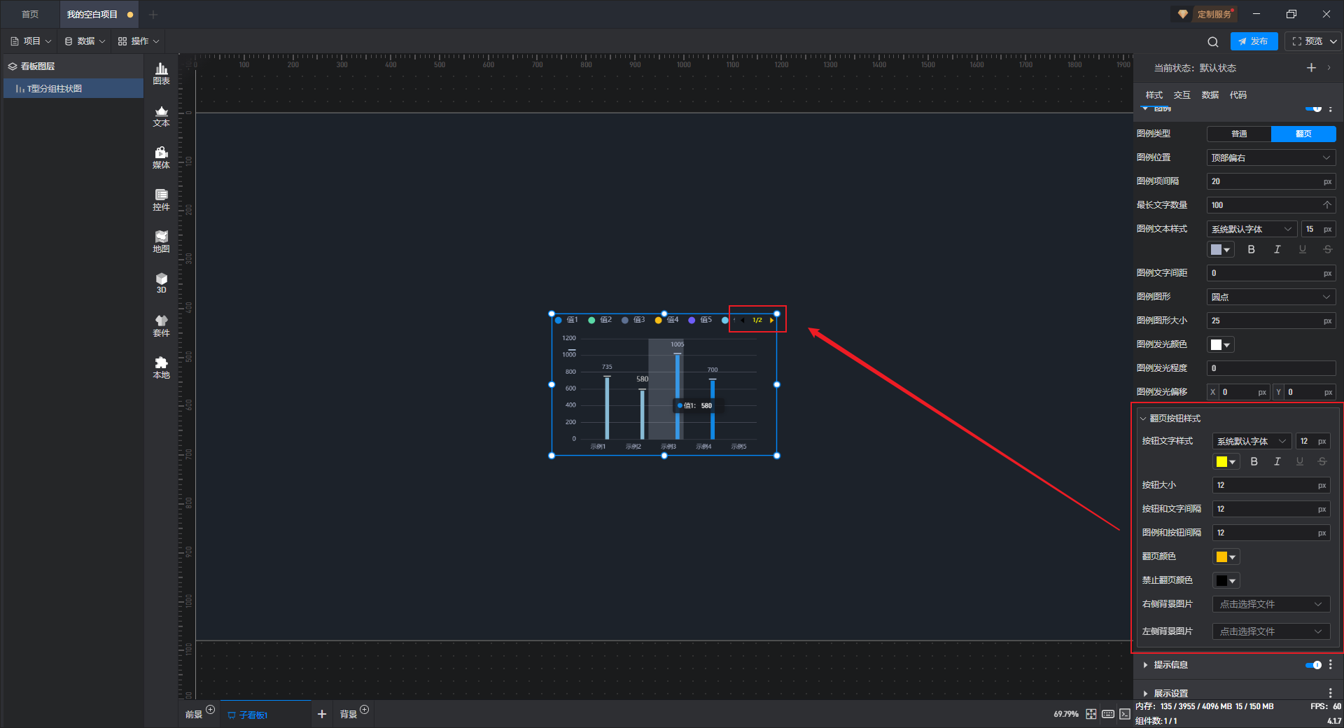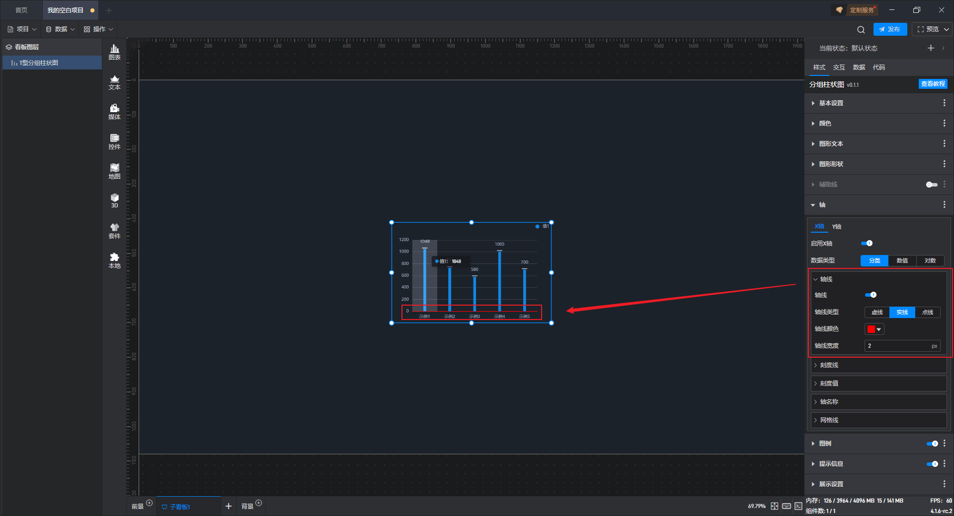 开启高亮设置,并设定高亮颜色、边框宽度等,就可以看到组件在显示对应数据柱子时会显示设置的高亮颜色。