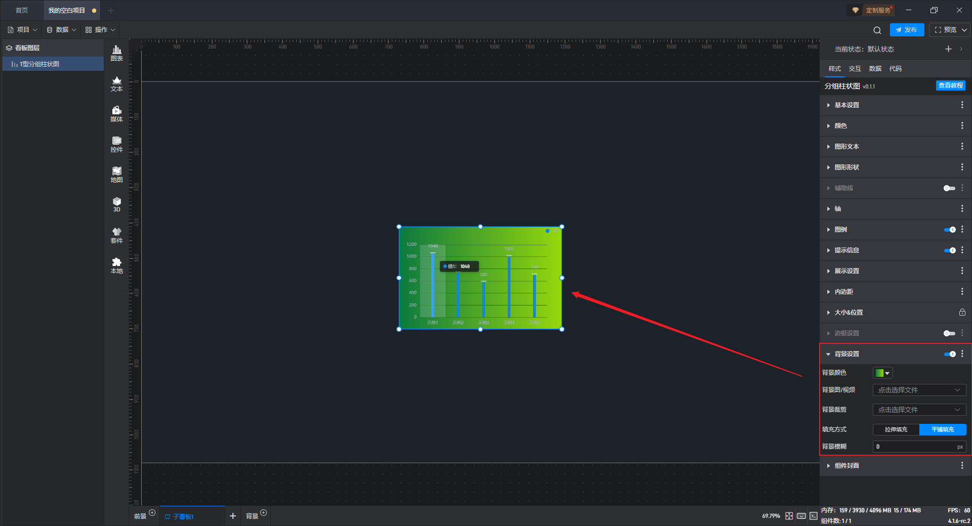 组件默认没有背景颜色,如果需要设置背景颜色,需要先开启“背景设置”项按钮。