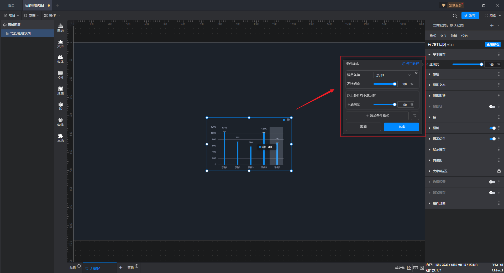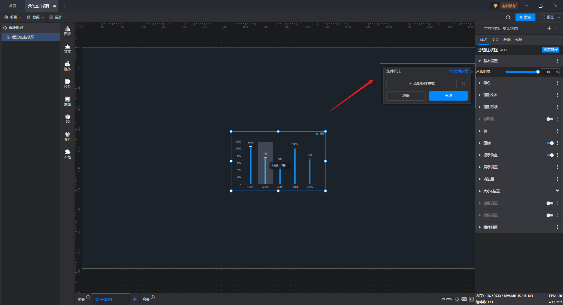 点击选中组件,开启“条件样式”按钮,就可以进行条件样式的设置。