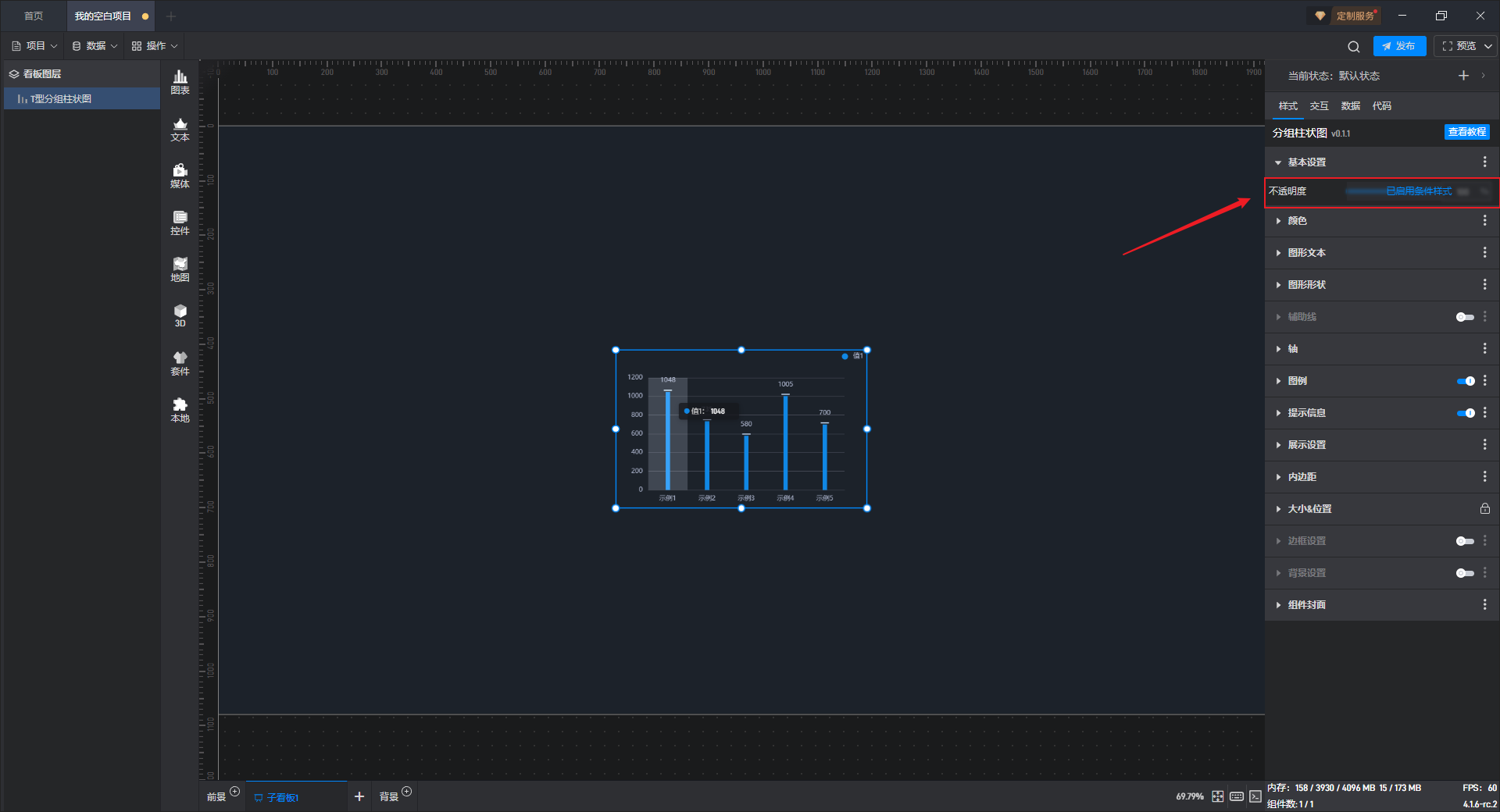 | 不透明度 | 1)根据个人喜好或整体和谐度合理地使用透明度,会让大屏布局更美观; | 2)这个设置项的一个常见用法是结合条件样式/交互/多状态来实现组件的显示和隐藏。 |
