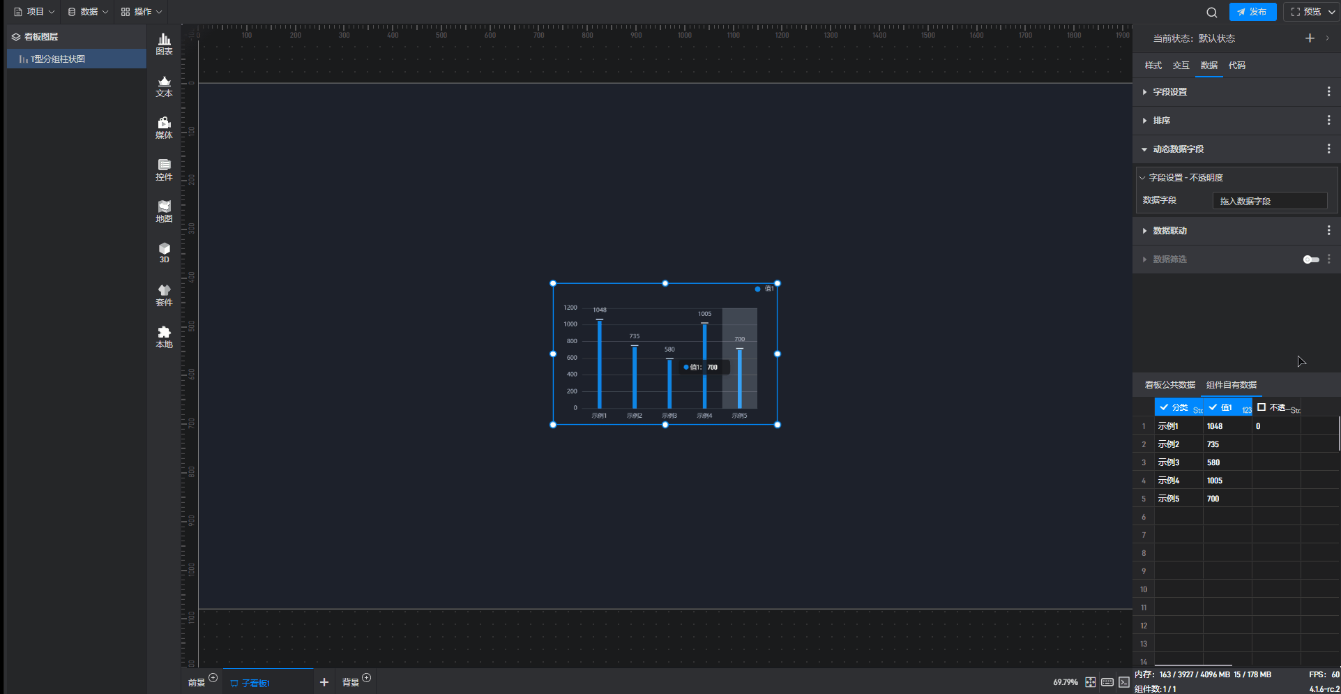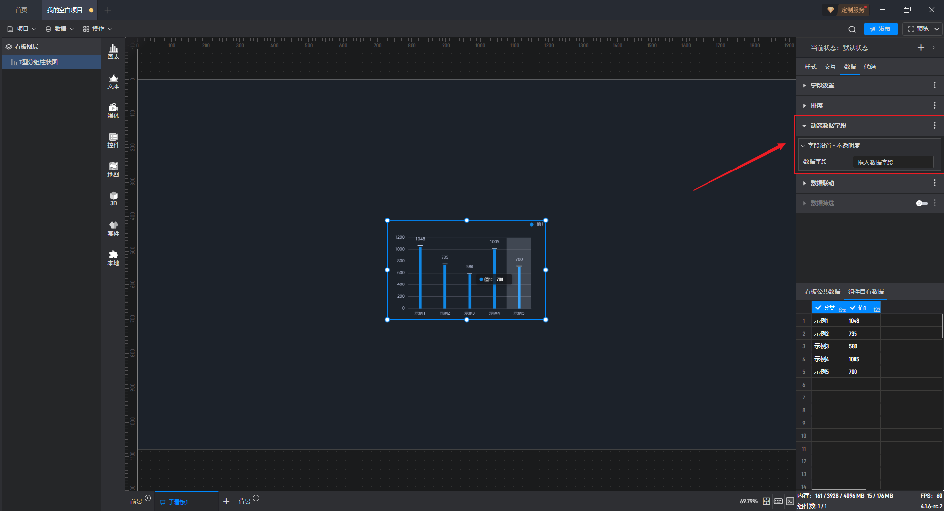 单击选中组件,在右侧“数据”设置窗口中,可以看到组件已经设置好了数据字段,且数据字段来自于“组件自有数据”。