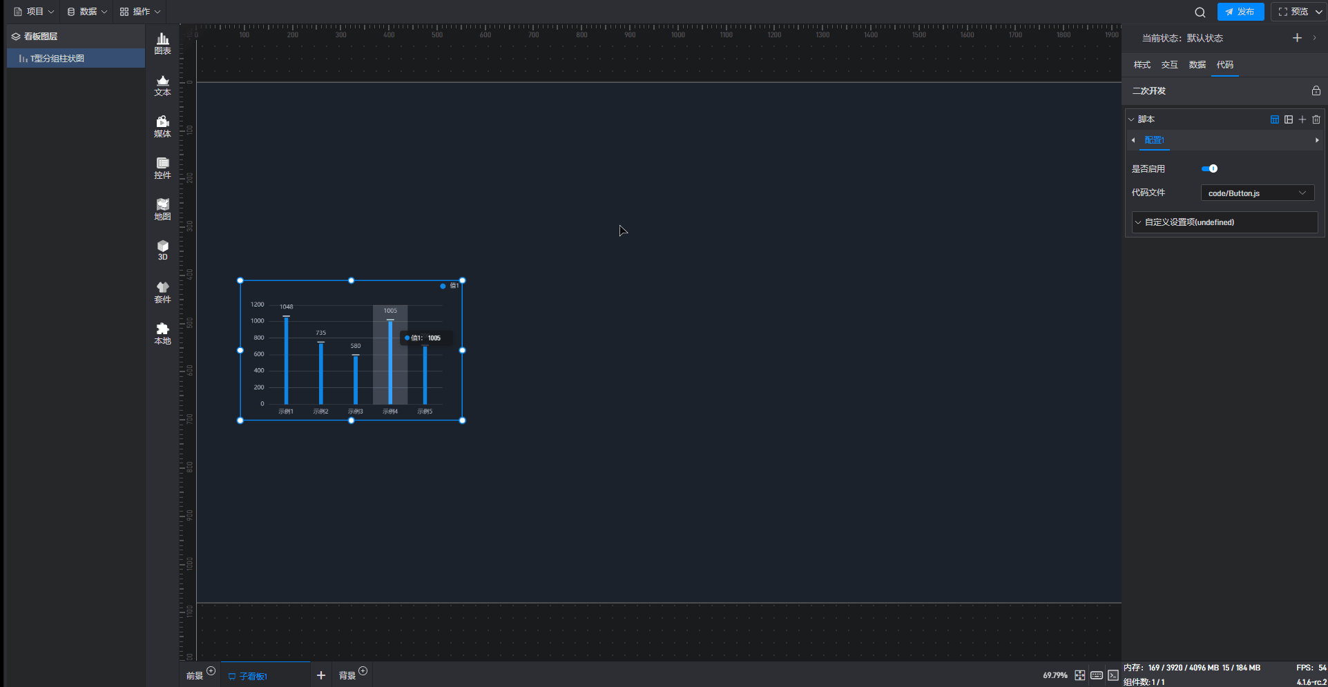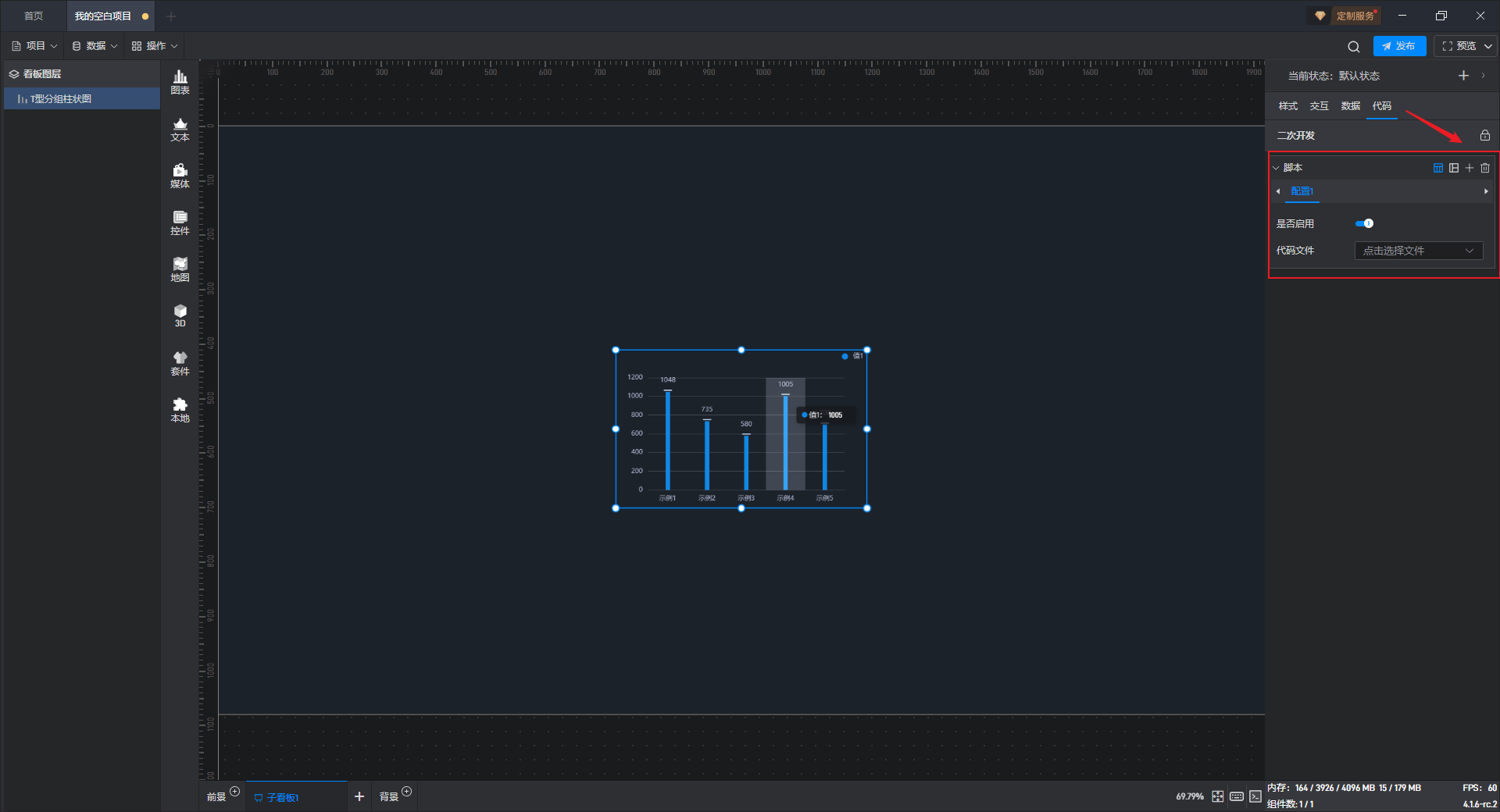 点击选中组件,在右侧“代码”设置窗口中可以对组件进行二次开发设置。