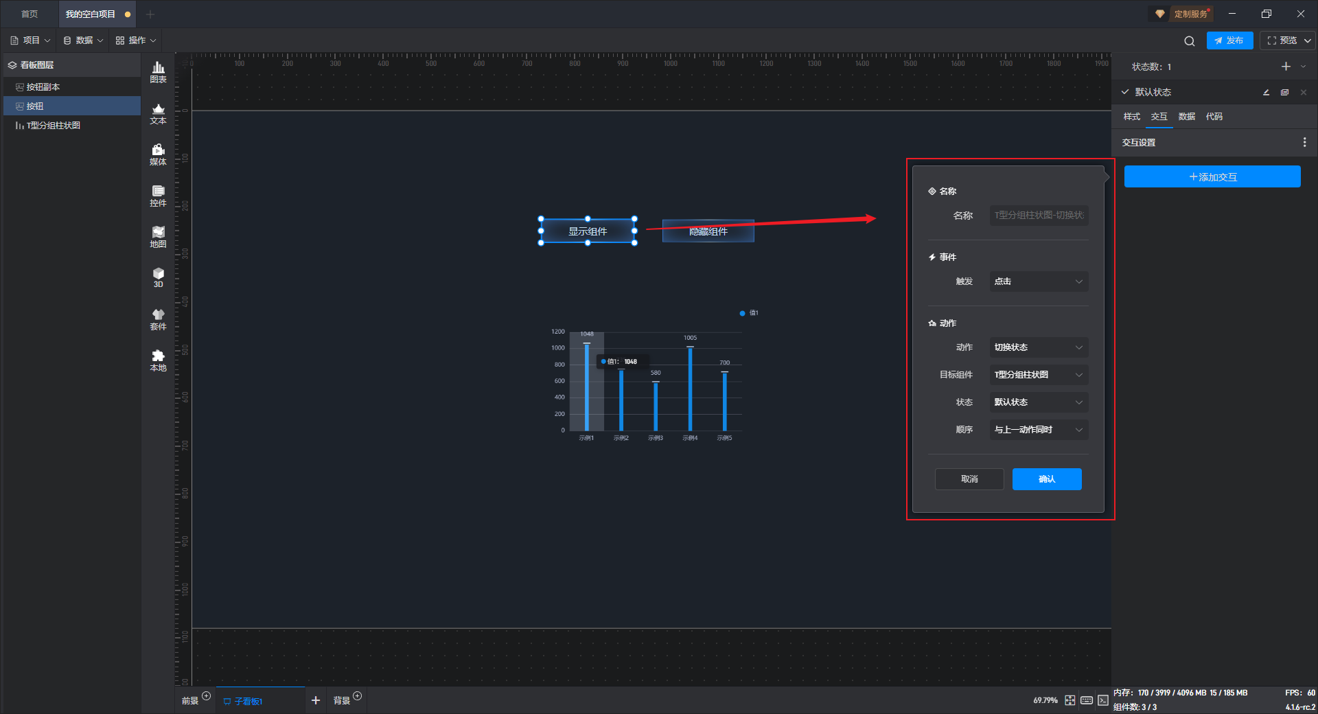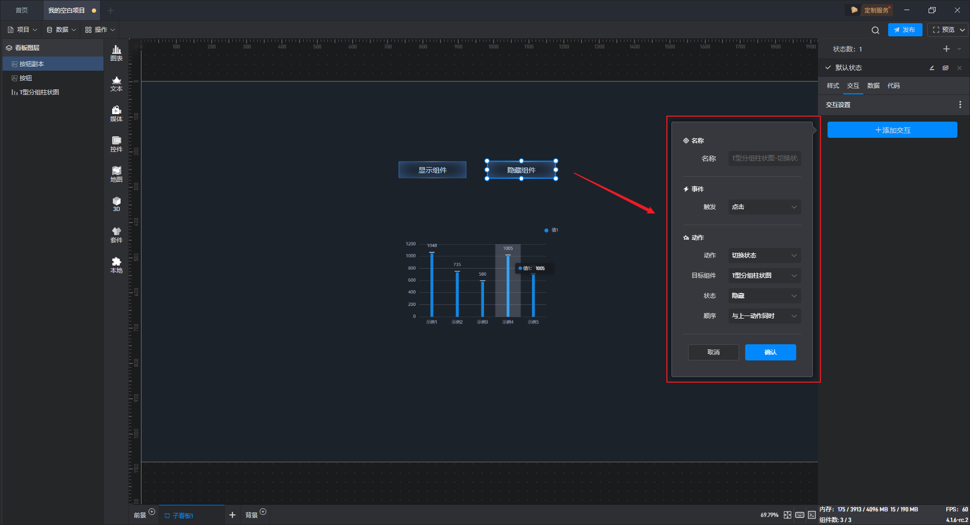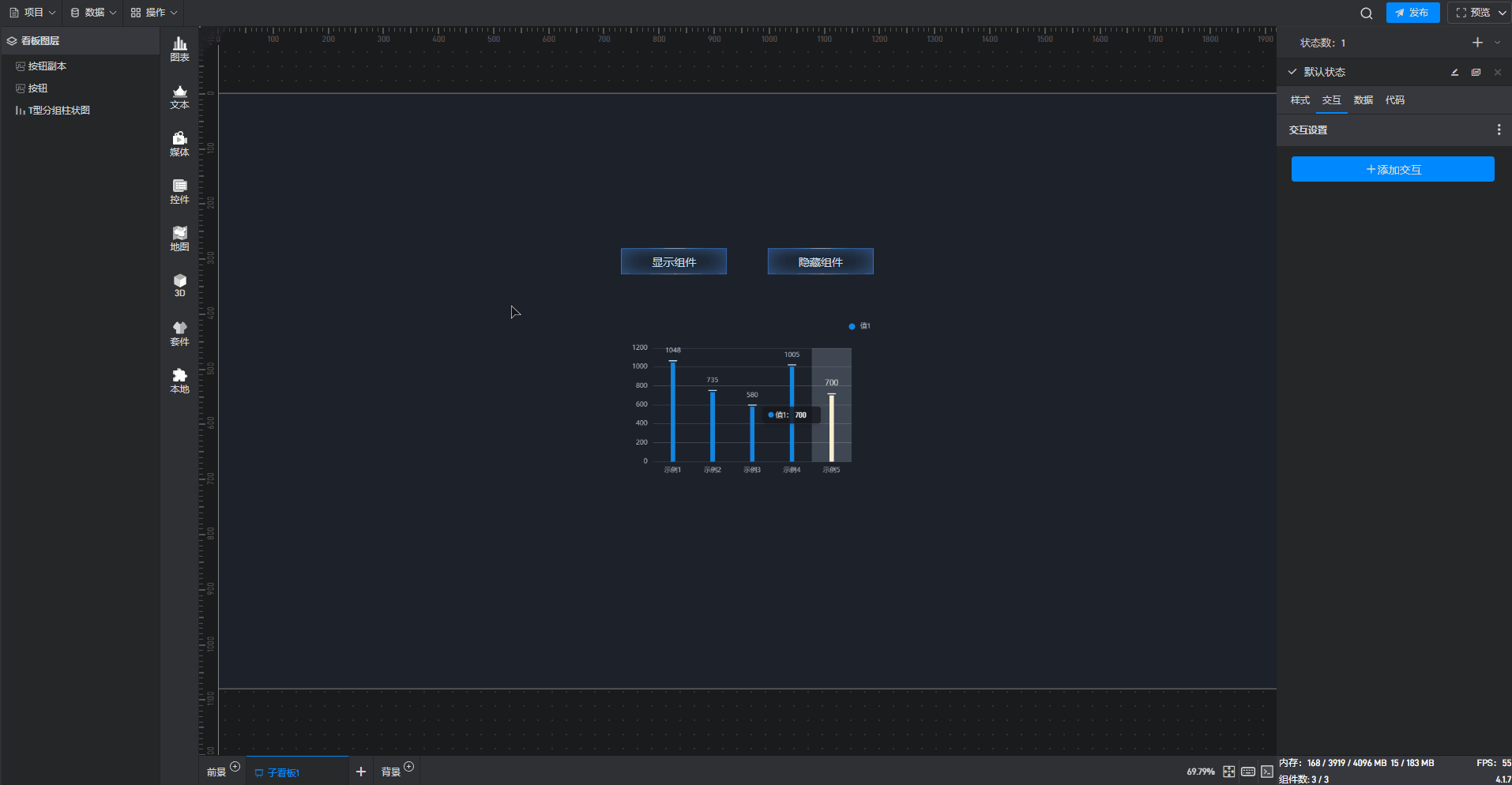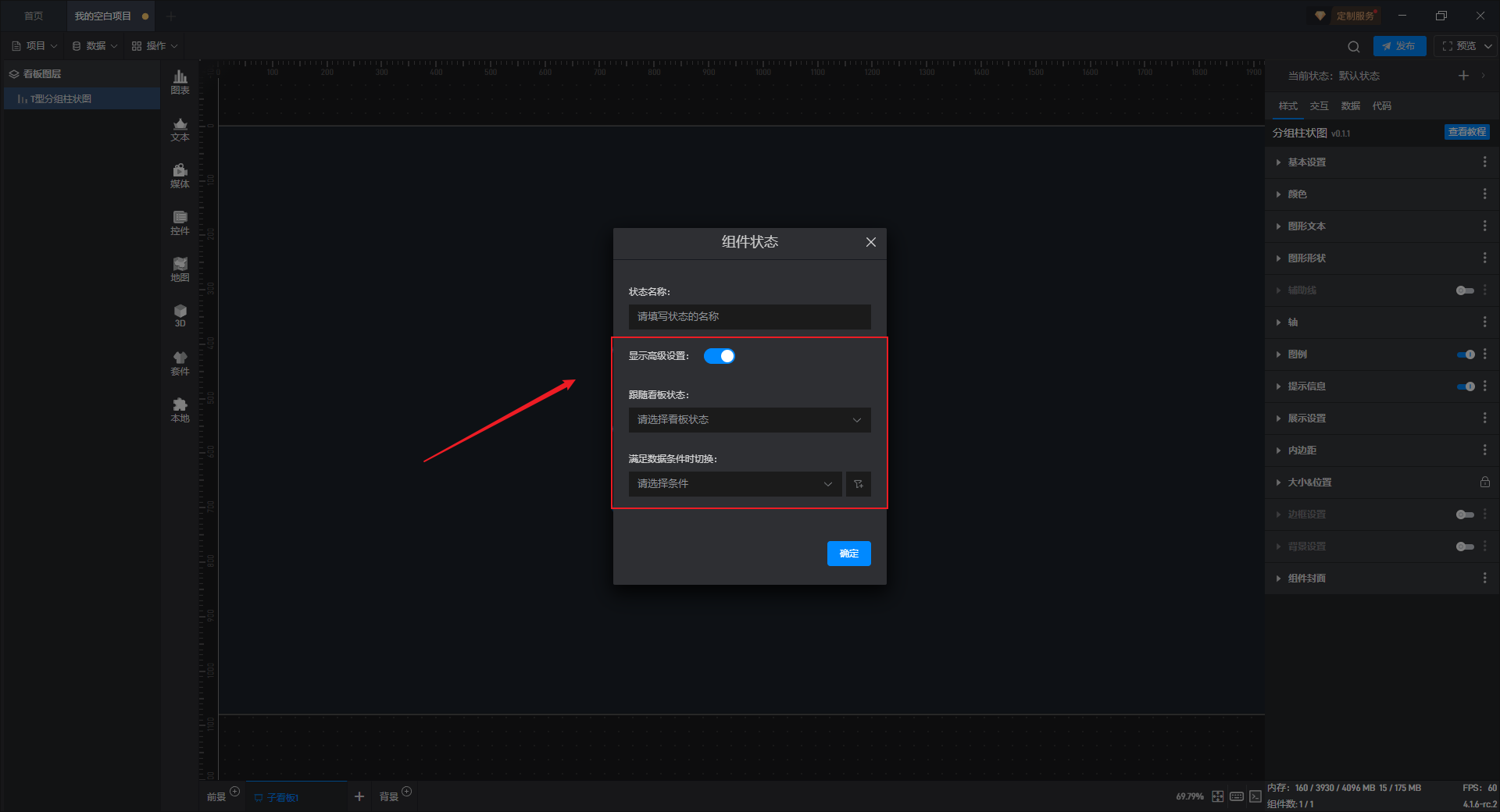 多状态主要用于通过数据条件或是点击交互(通常是点击其他组件来触发本组件的状态切换)来切换组件设置项的场景,这里的设置项包括组件的样式、交互、数据和代码。