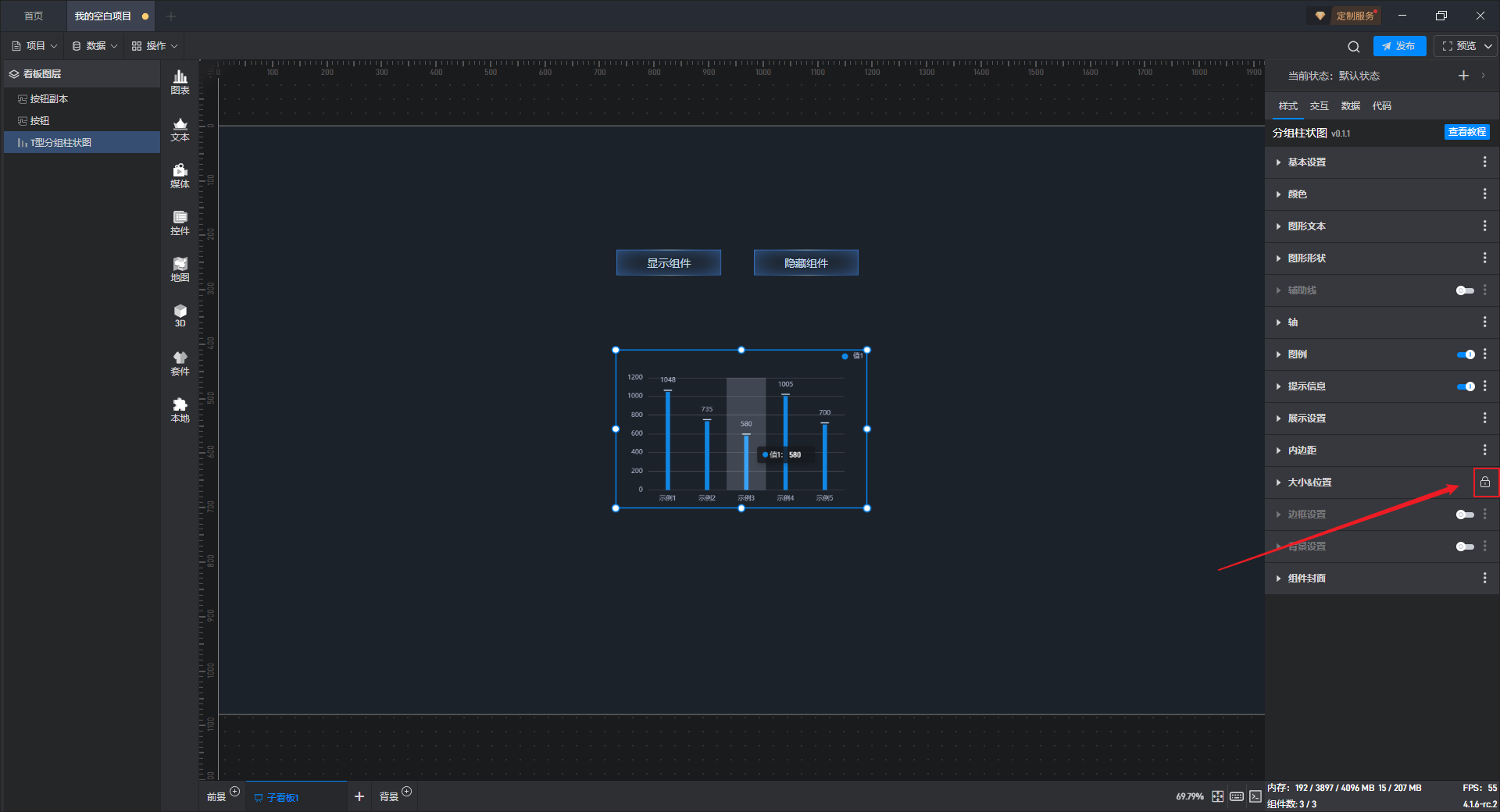 可以通过直接点击和拖动组件来调整大小和位置,也可以通过直接输入宽、高、X 坐标和Y 坐标的方式来设置。