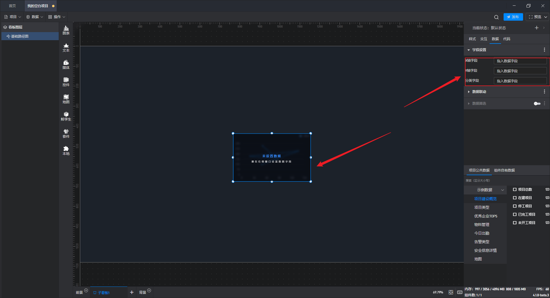 删除当前字段后,右侧字段栏为空,同时组件会提示“未设置数据”。