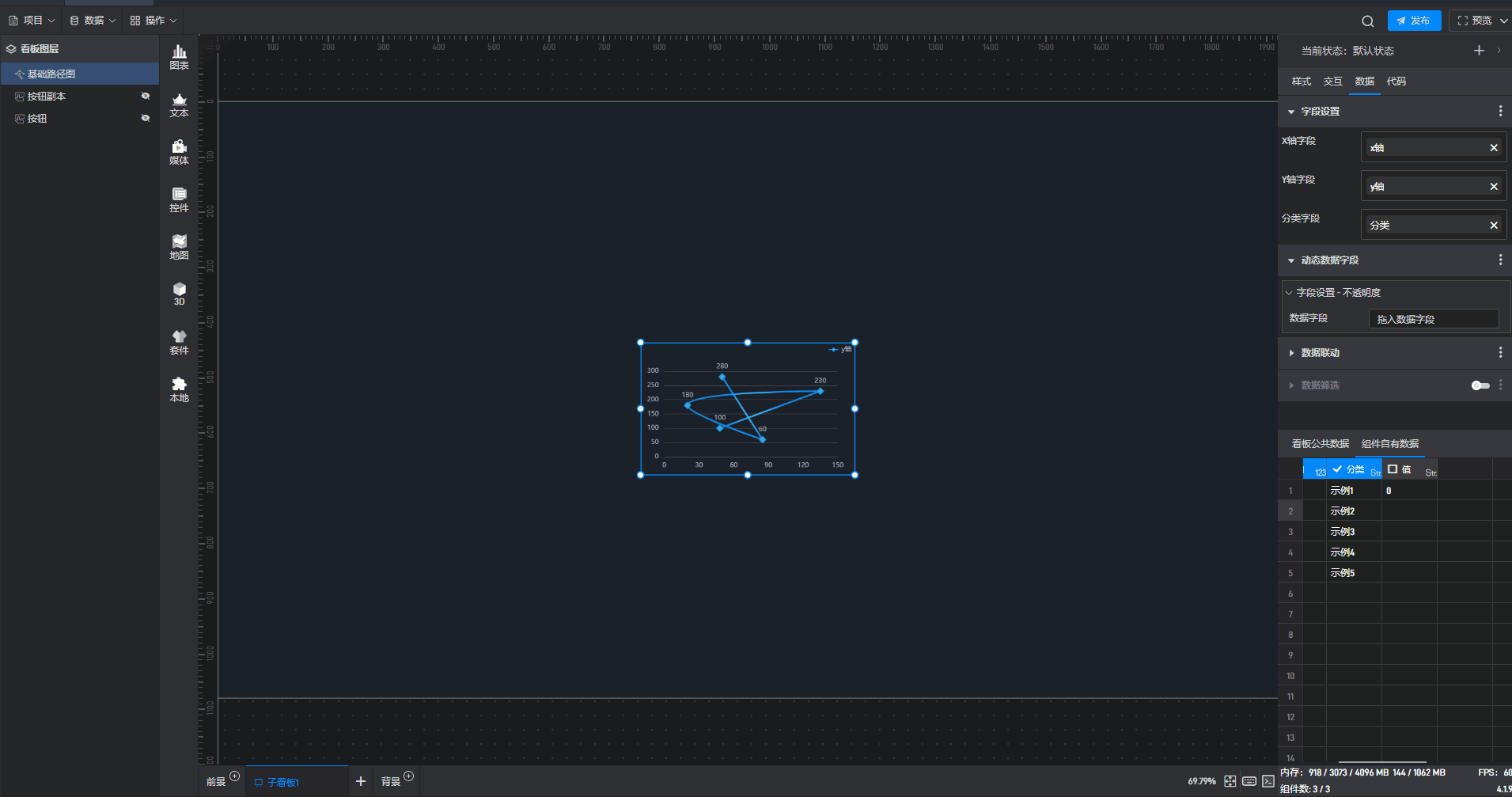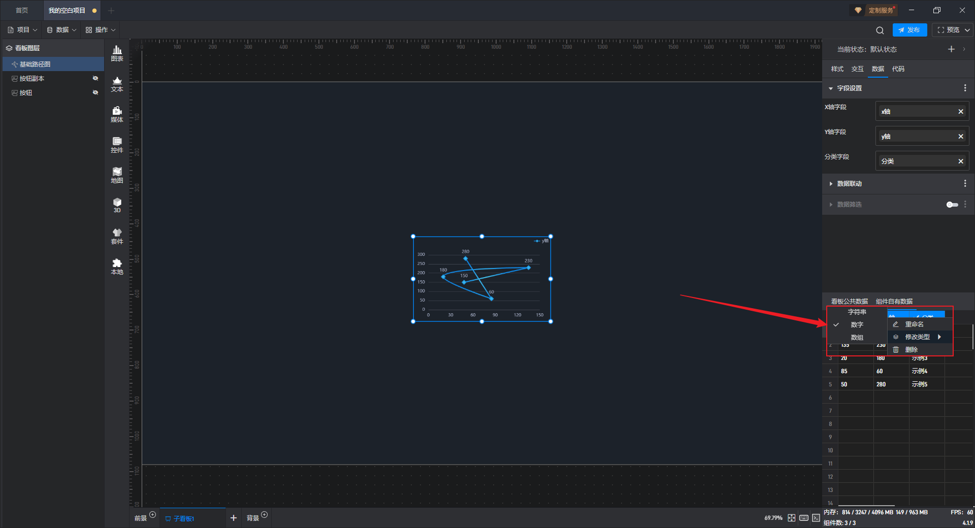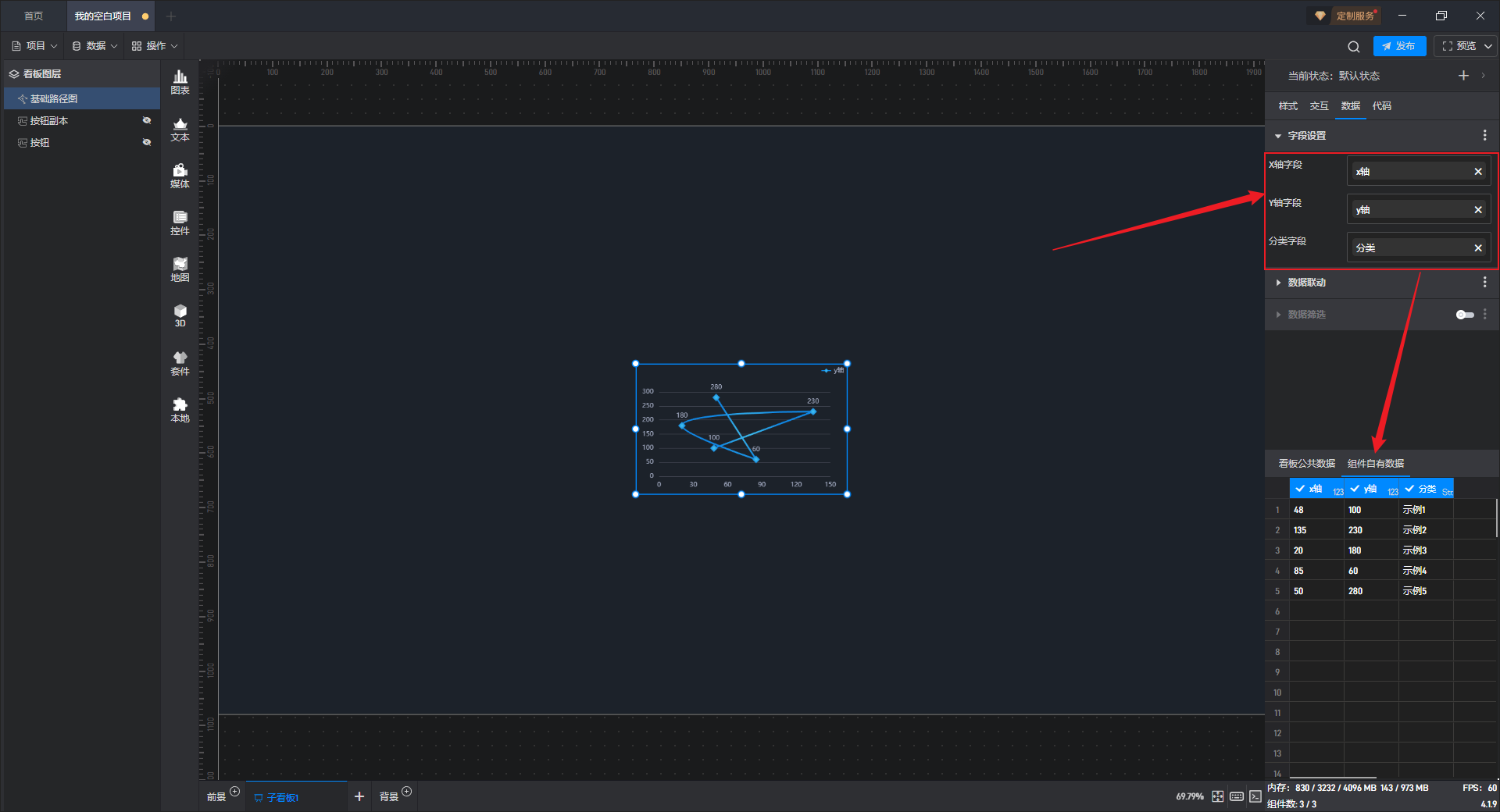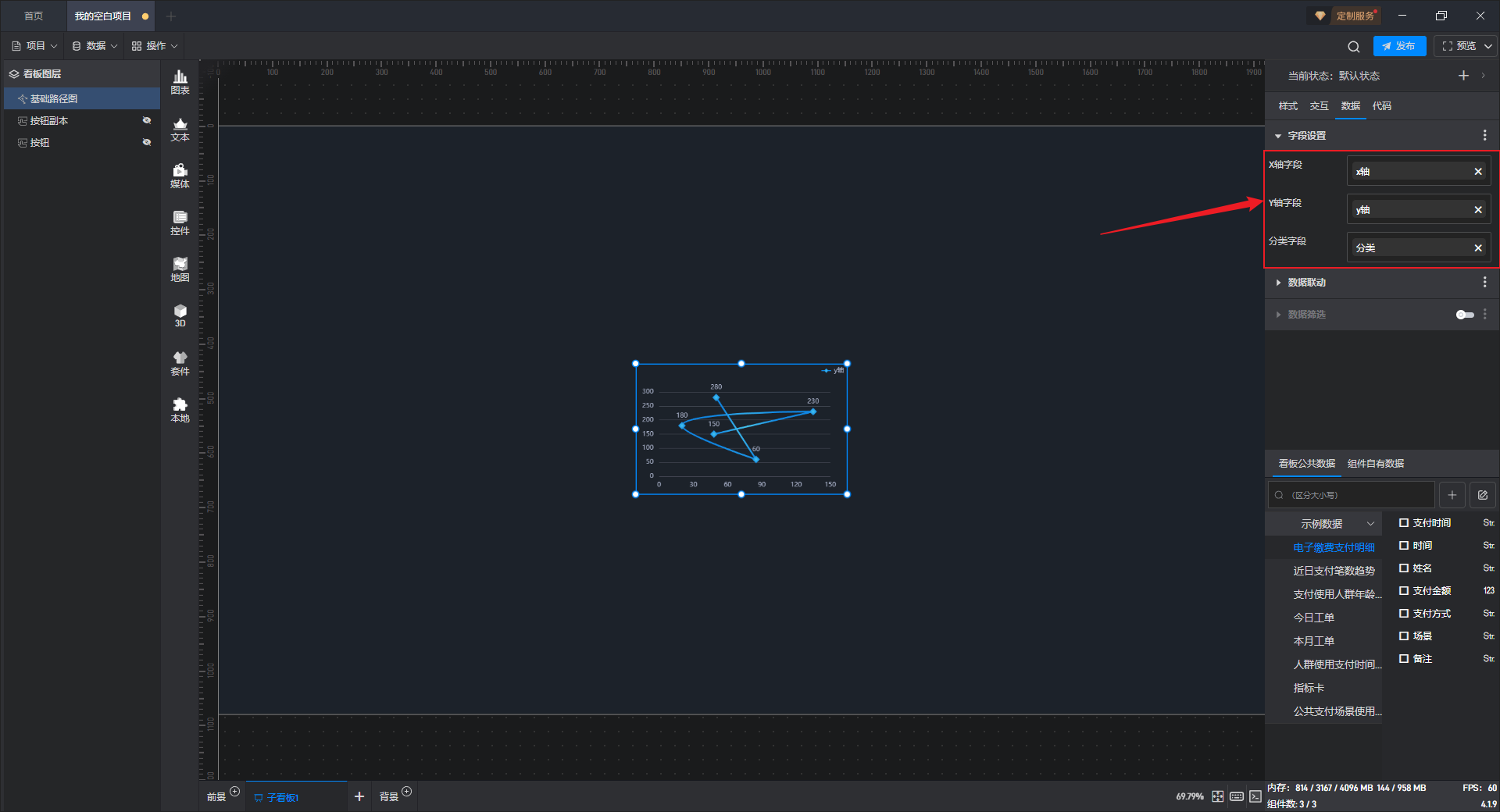 其中 X 轴字段和 Y 轴字段是数字类型,分类字段是字符串类型。