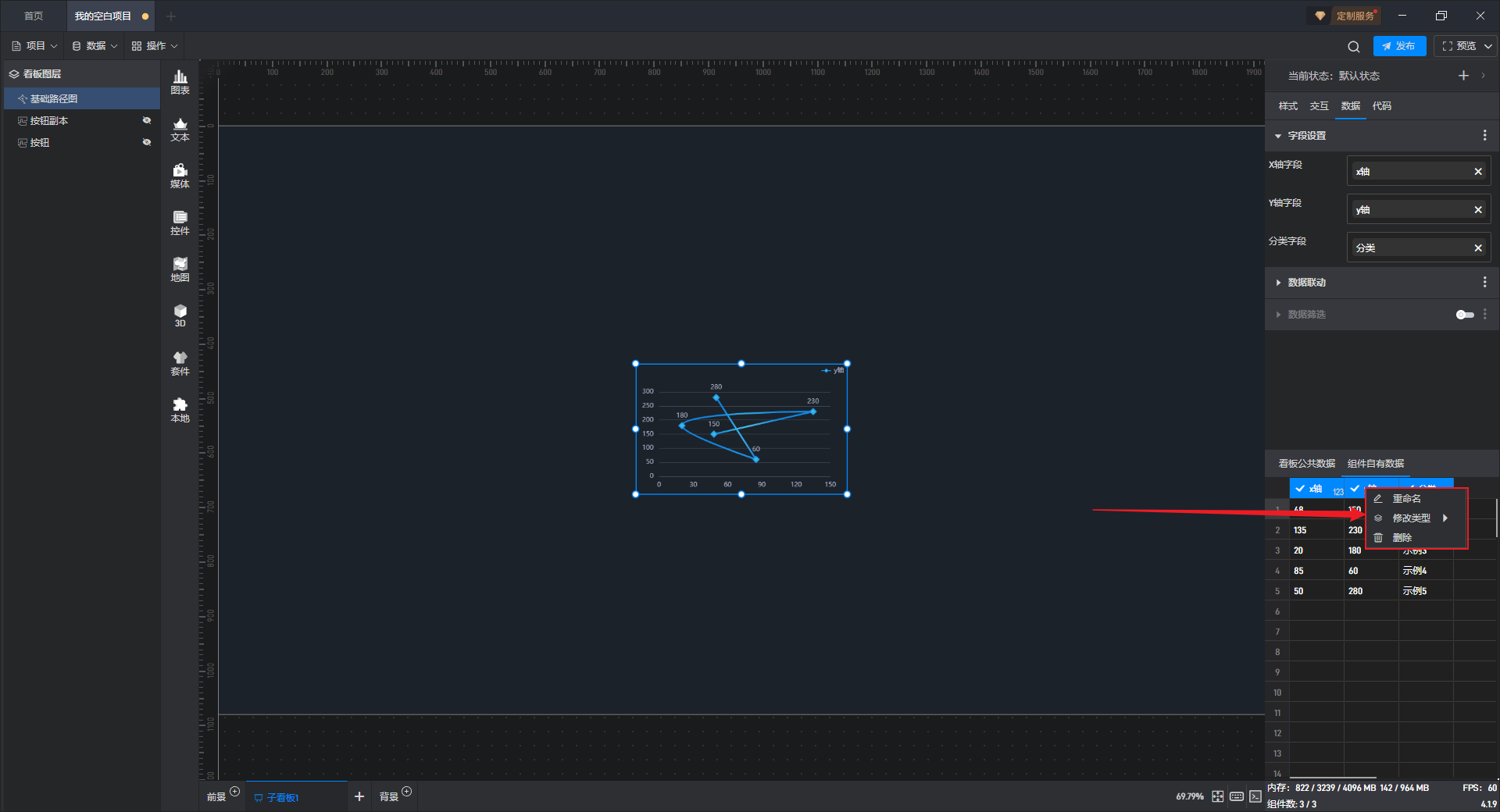 在“数据”设置界面下方可以直接修改数据,组件中的数据也会实时更新。