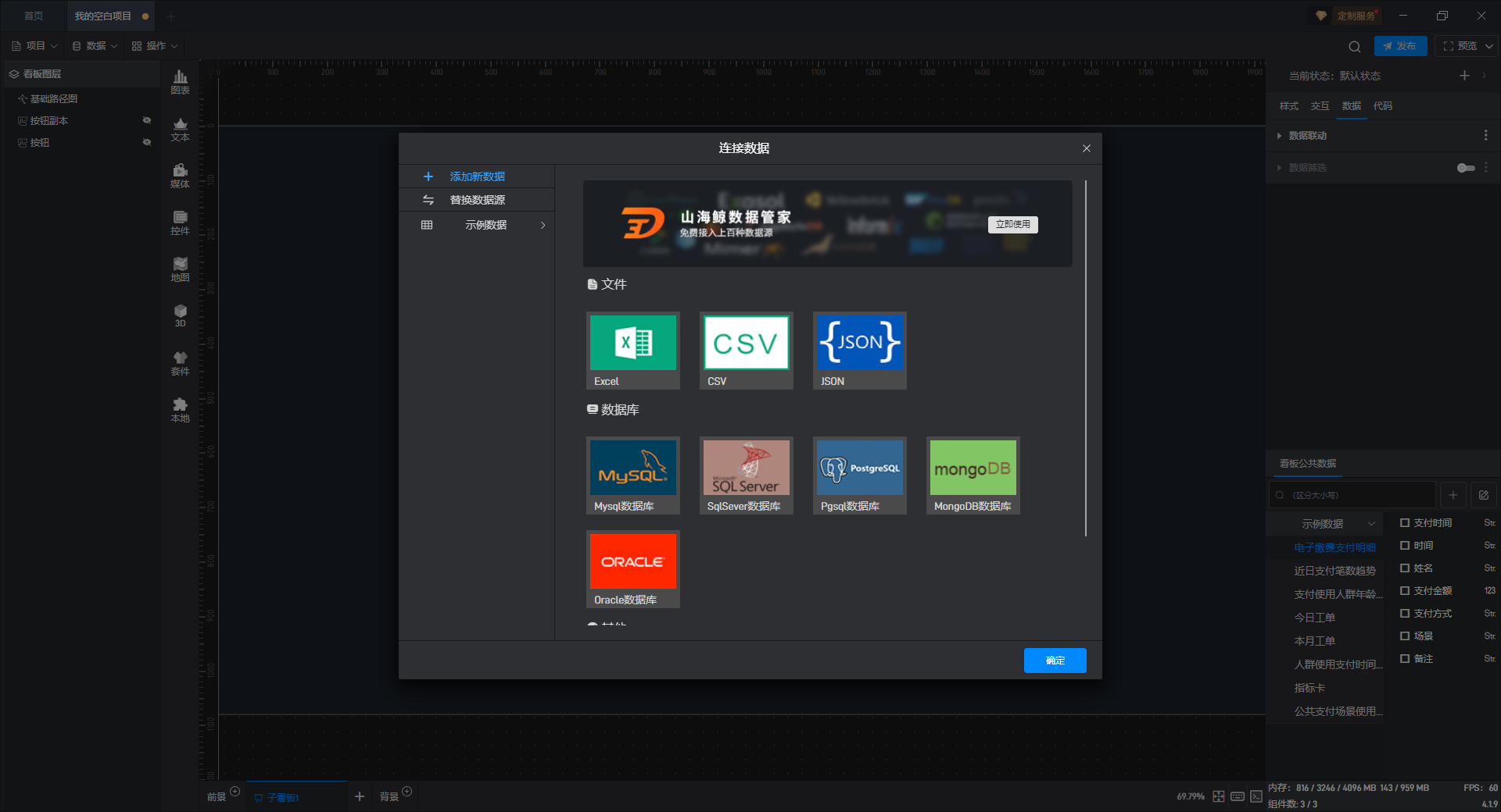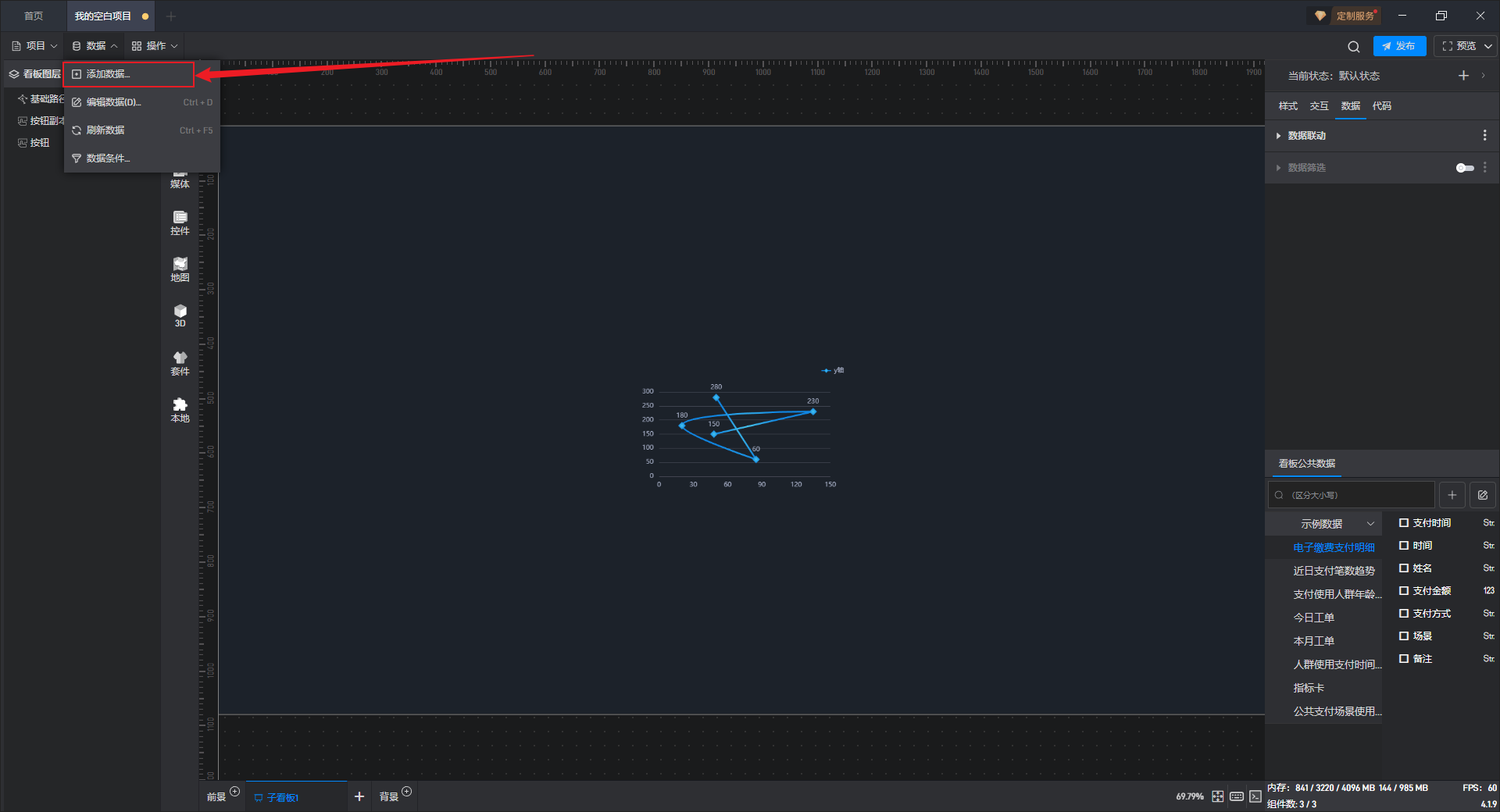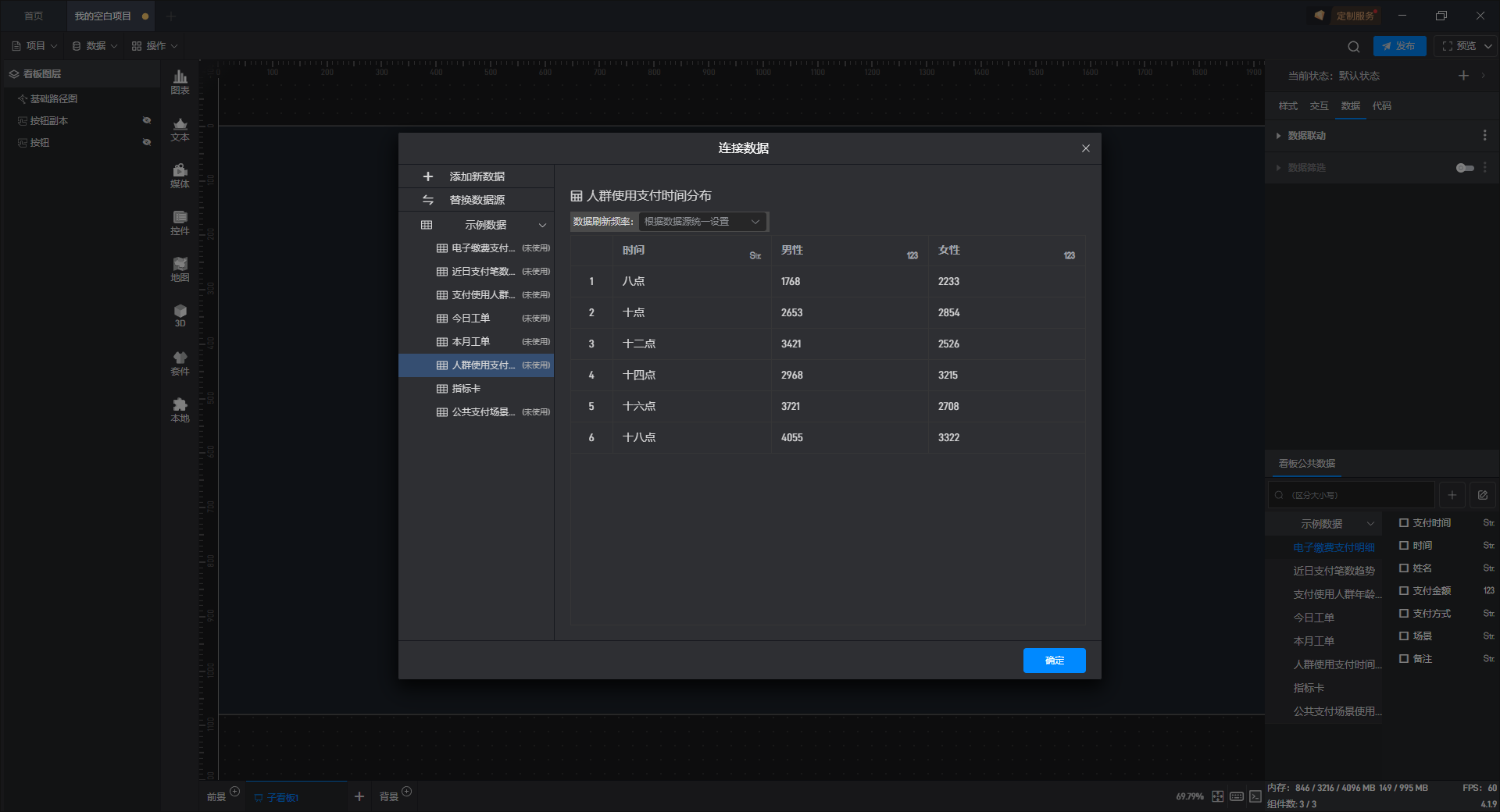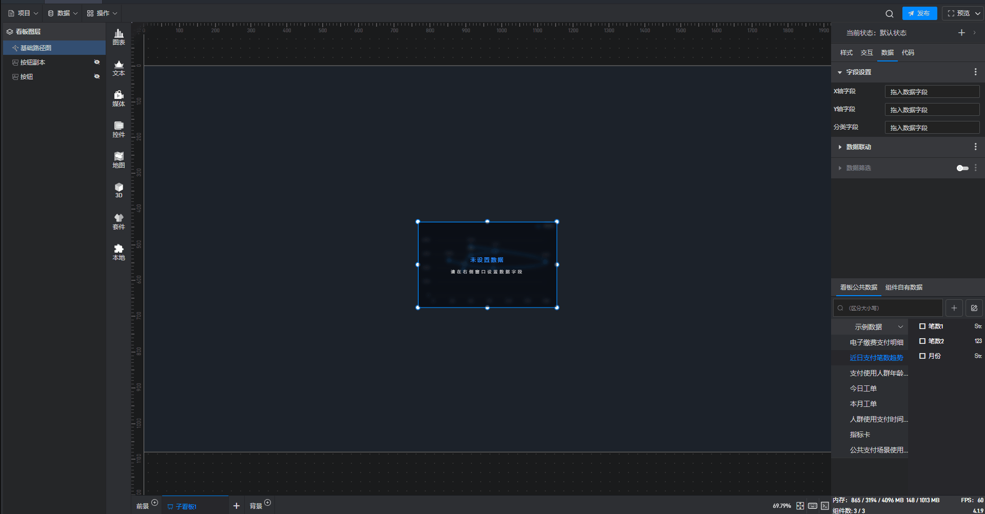 点击选中组件,在右侧“数据”设置窗口中切换到“看板公共数据”(同一个项目中所有数据源是共享的)。