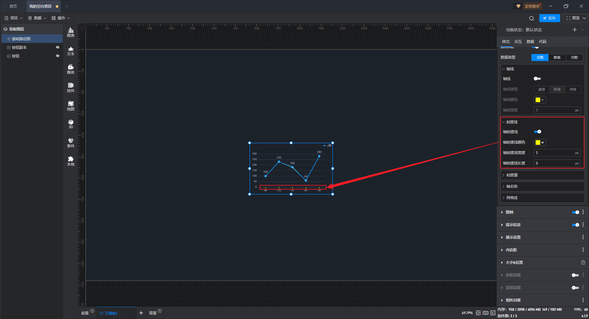 | 轴刻度线宽/长度 | 自定义输入 X 轴刻度线的宽、长度,默认宽度为“2px”,默认长度为“5px”。 |
