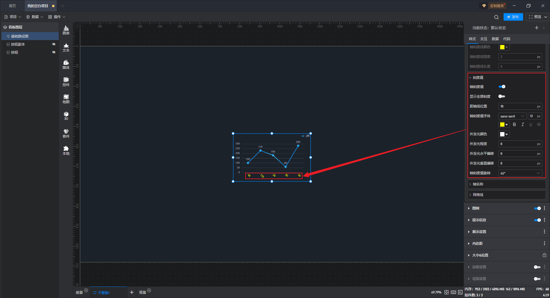 | 外发光程度 | 自定义设置 X 轴刻度值字体的发光程度,默认值为“0px”。 |