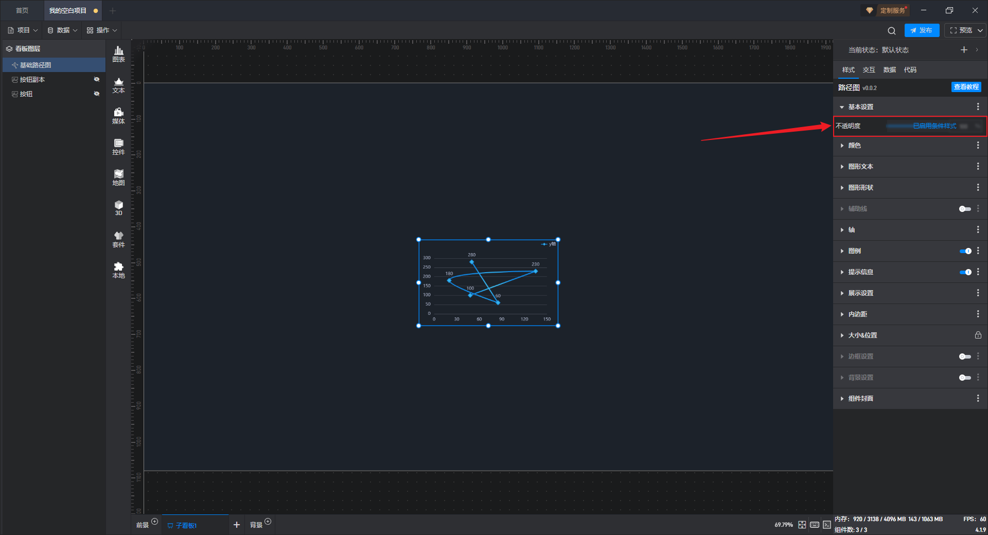 | 不透明度 | 1)根据个人喜好或整体和谐度合理地使用透明度,会让大屏布局更美观; | 2)这个设置项的一个常见用法是结合条件样式/交互/多状态来实现组件的显示和隐藏。 |