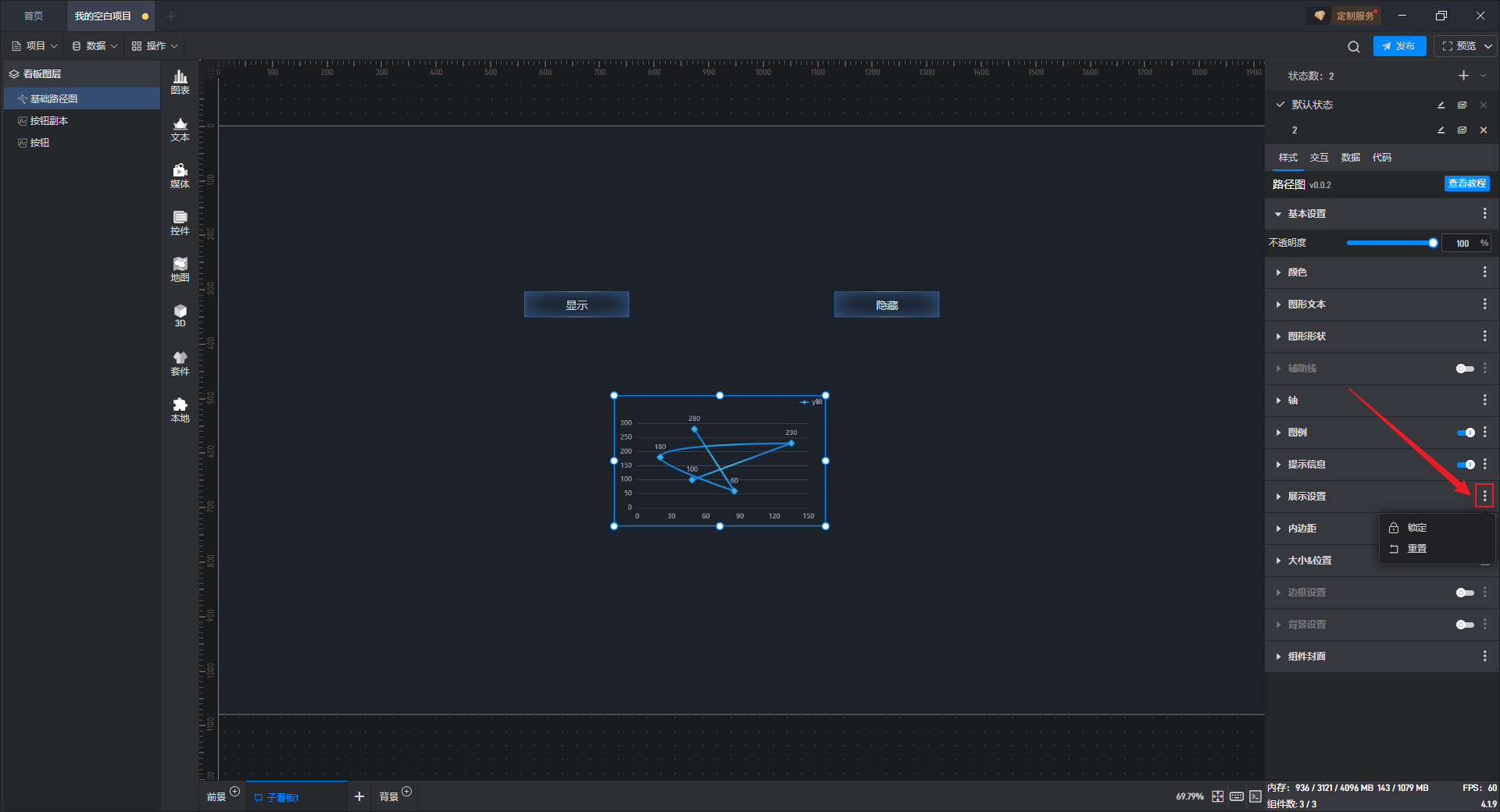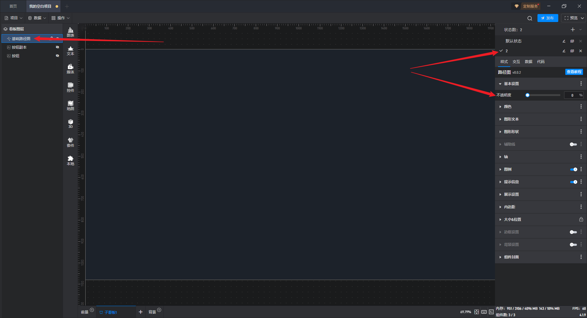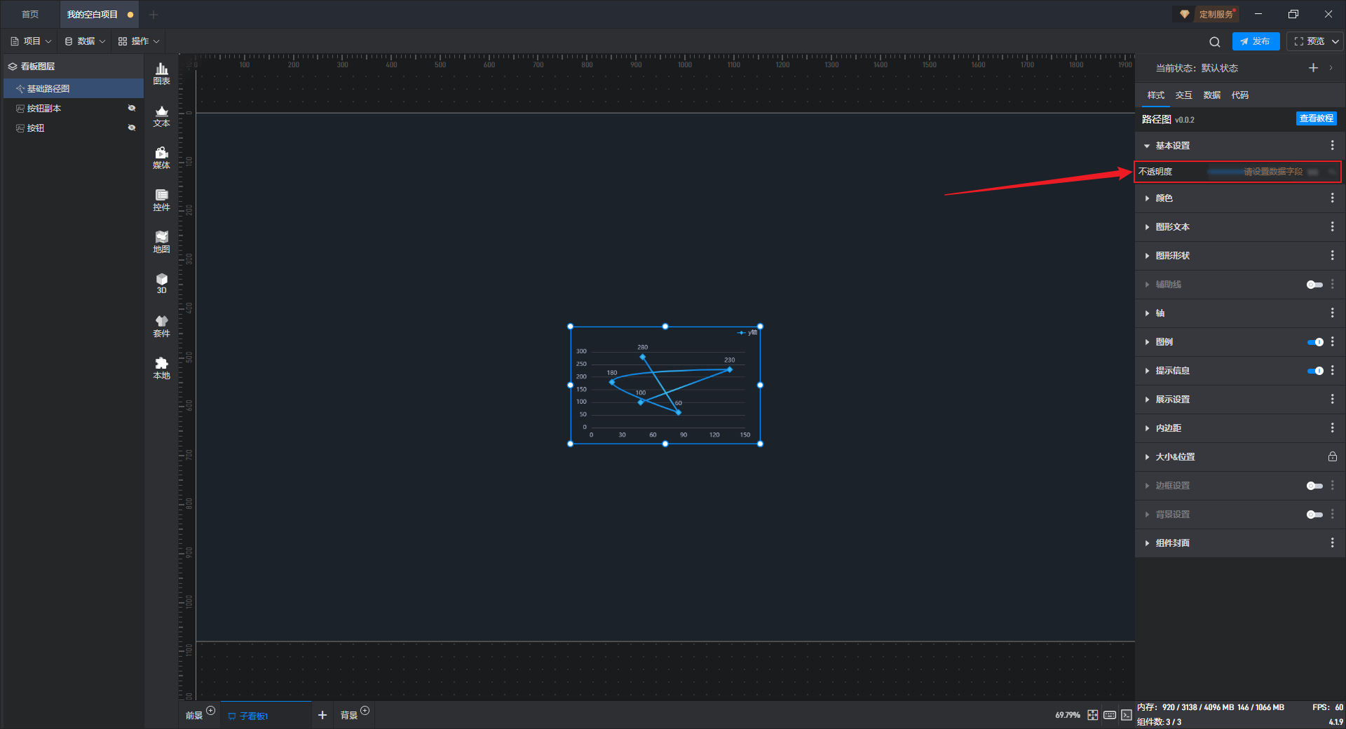 添加一个数值为“0”的数据到数据字段中,可以看到通过动态数据字段将不透明度的数值修改为“0”,从而使组件隐藏。