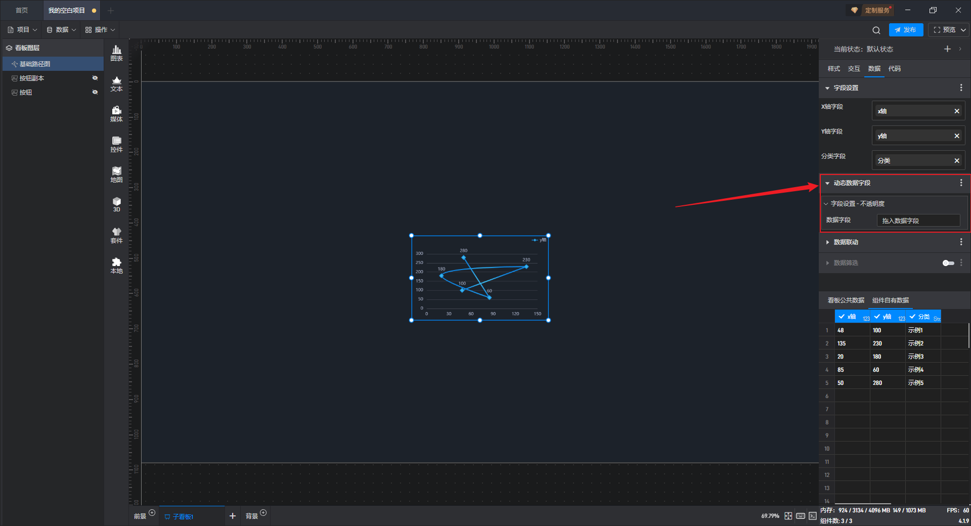 单击选中组件,在右侧“数据”设置窗口中,可以看到组件已经设置好了数据字段,且数据字段来自于“组件自有数据”。