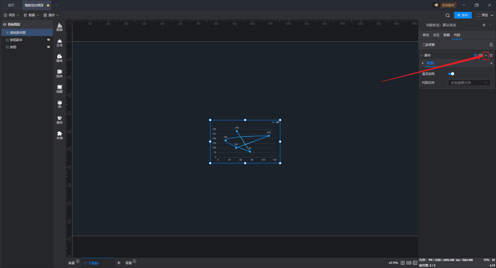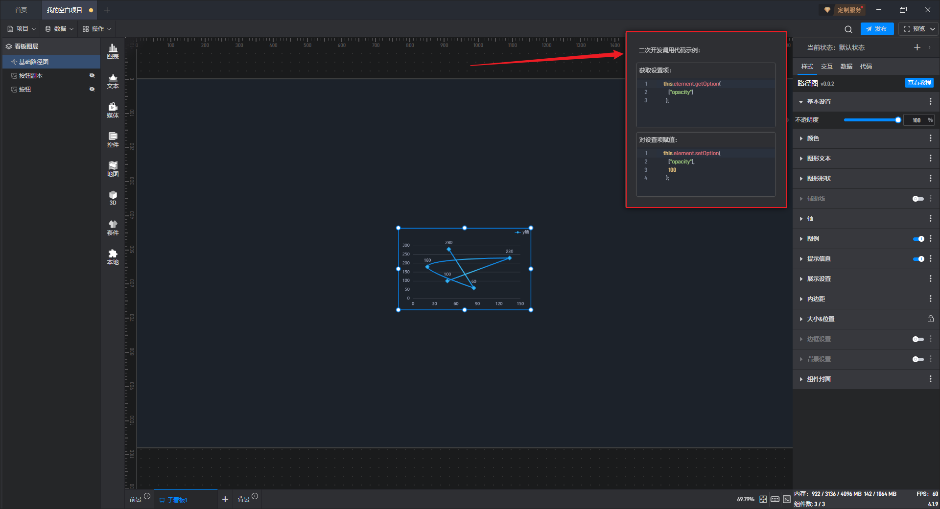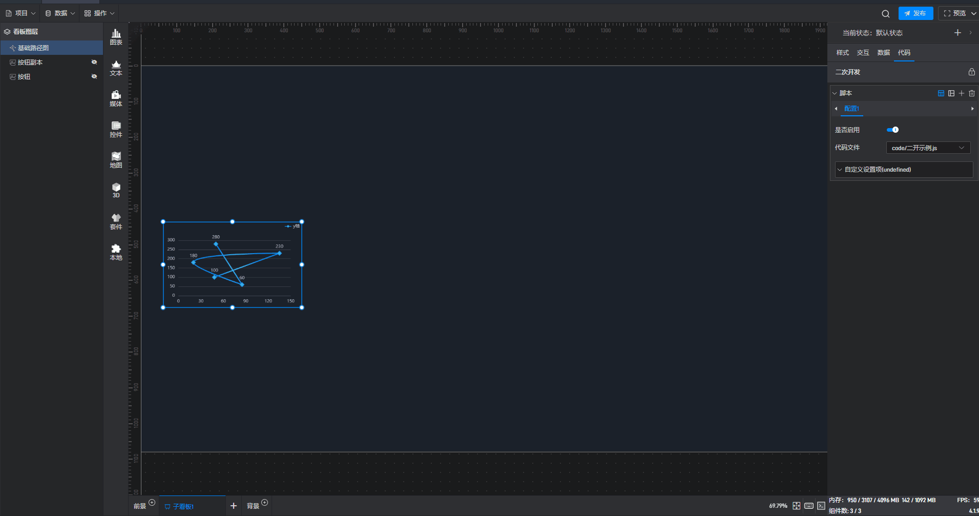 点击选中组件,在右侧“代码”设置窗口中可以对组件进行二次开发设置。