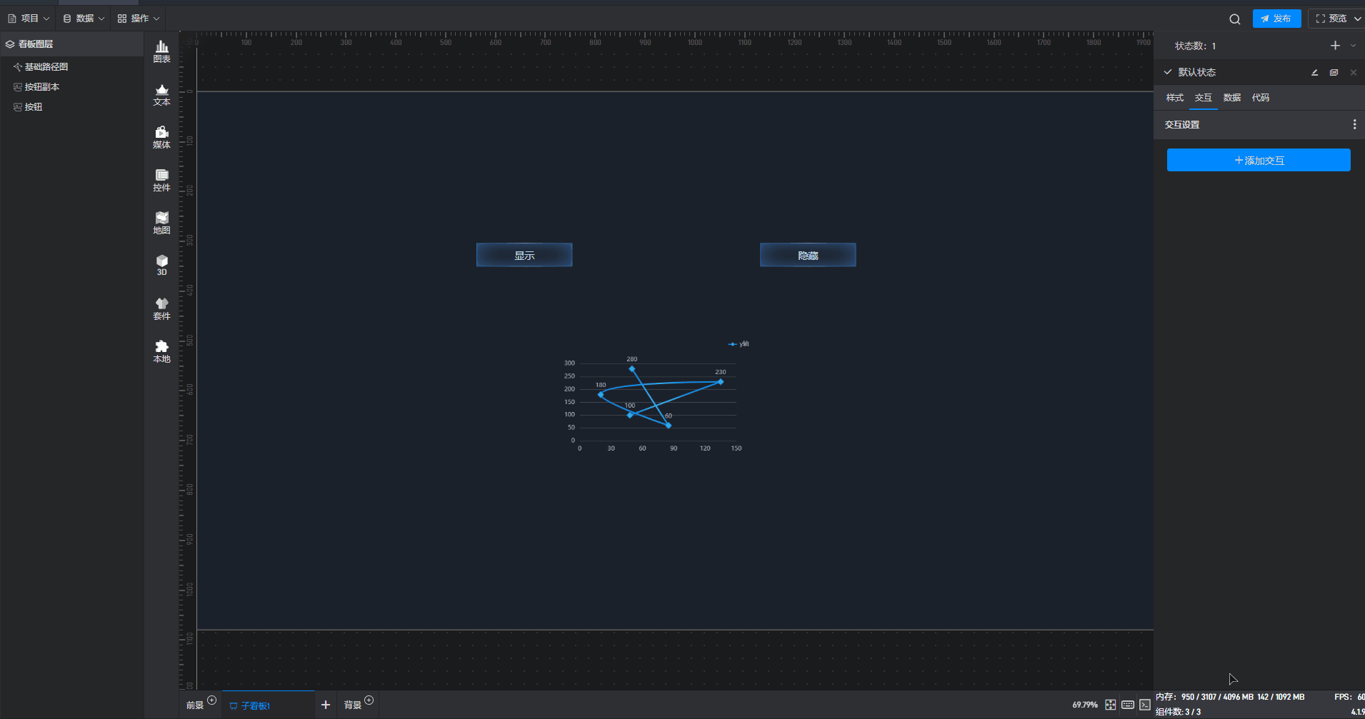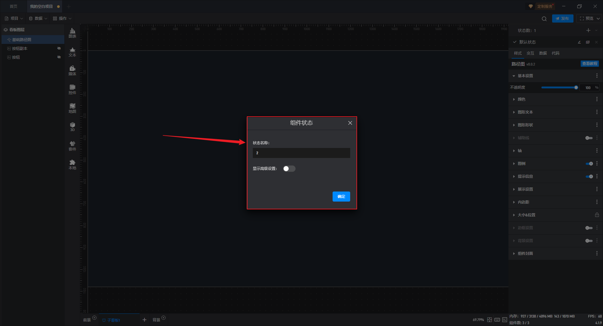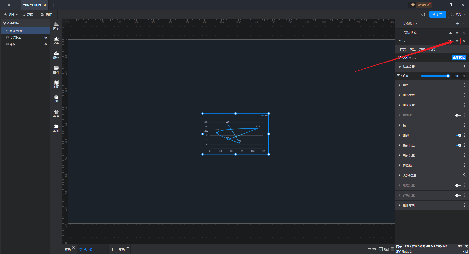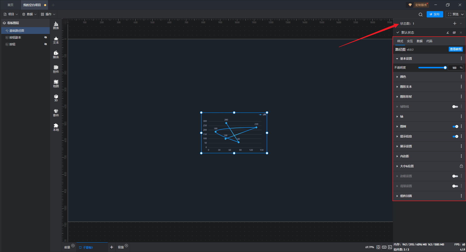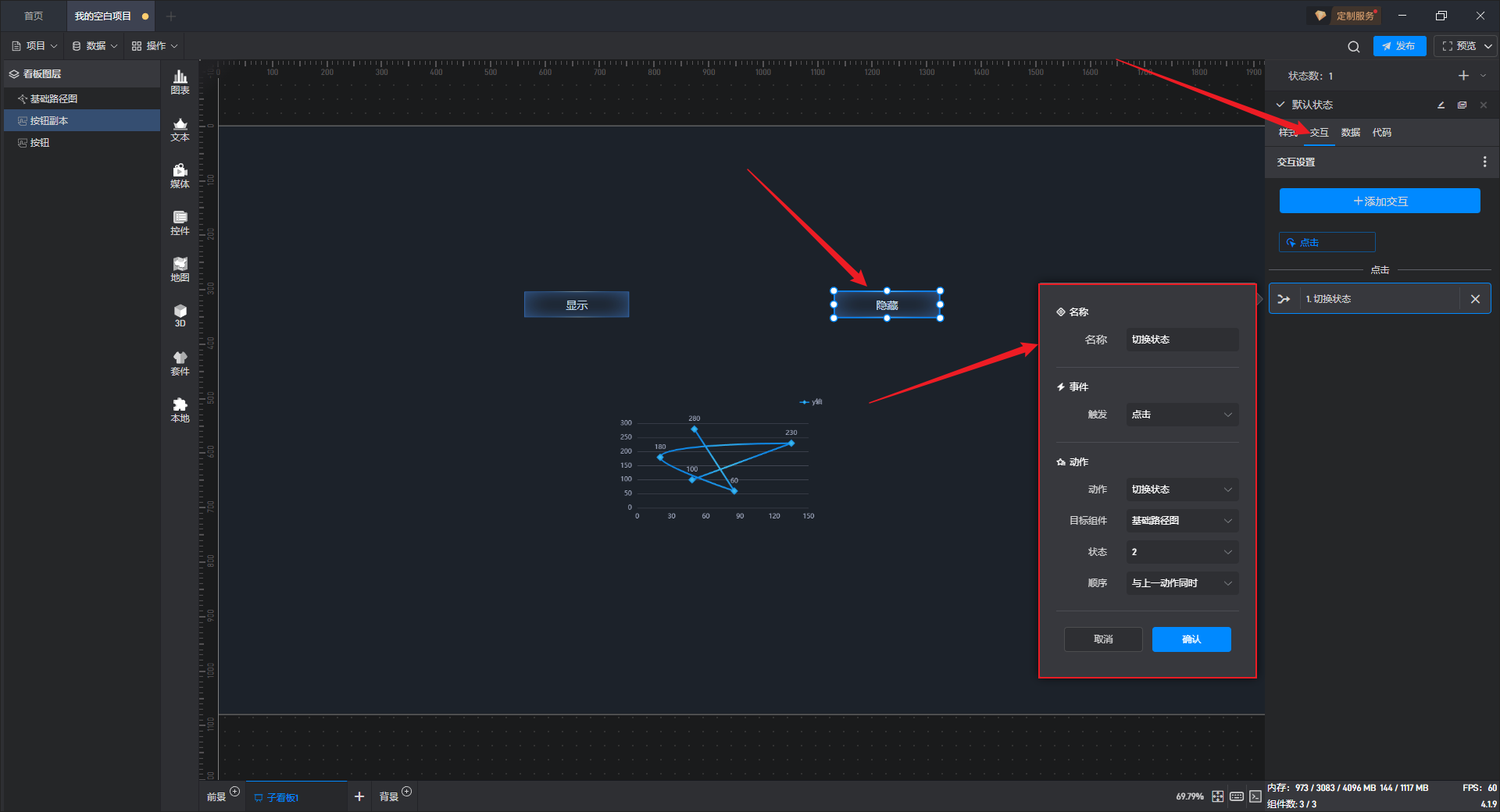 多状态主要用于通过数据条件或是点击交互(通常是点击其他组件来触发本组件的状态切换)来切换组件设置项的场景,这里的设置项包括组件的样式、交互、数据和代码。