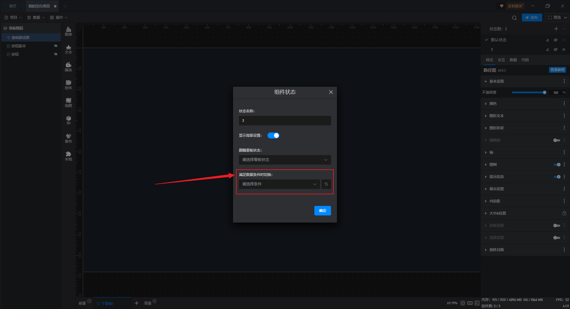 在这里我们可以选择已设置的数据条件,从而在数据条件满足时,组件的状态就会发生变化。