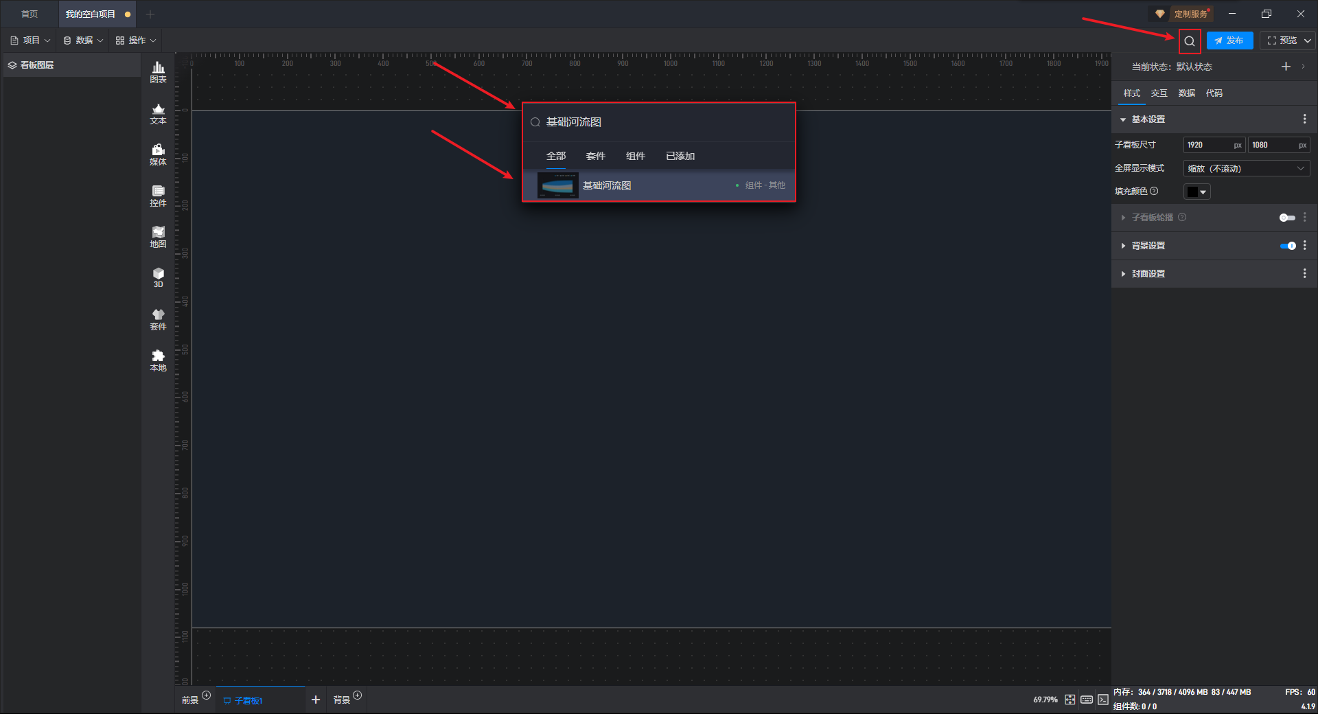 点击搜索按钮或按键盘Ctrl+F打开搜索框,输入组件名称进行搜索,然后点击对应的组件进行添加。