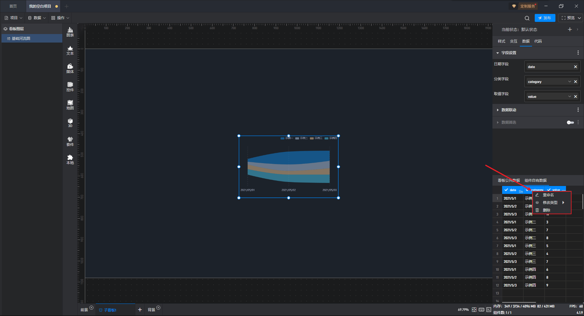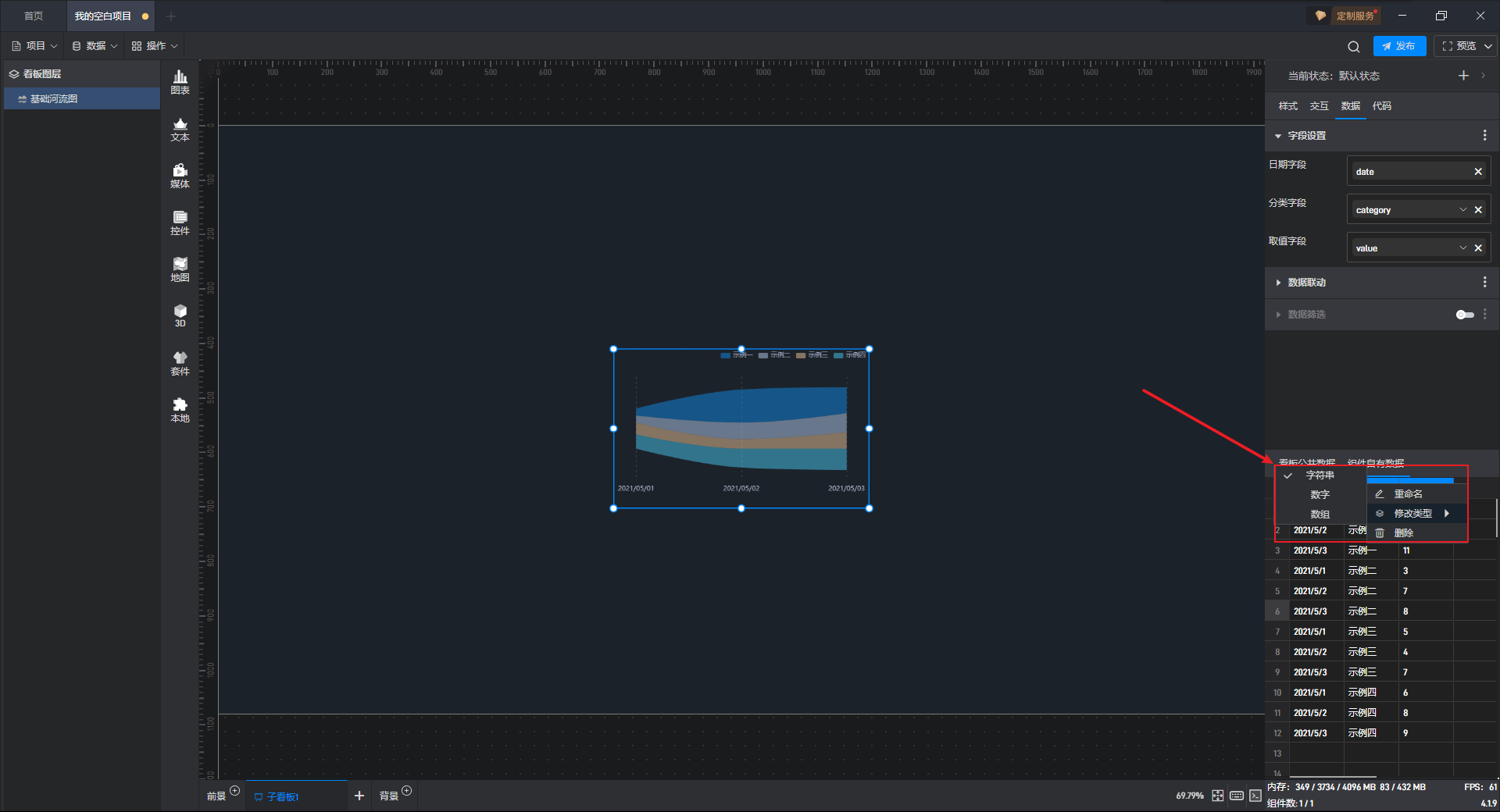 段类型包括:字符串、数字和数组(X 轴字段和系列字段都是字符串类型,Y 轴是数字类型,数组类型用于词云组件),只有在字段类型正确的情况下,组件内容才能正常显示。
