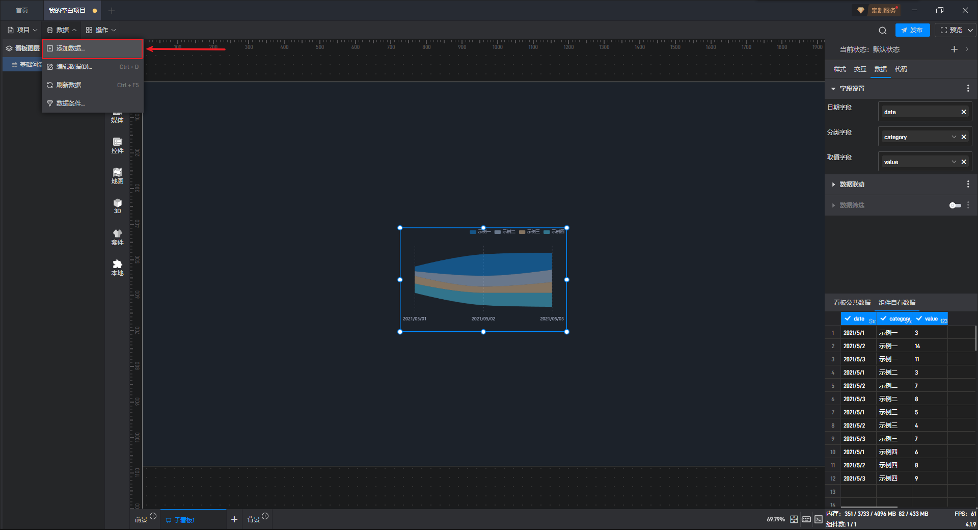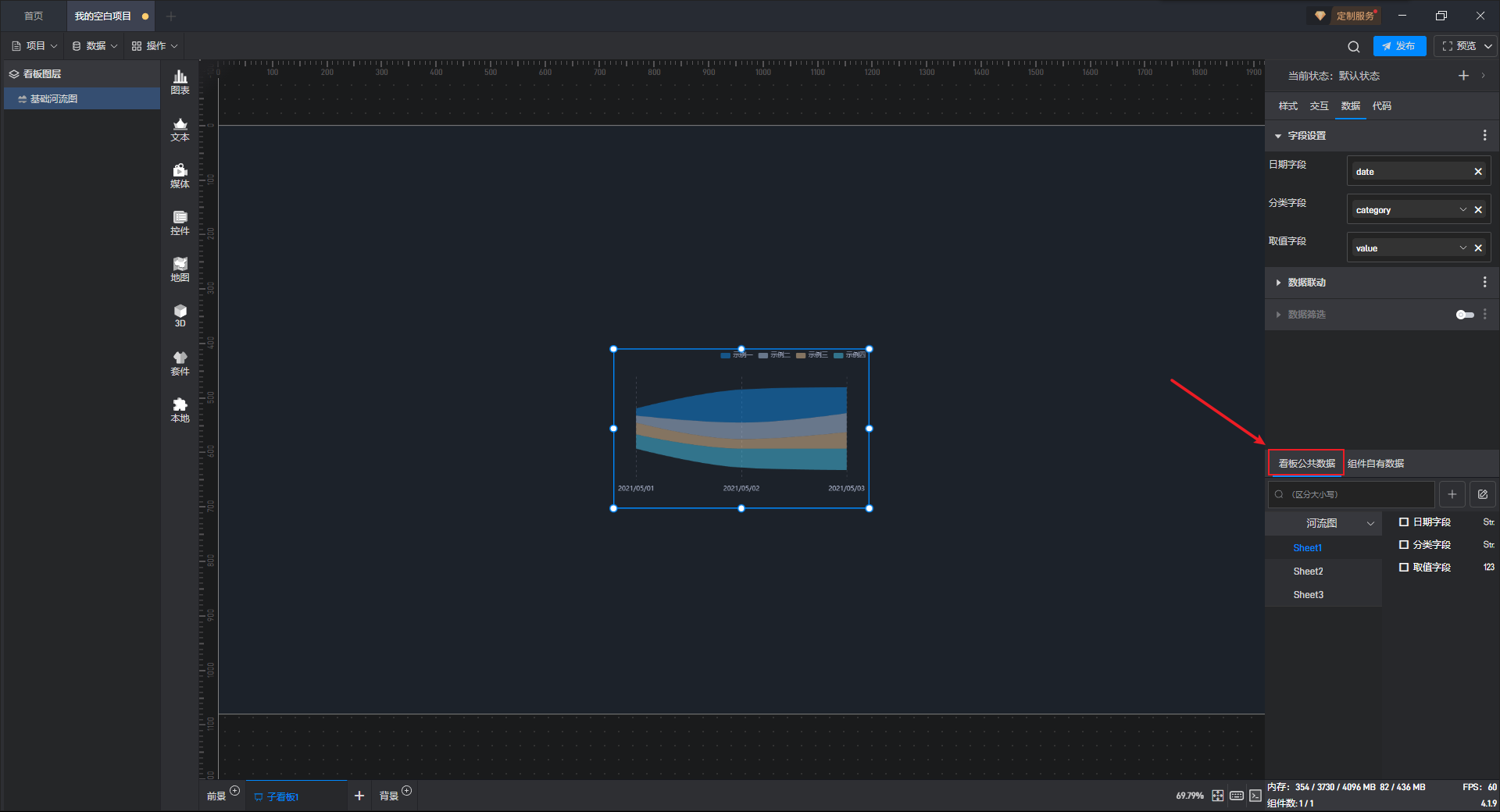 点击选中组件,在右侧“数据”设置窗口中切换到“看板公共数据”(同一个项目中所有数据源是共享的)。