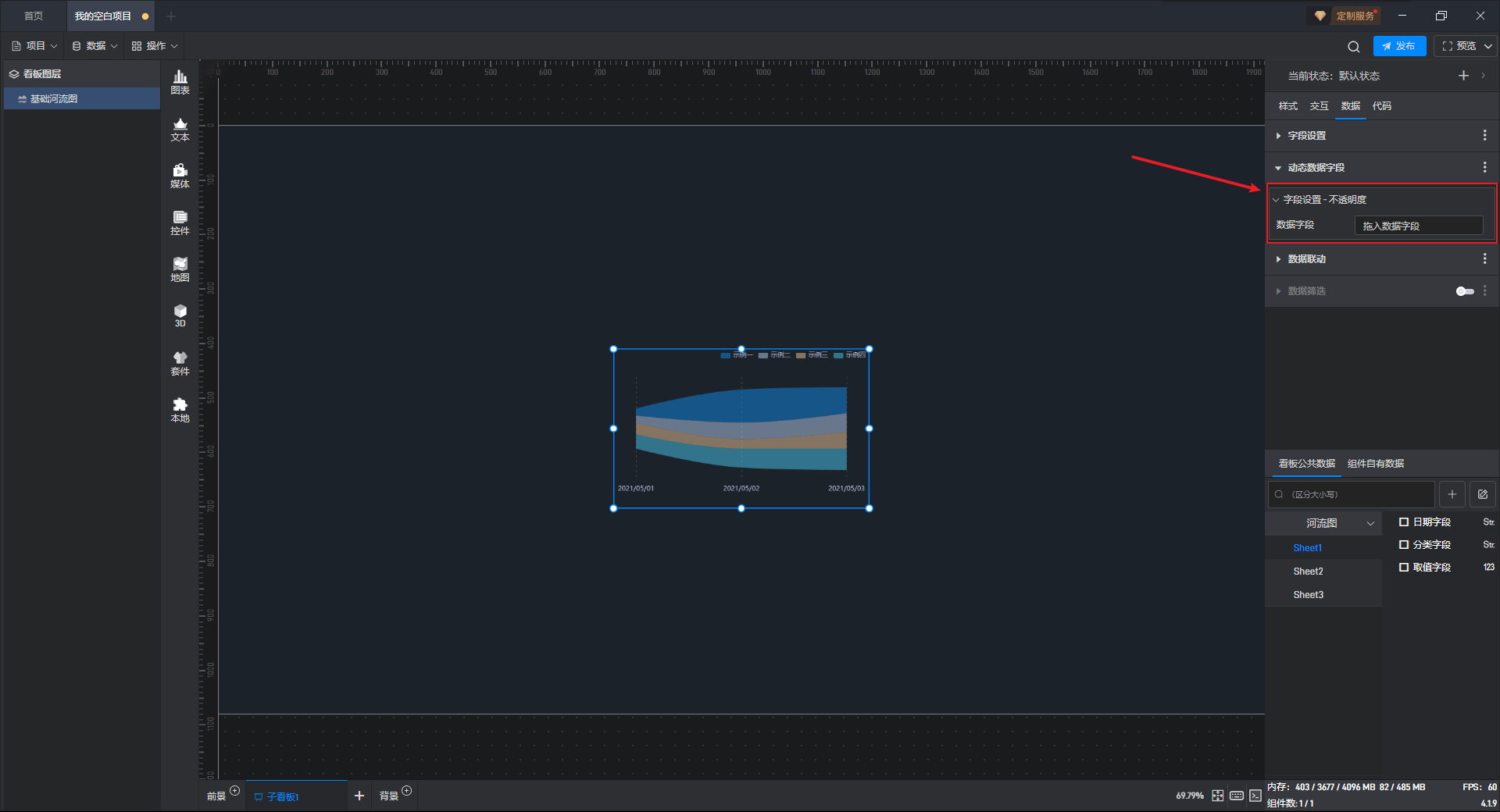 切换到“数据”设置界面,此时可以看到界面中新添加了一个“动态数据字段”的设置项,并且针对刚才选择的“不透明度”设置项生成了一个关联的字段。
