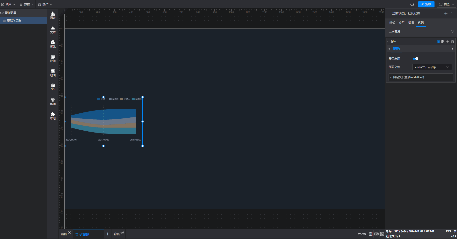 点击选中组件,在右侧设置窗口中切换到“代码”,可以对组件进行二次开发设置。