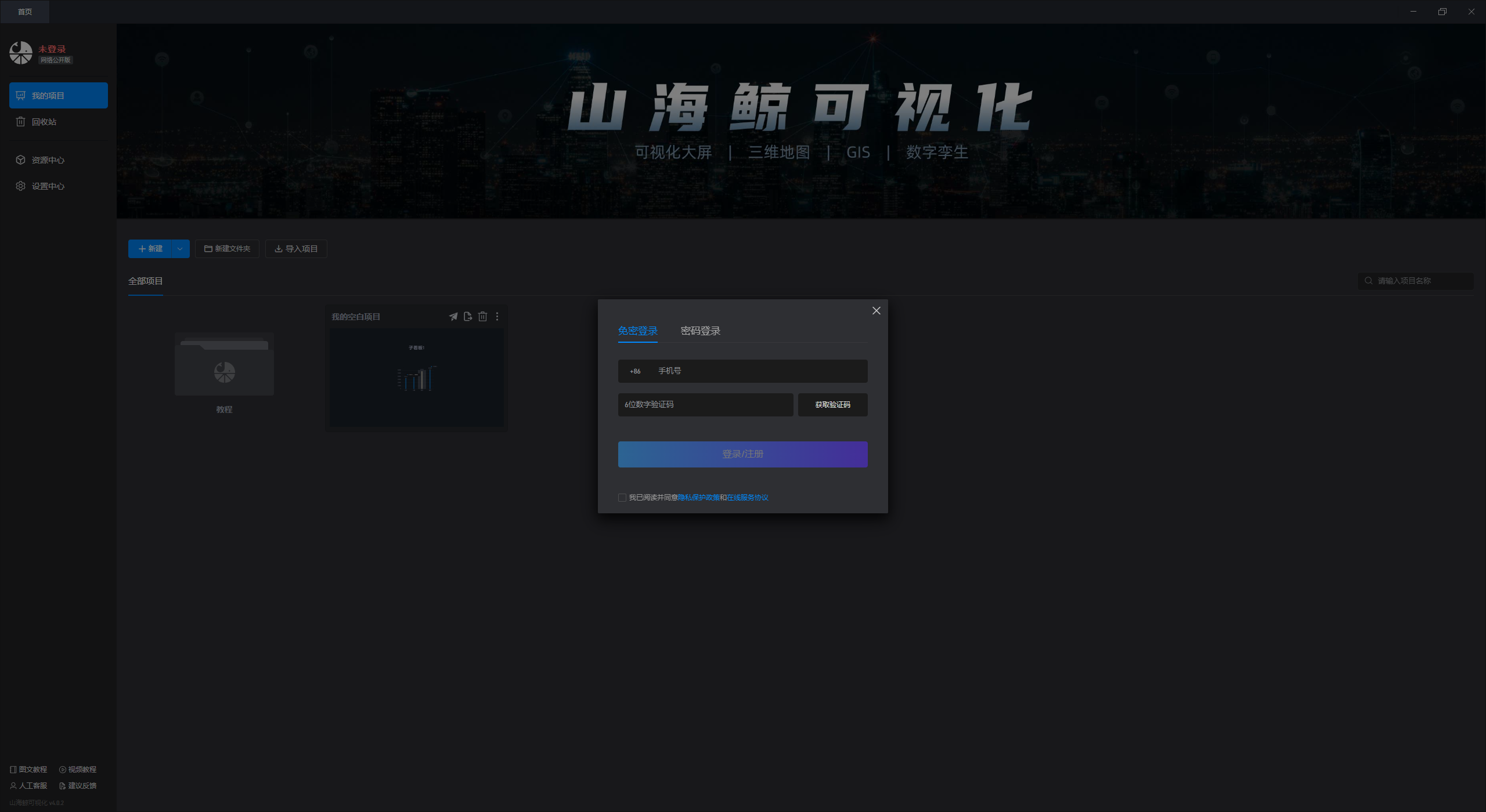 山海鲸可视化启动后的会自动弹出登录窗口,您可以在这里进行注册和登录操作。