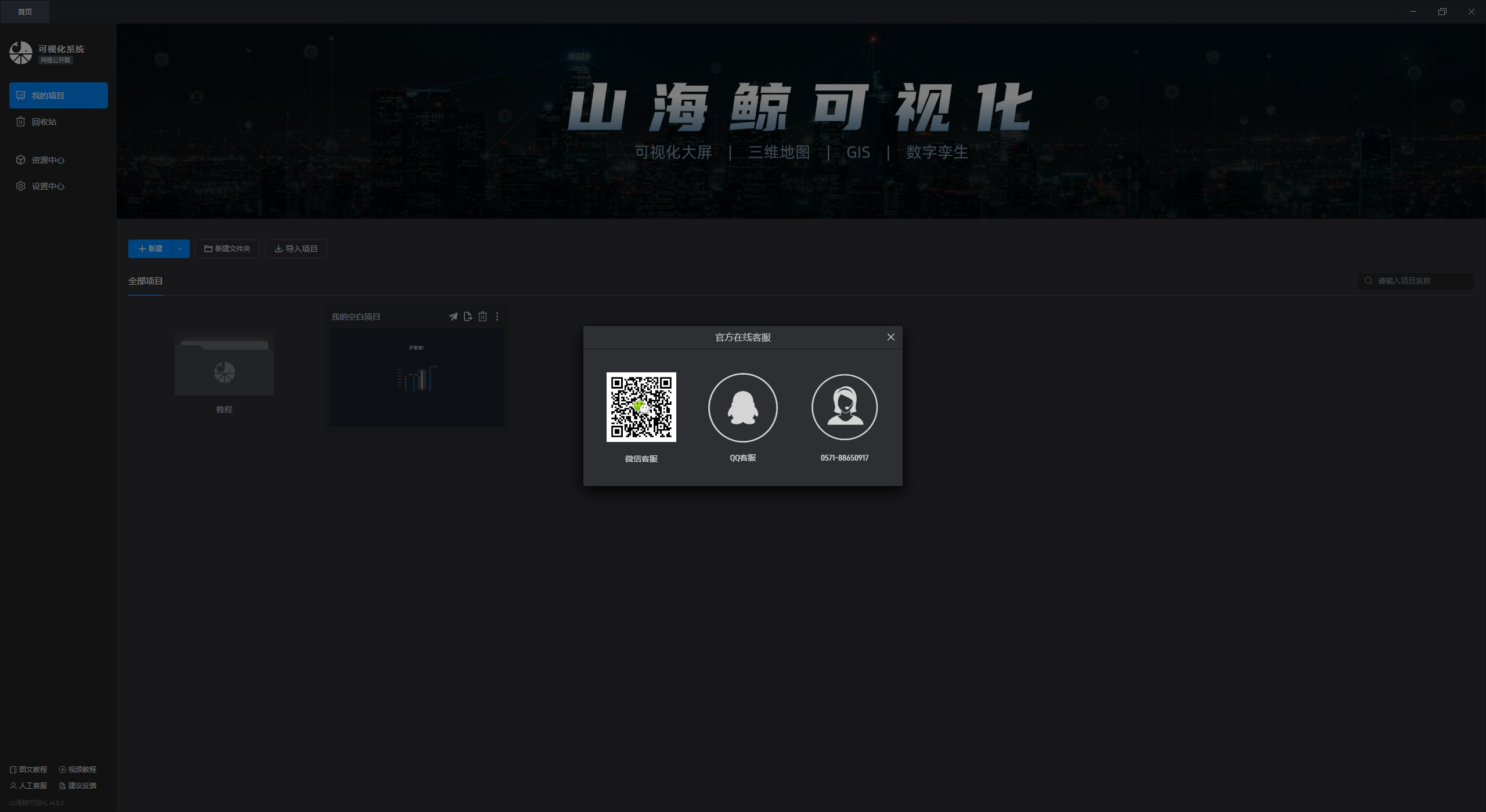 山海鲸可视化内置了丰富的大屏模板,点击左侧的“资源中心”可以看到详细内容。