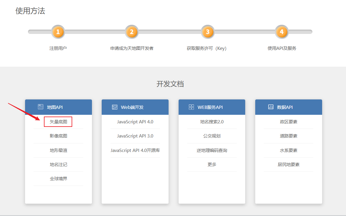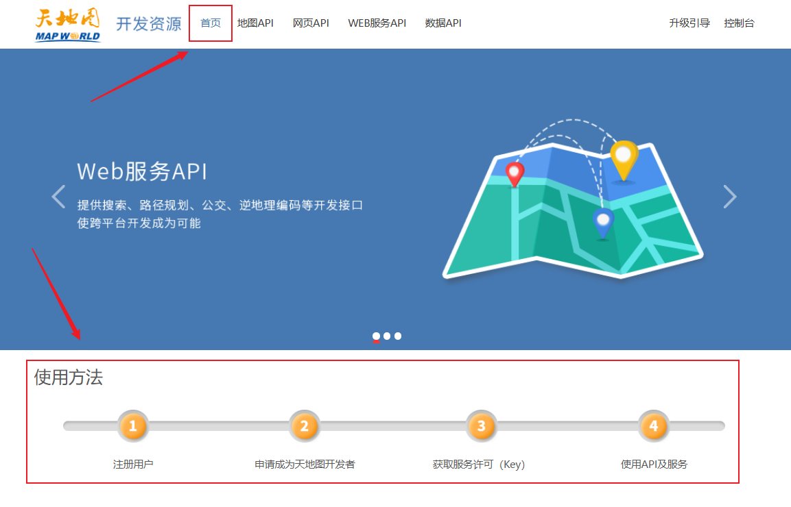 1)在天地图官网首页,按照“使用方法”中的步骤获取服务许可(key)。(参考教程:如何申请天地图 Key)