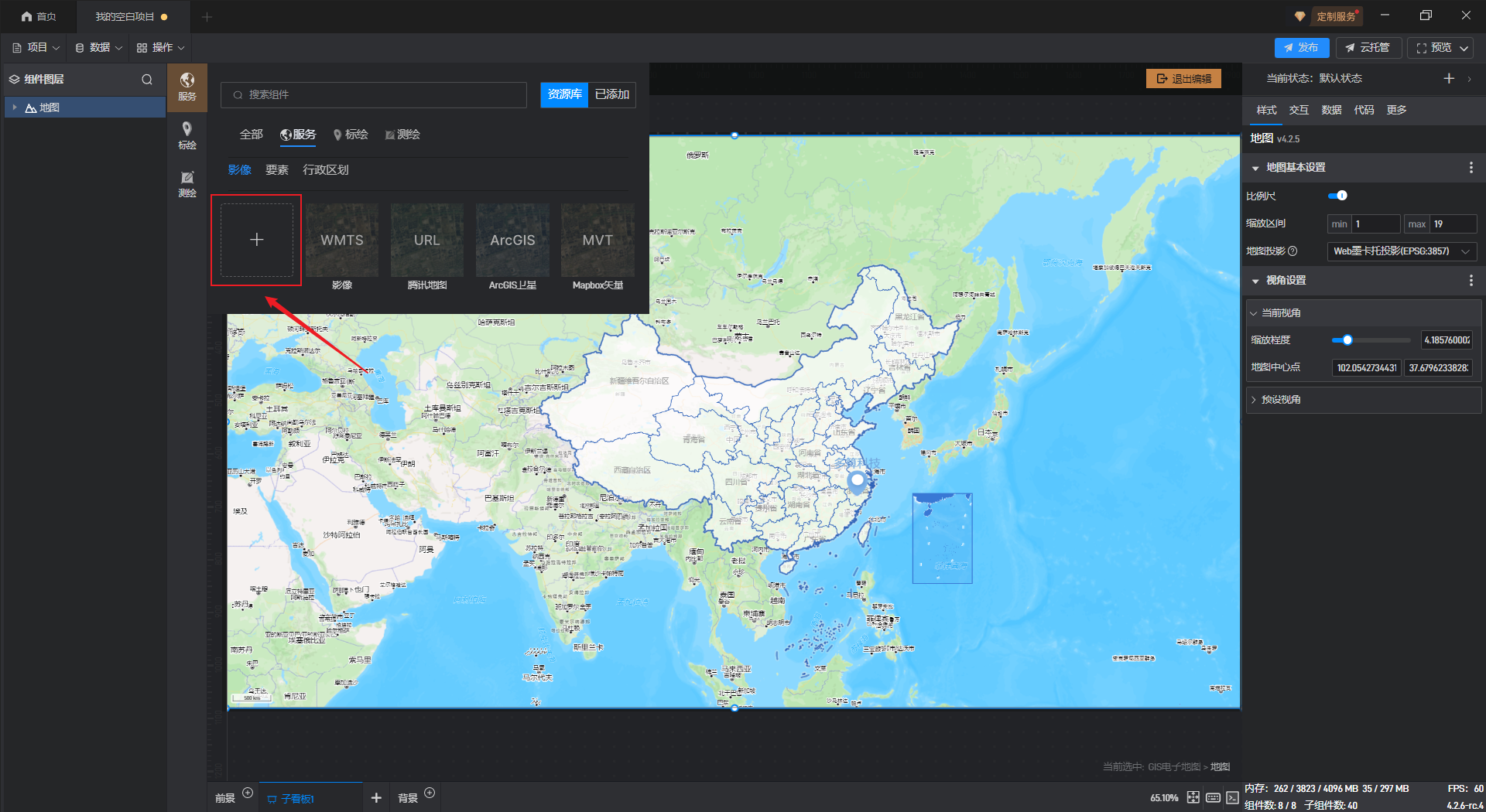 1)双击进入鲸地图编辑模式后,在“服务”菜单中点击“+”添加影像。