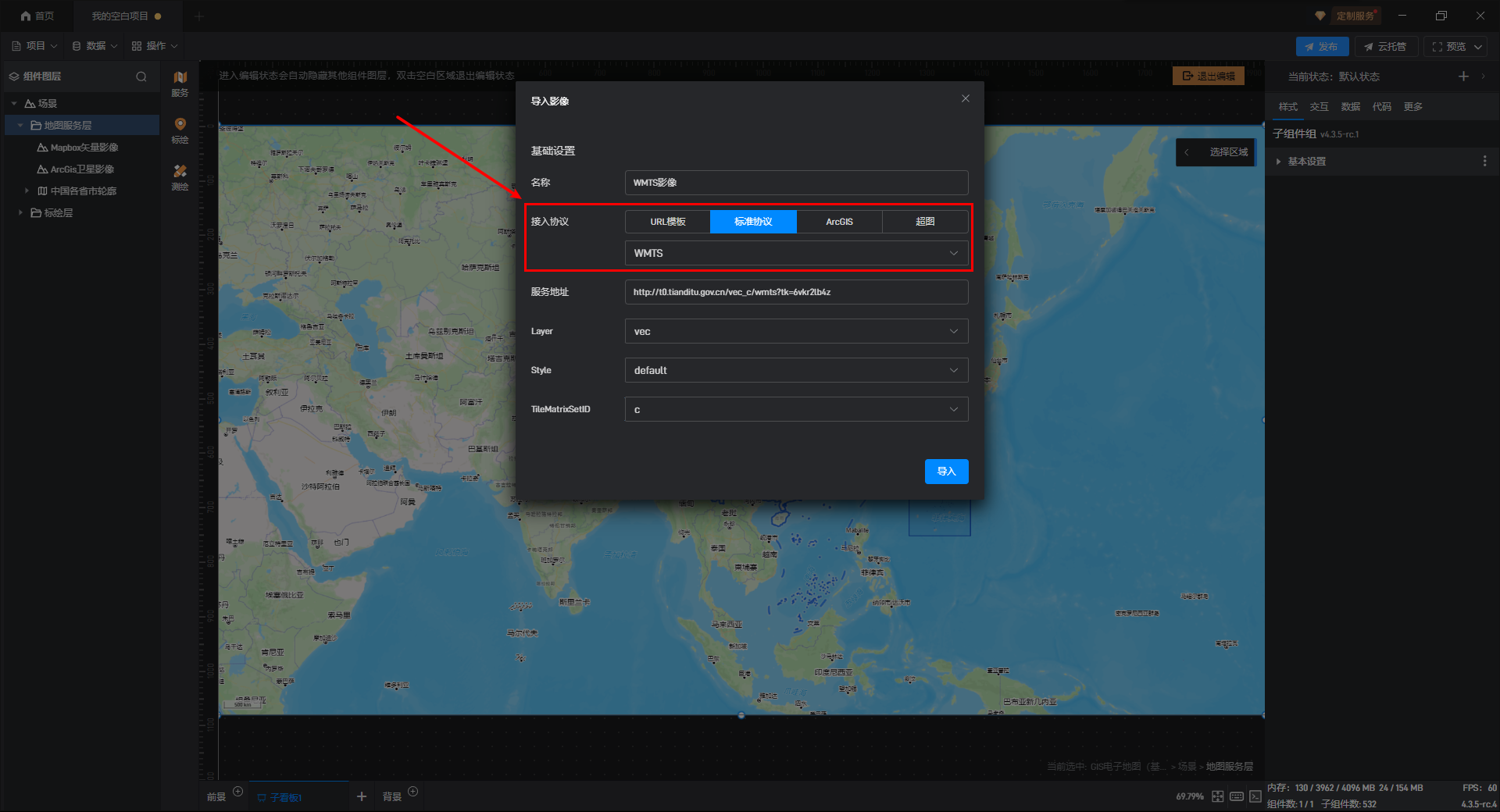 2)在“导入影像”页面中,将接入协议切换为“标准协议-WMTS”,再将新的服务地址粘贴至框中,对Layer、Style、TileMatrixSetID选项进行补充后点击“导入”。