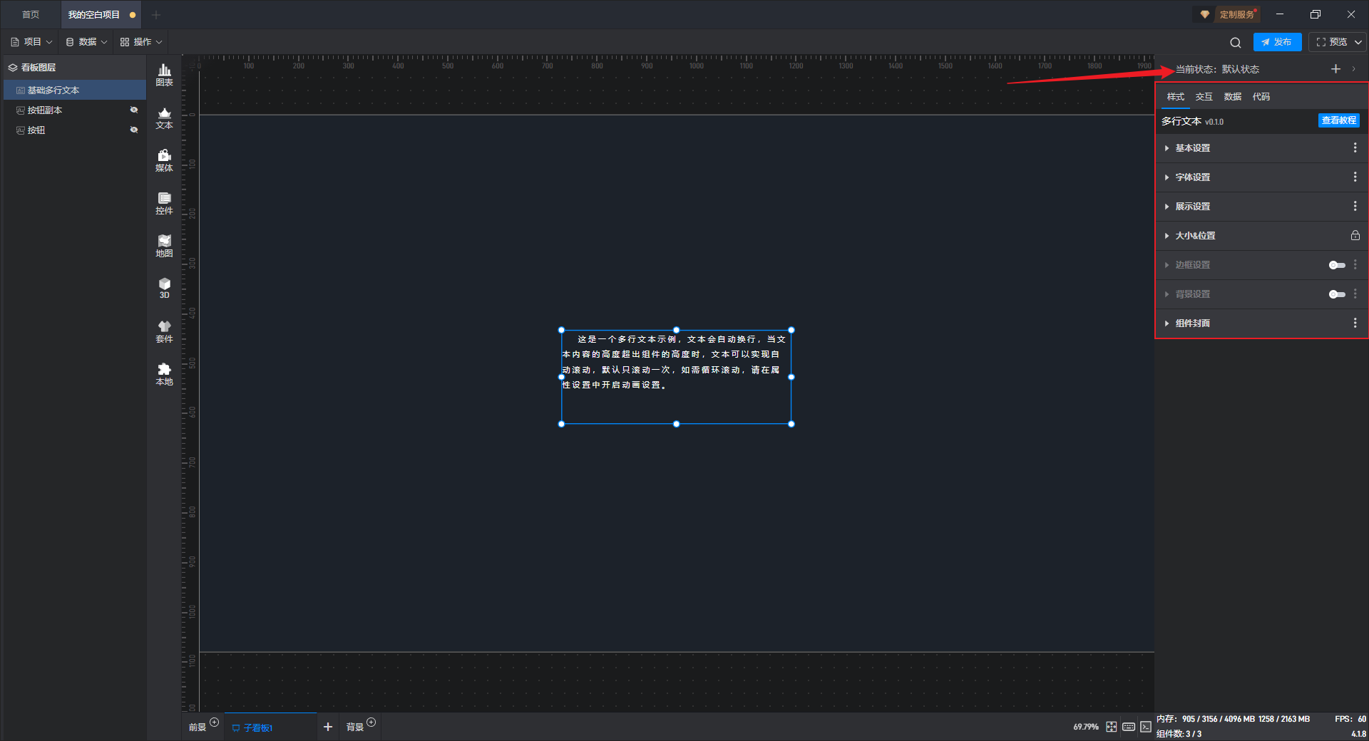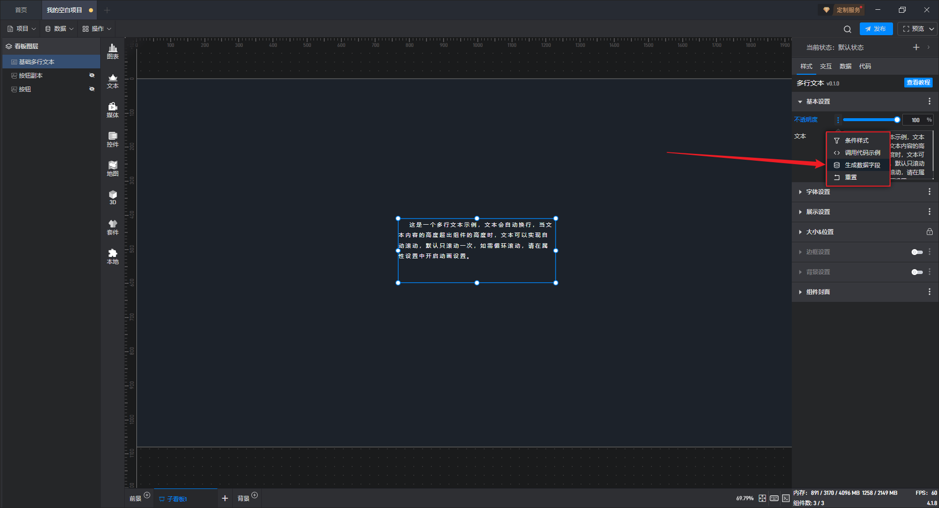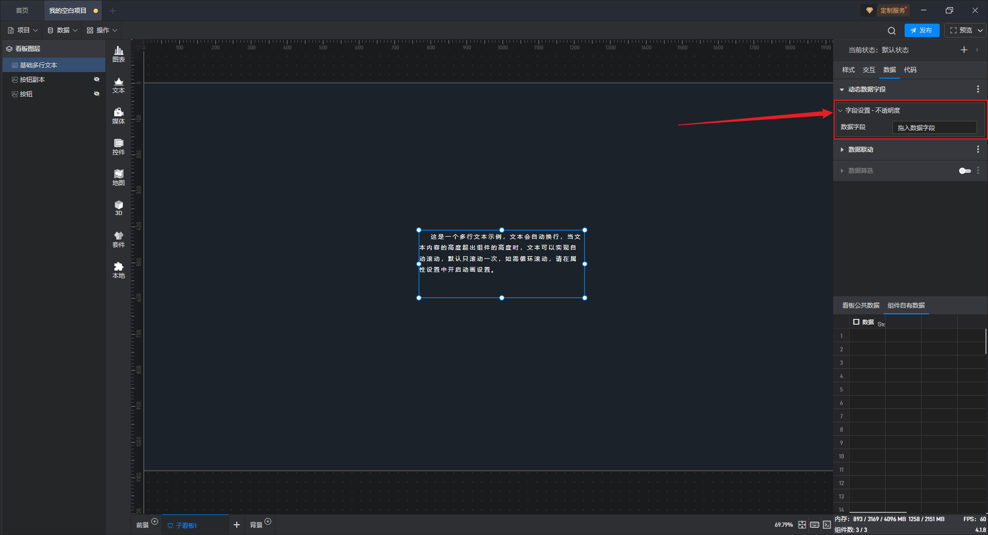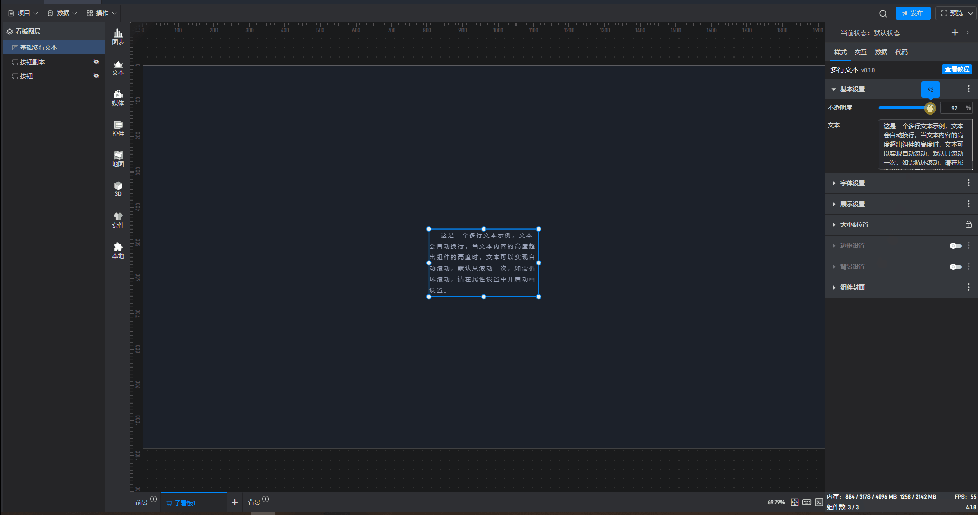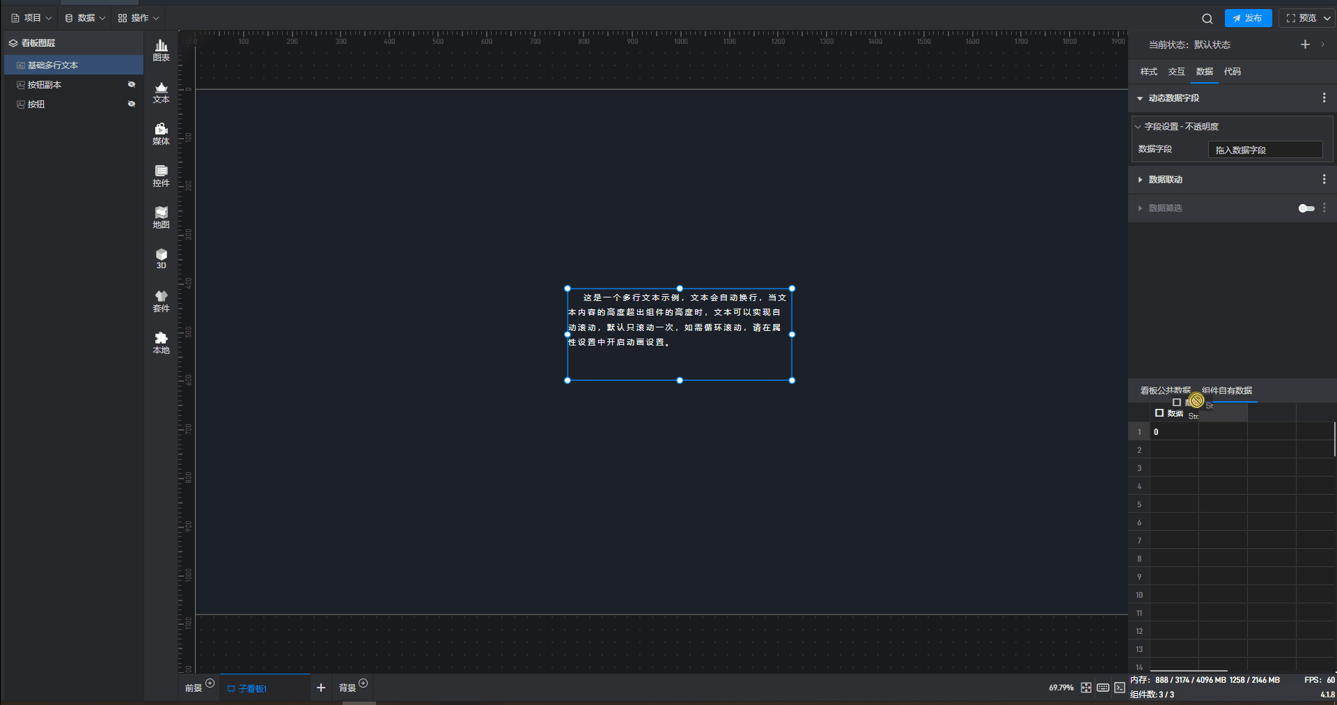 基础多行文本组件默认显示示例文本,可直接进行编辑,无需勾选数据字段。
