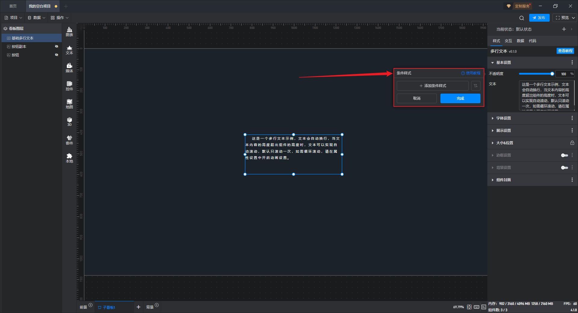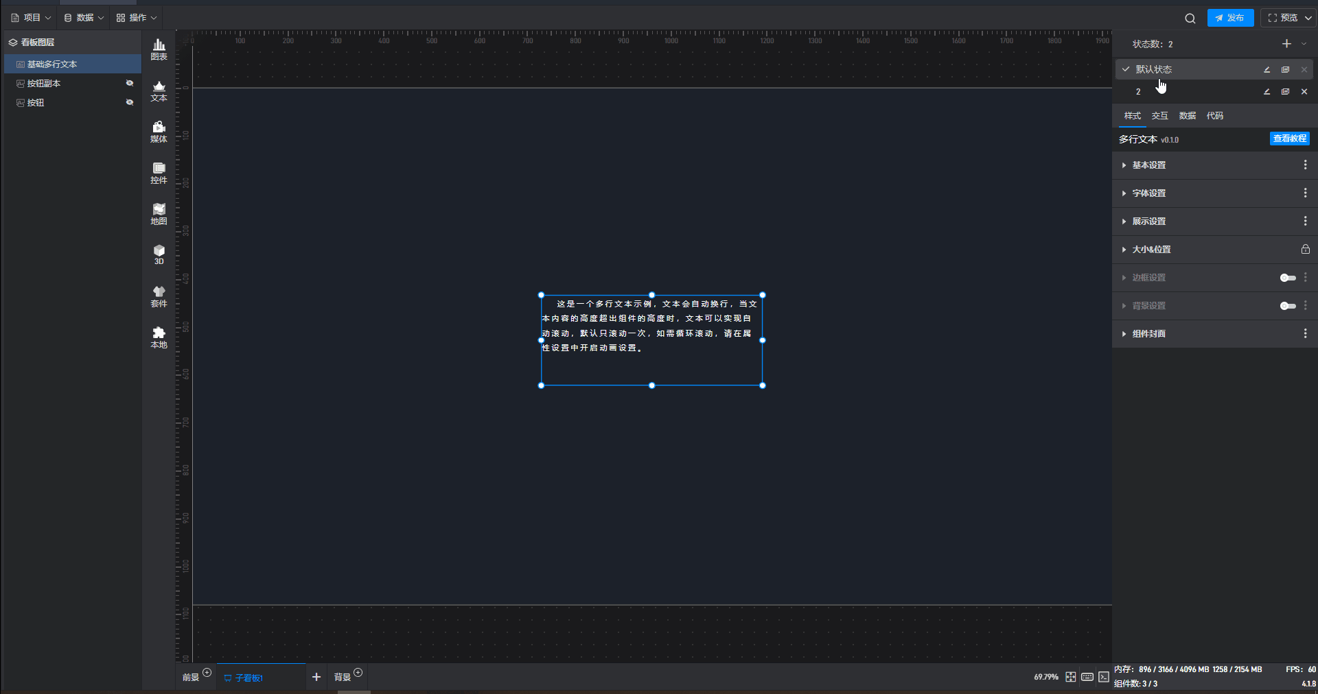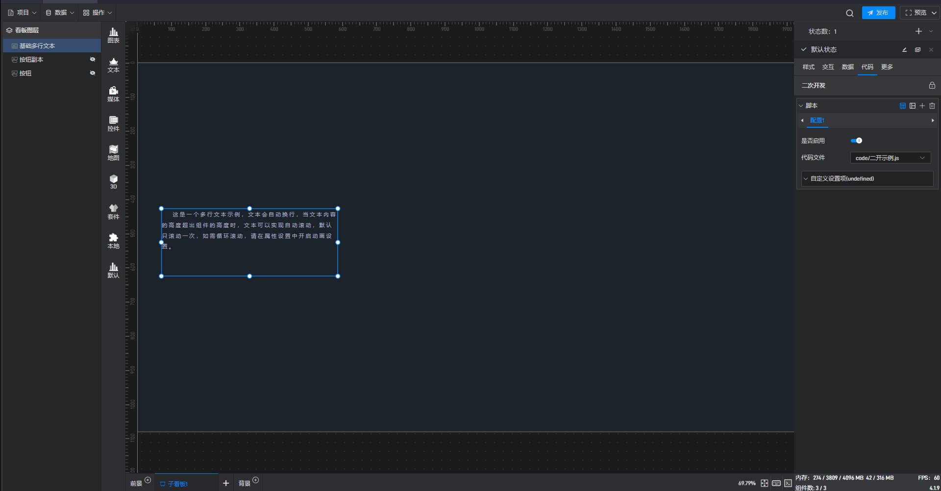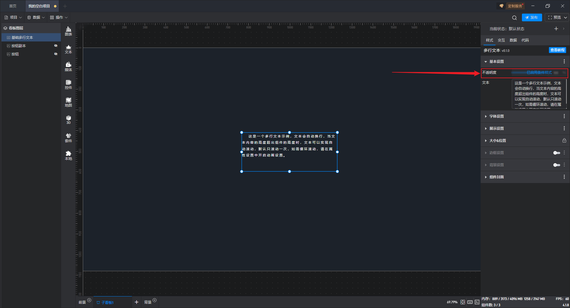 基础多行文本组件默认显示示例文本,可直接进行编辑,无需勾选数据字段。