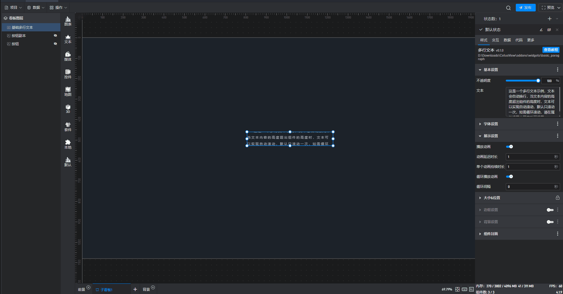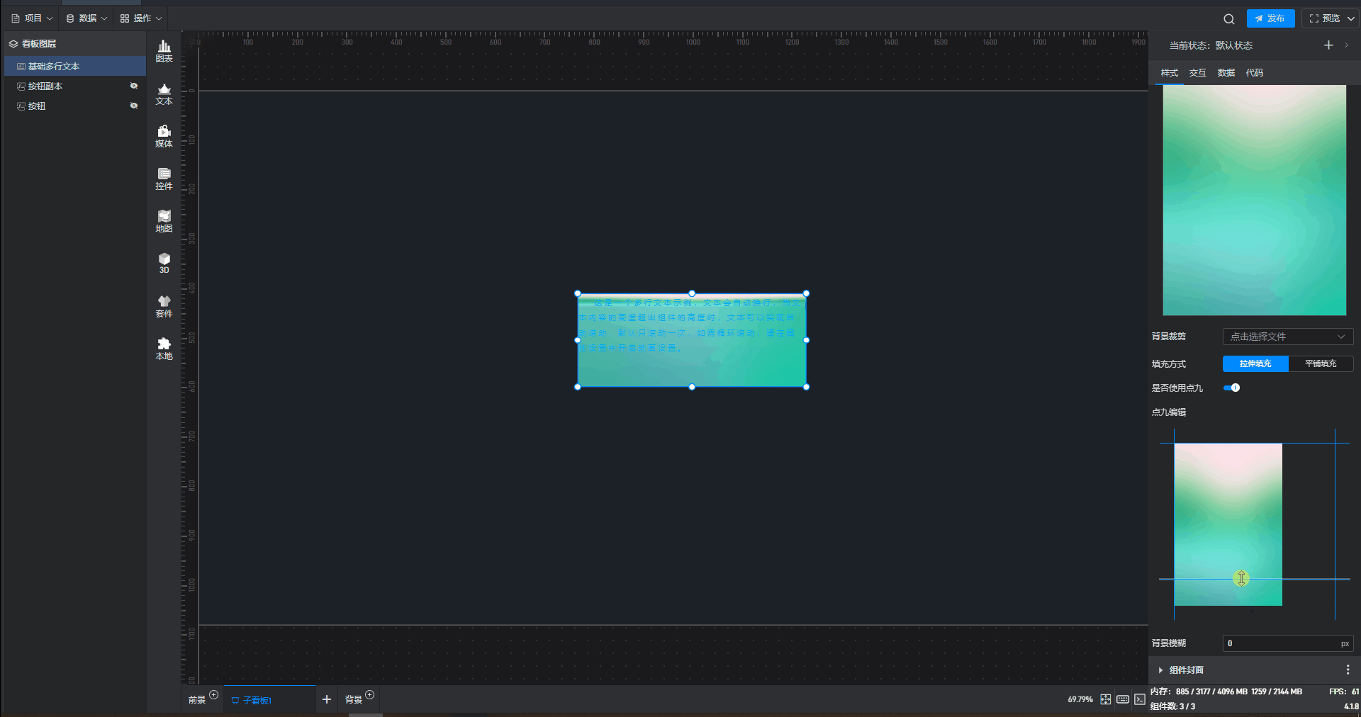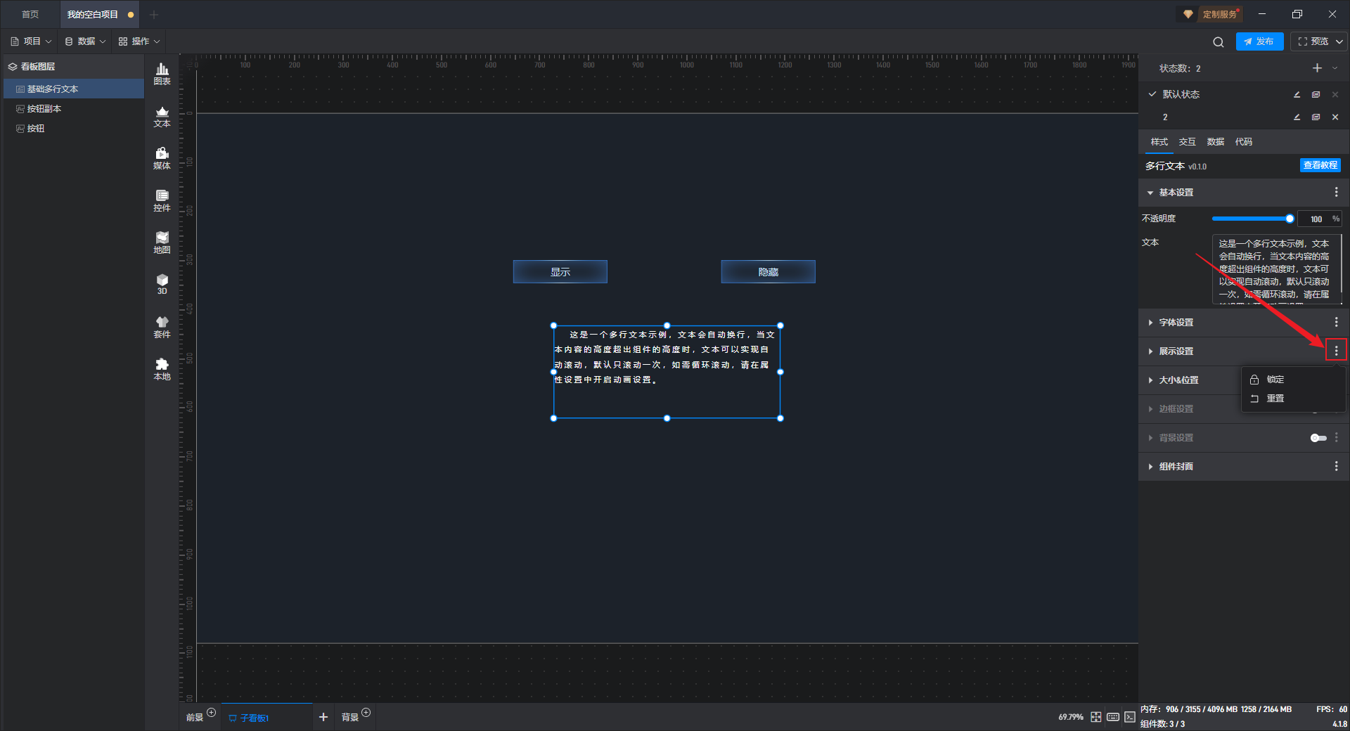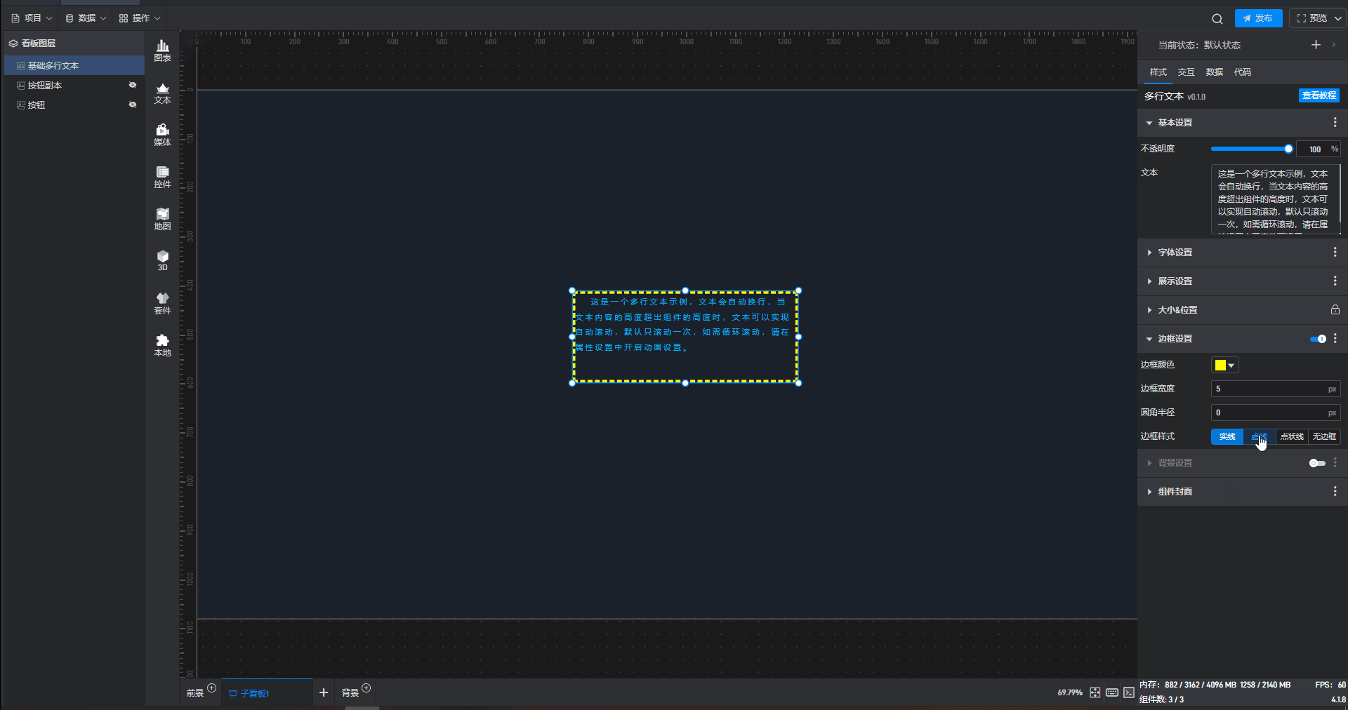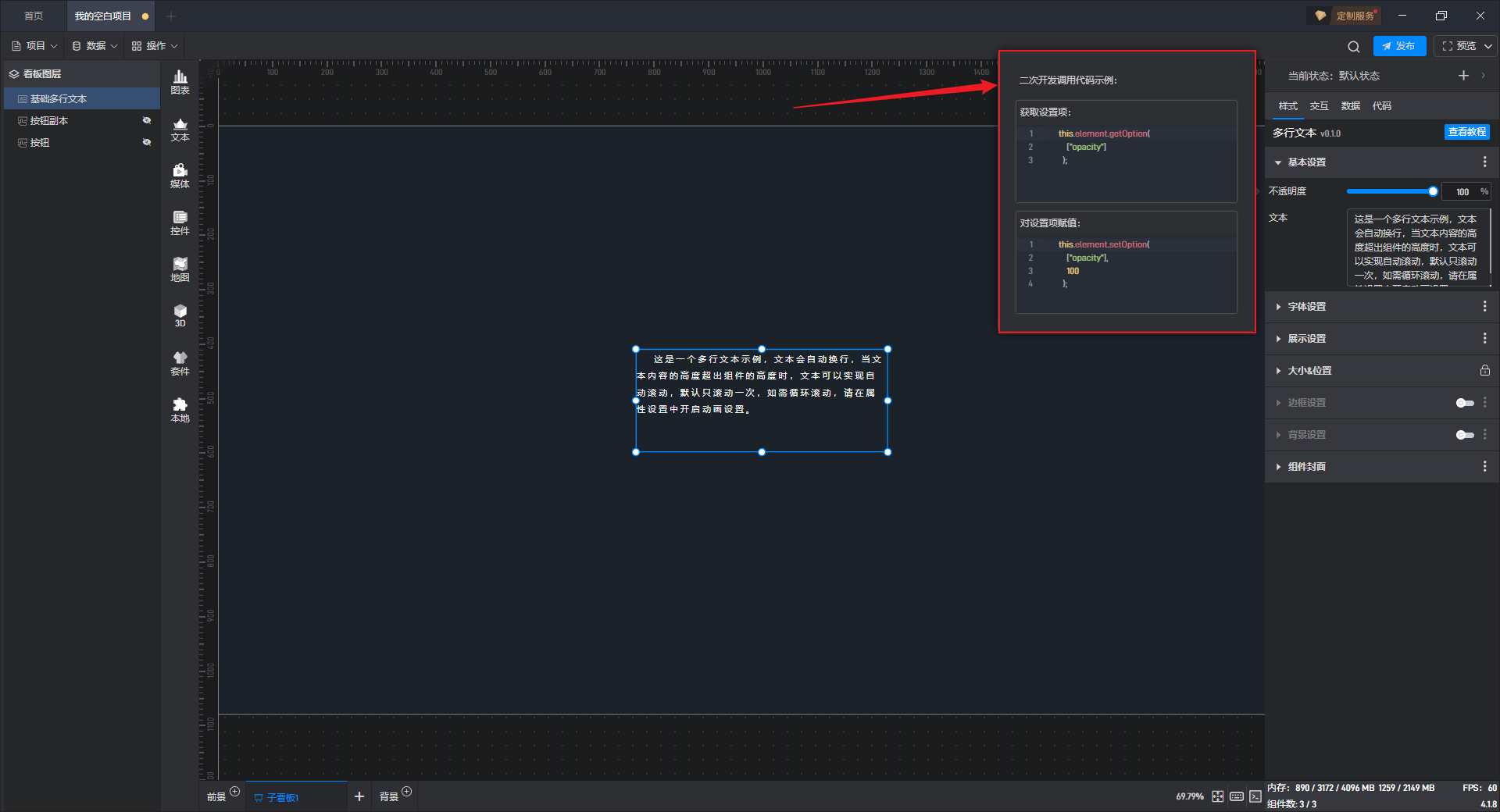 基础多行文本组件默认显示示例文本,可直接进行编辑,无需勾选数据字段。