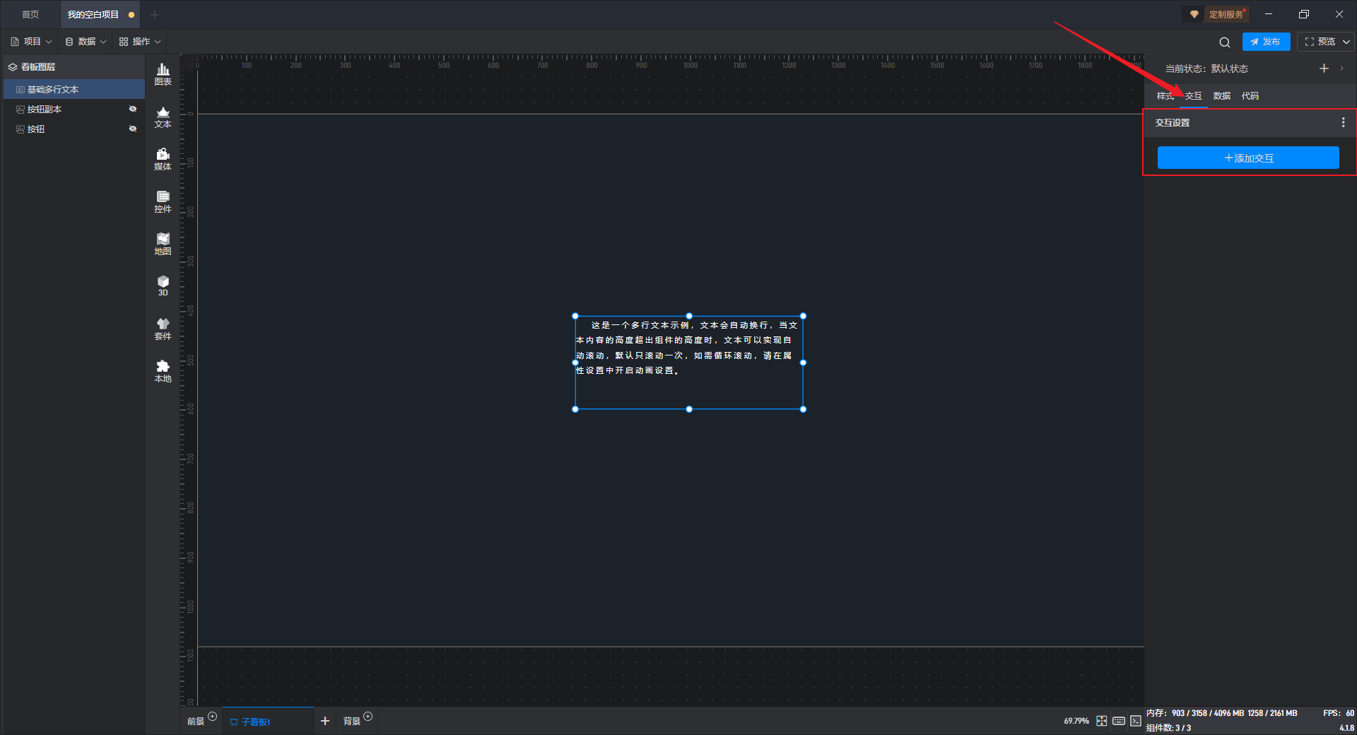 点击选中组件,在右侧“交互”设置窗口中可以对当前组件的交互进行添加和删除。