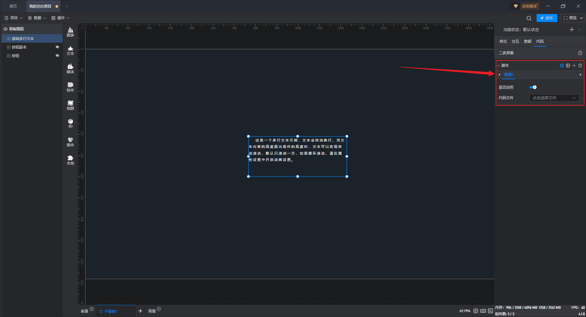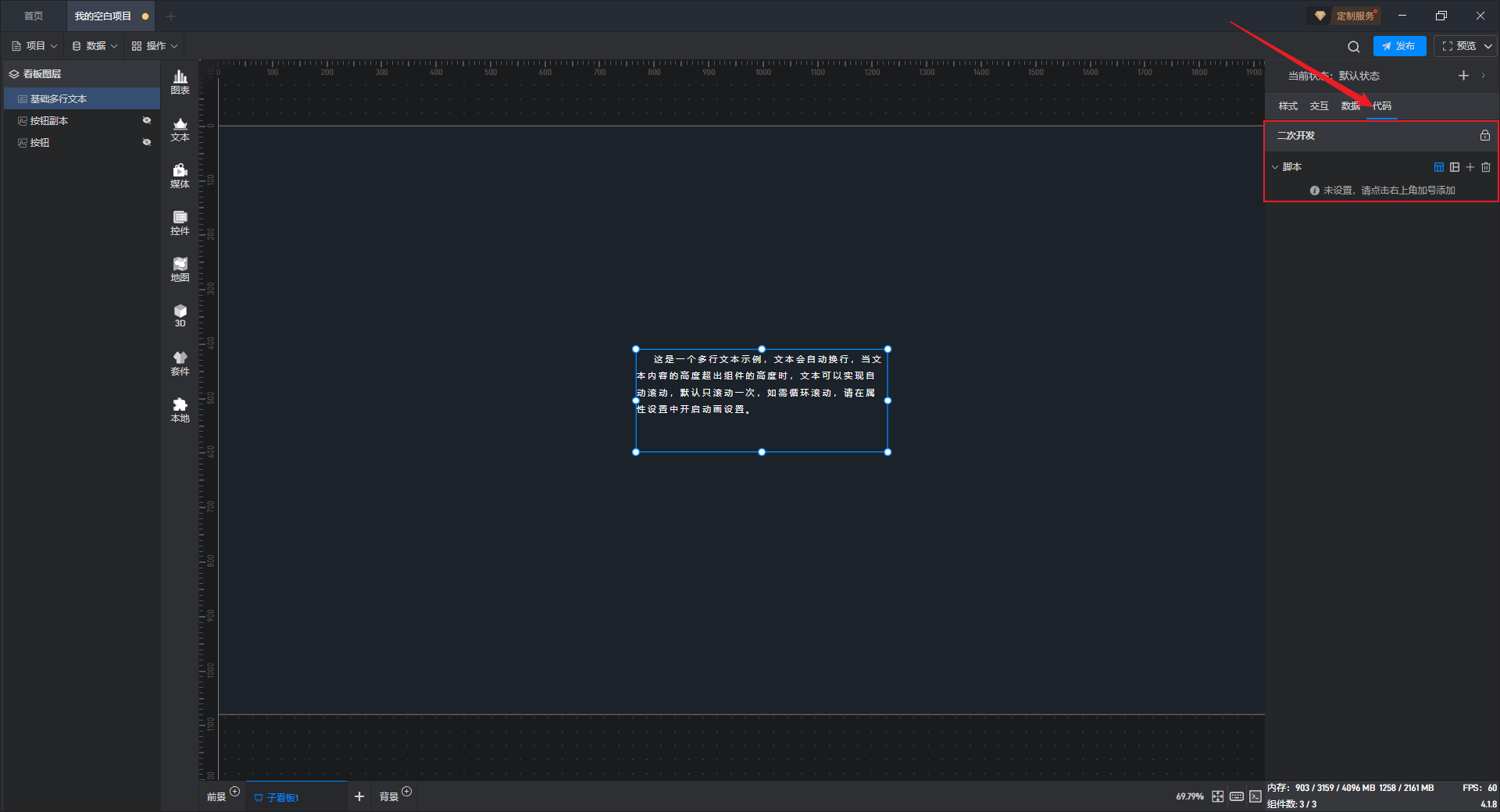 点击选中组件,在右侧“代码”设置窗口中可以对组件进行二次开发设置。