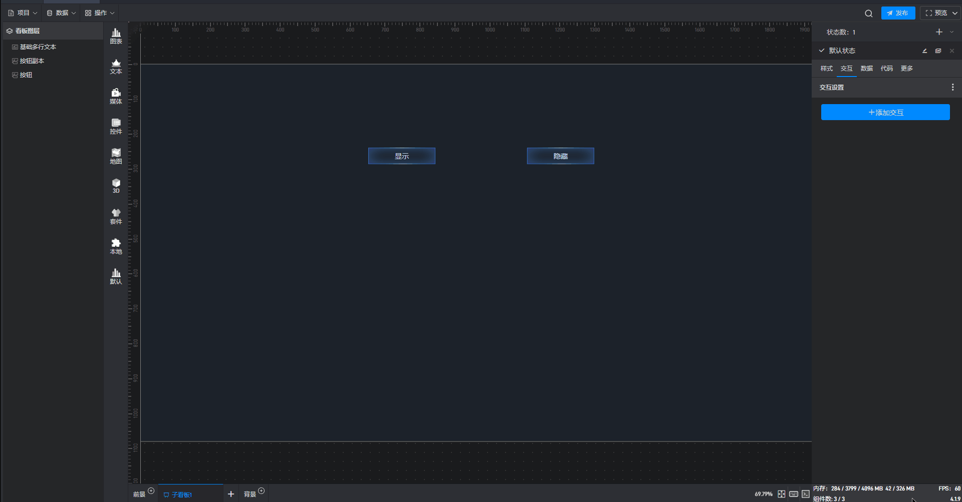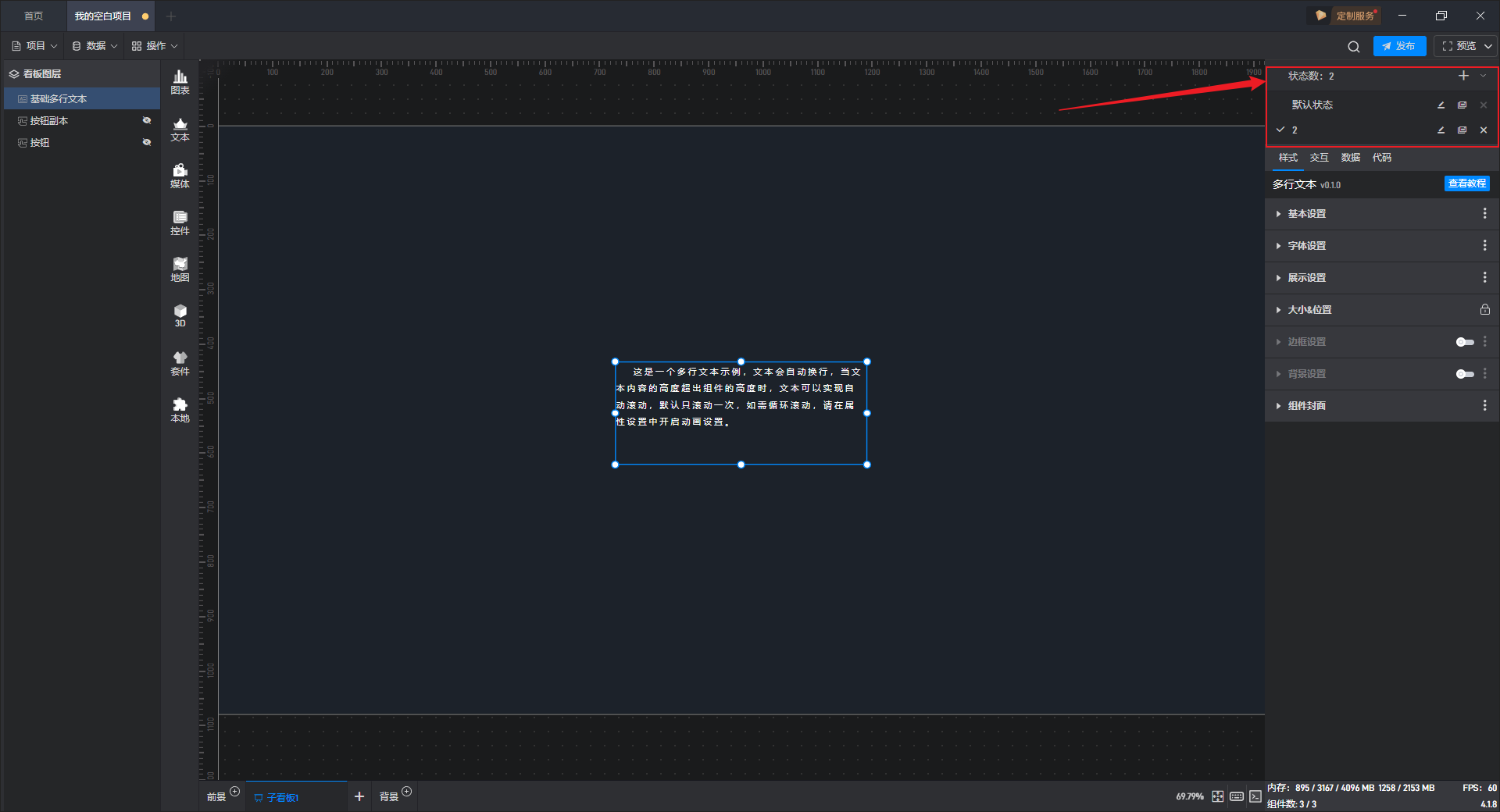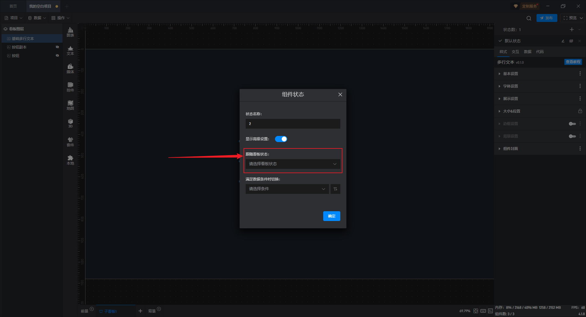 多状态主要用于通过数据条件或是点击交互(通常是点击其他组件来触发本组件的状态切换)来切换组件设置项的场景,这里的设置项包括组件的样式、交互、数据和代码。