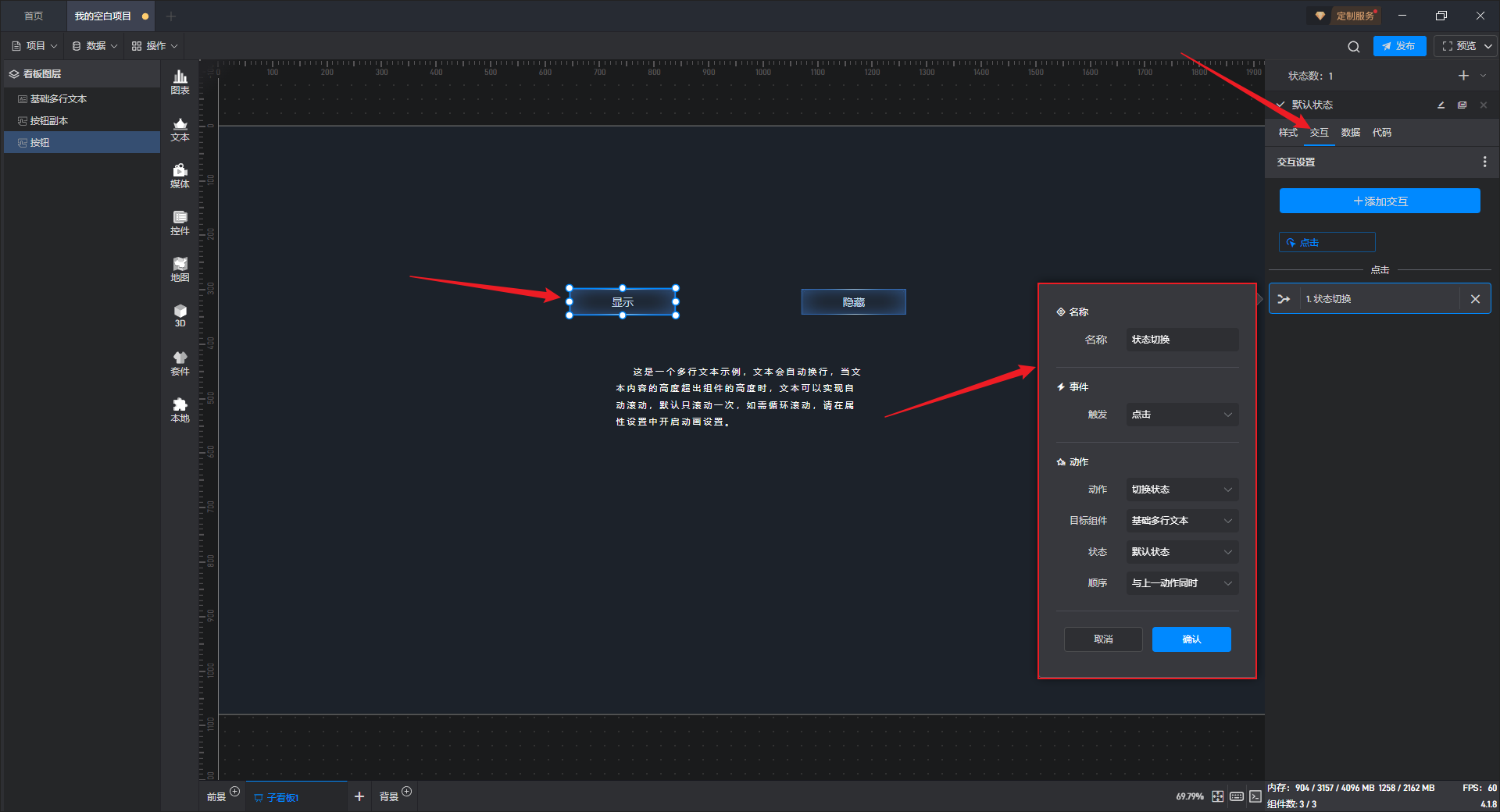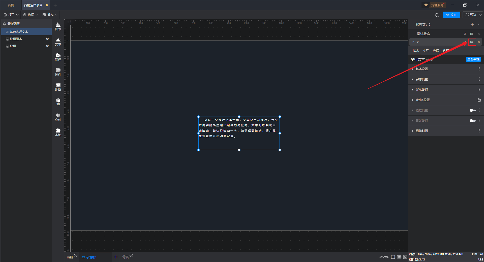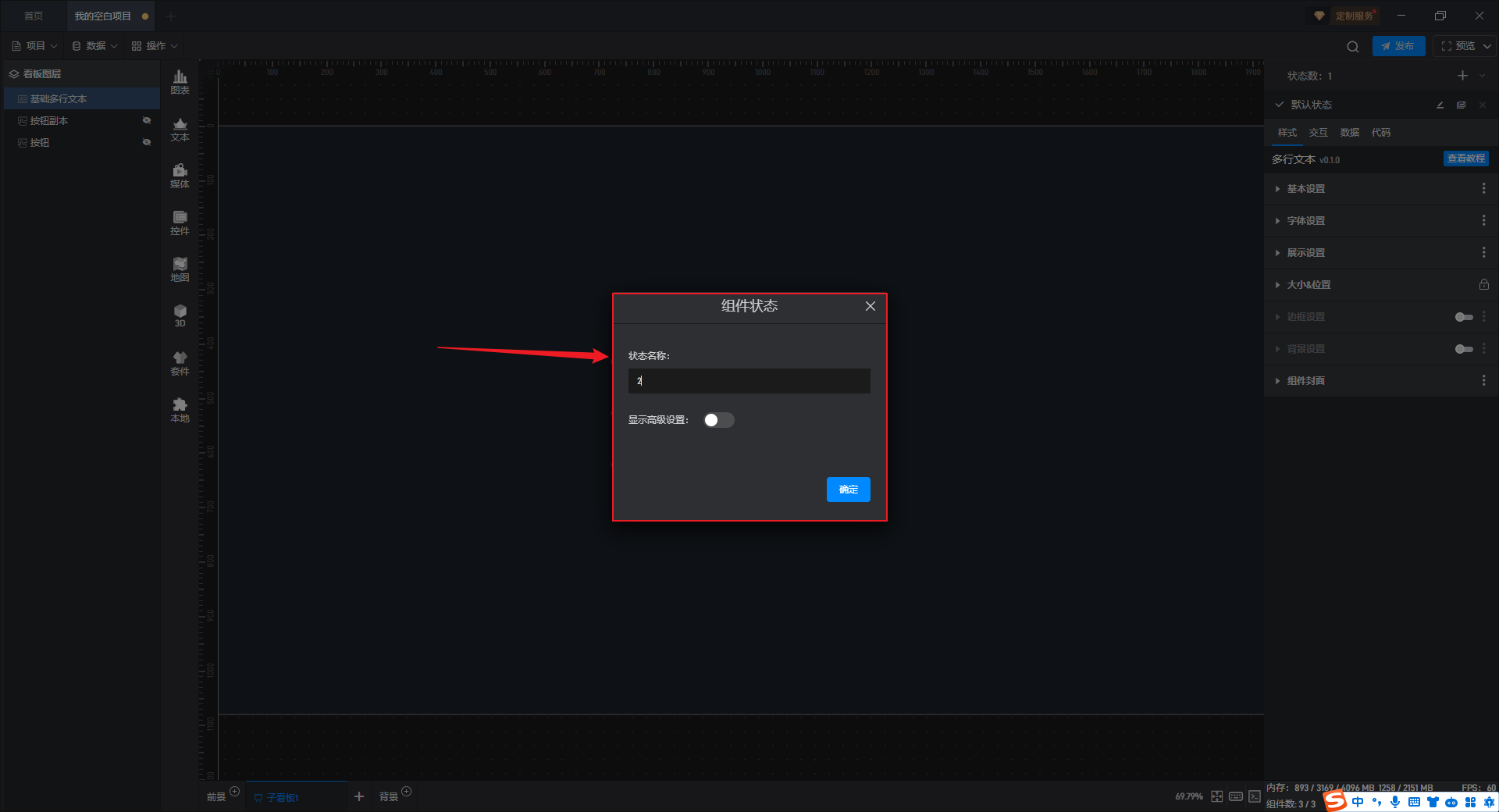 多状态主要用于通过数据条件或是点击交互(通常是点击其他组件来触发本组件的状态切换)来切换组件设置项的场景,这里的设置项包括组件的样式、交互、数据和代码。