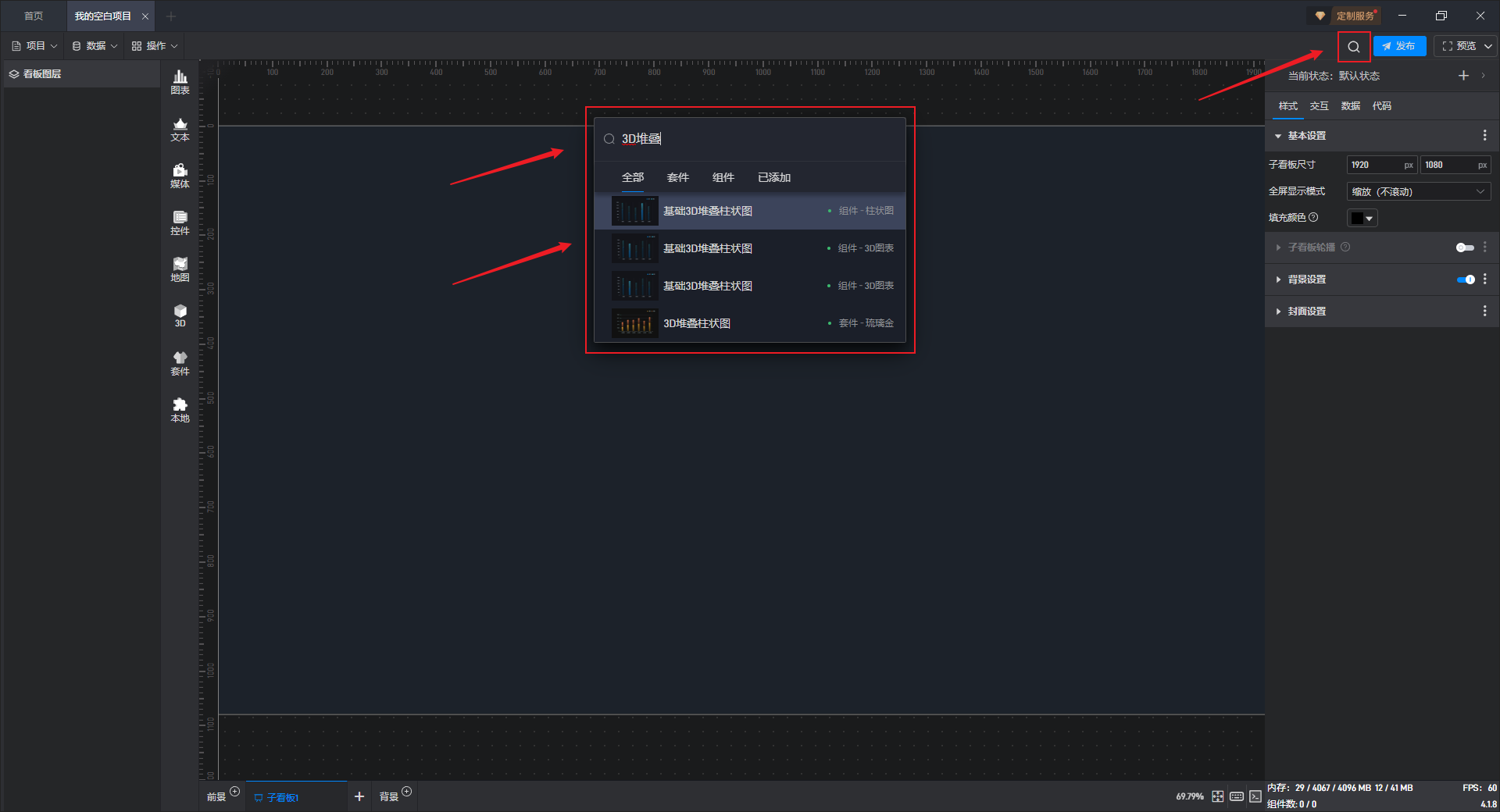 点击搜索按钮或按键盘“Ctrl+F”键打开搜索框,输入组件名称进行搜索,然后点击对应的组件进行添加。