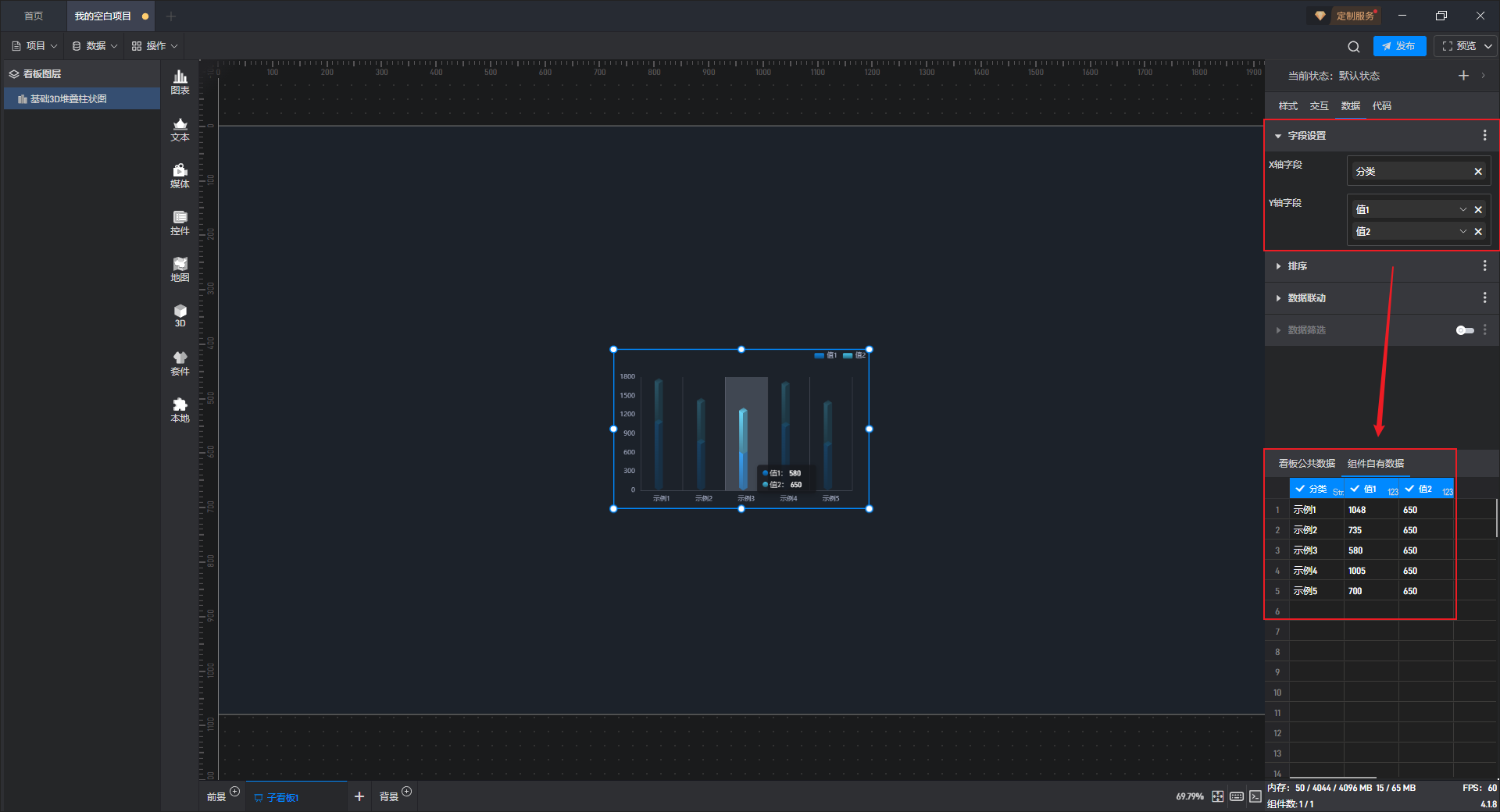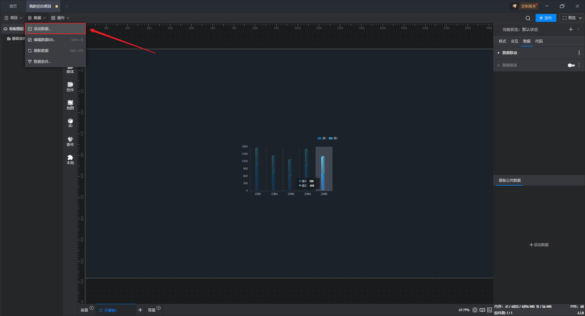 点击选中组件,在右侧“数据”设置窗口中切换到“看板公共数据”(同一个项目中所有数据源是共享的)。