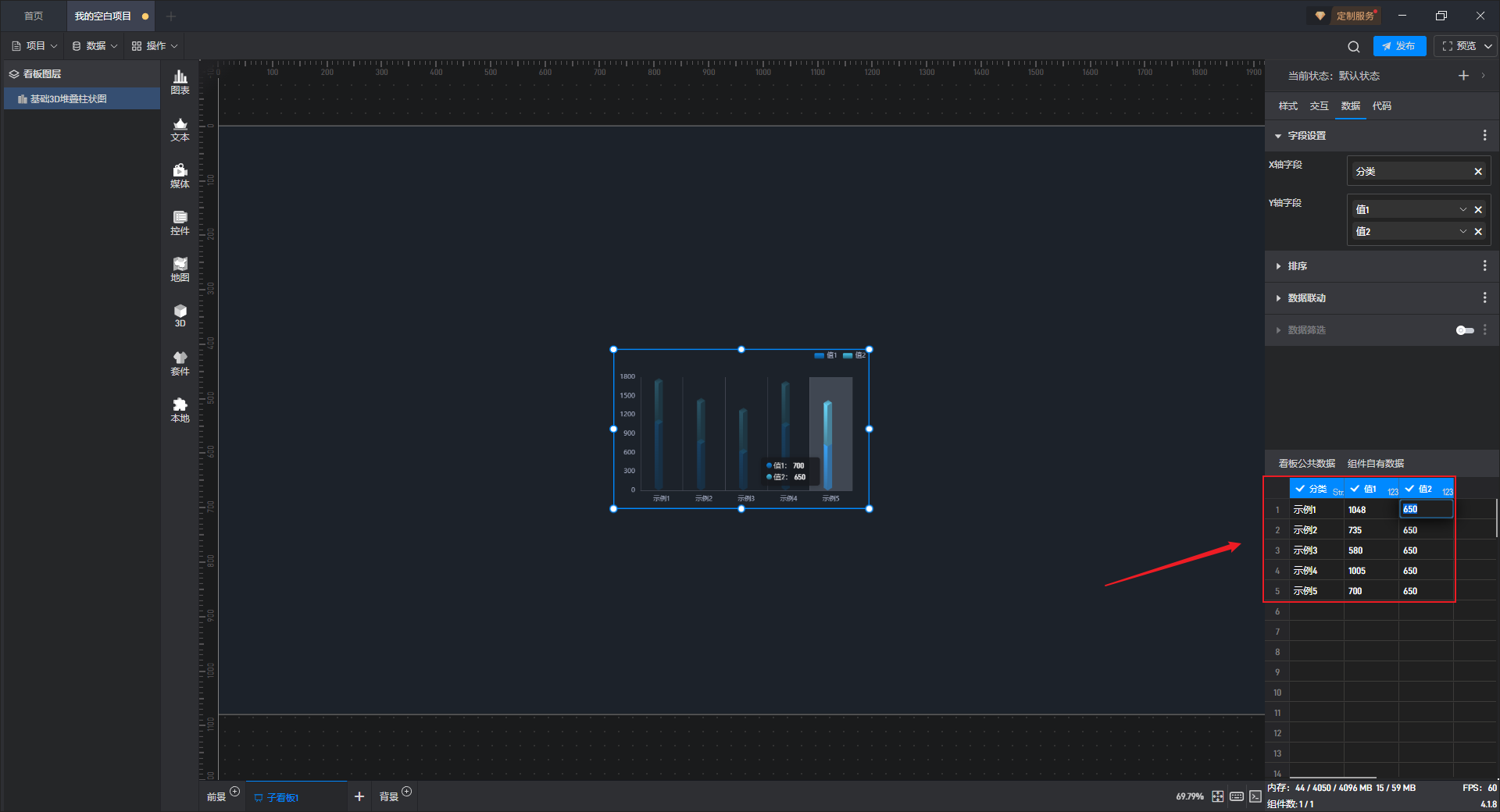 在“数据”设置界面下方可以直接修改数据,组件中的数据也会实时更新。