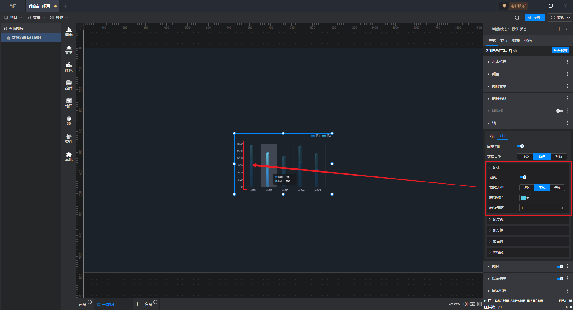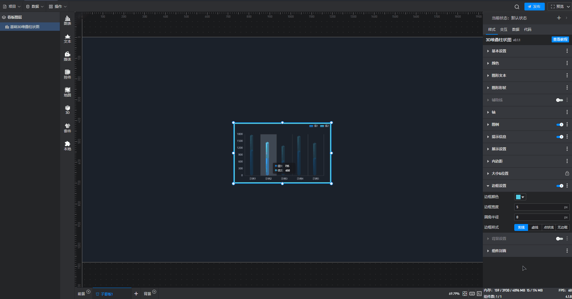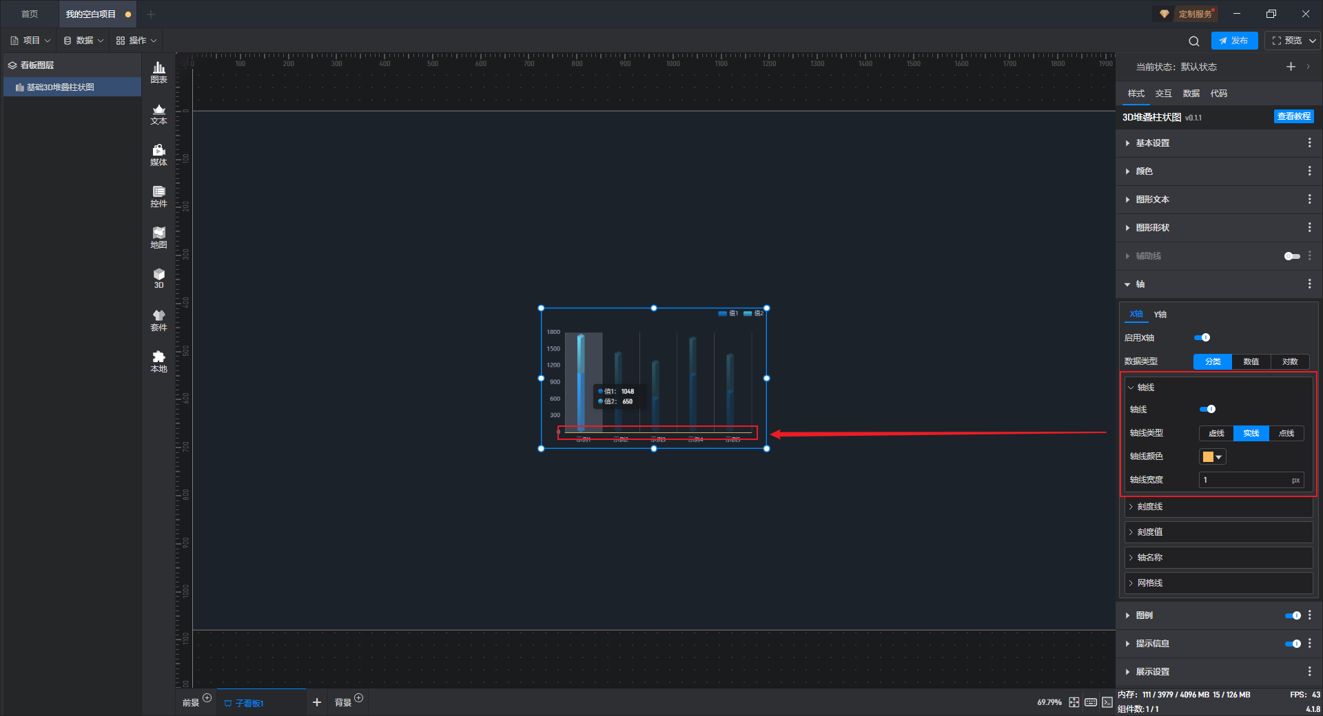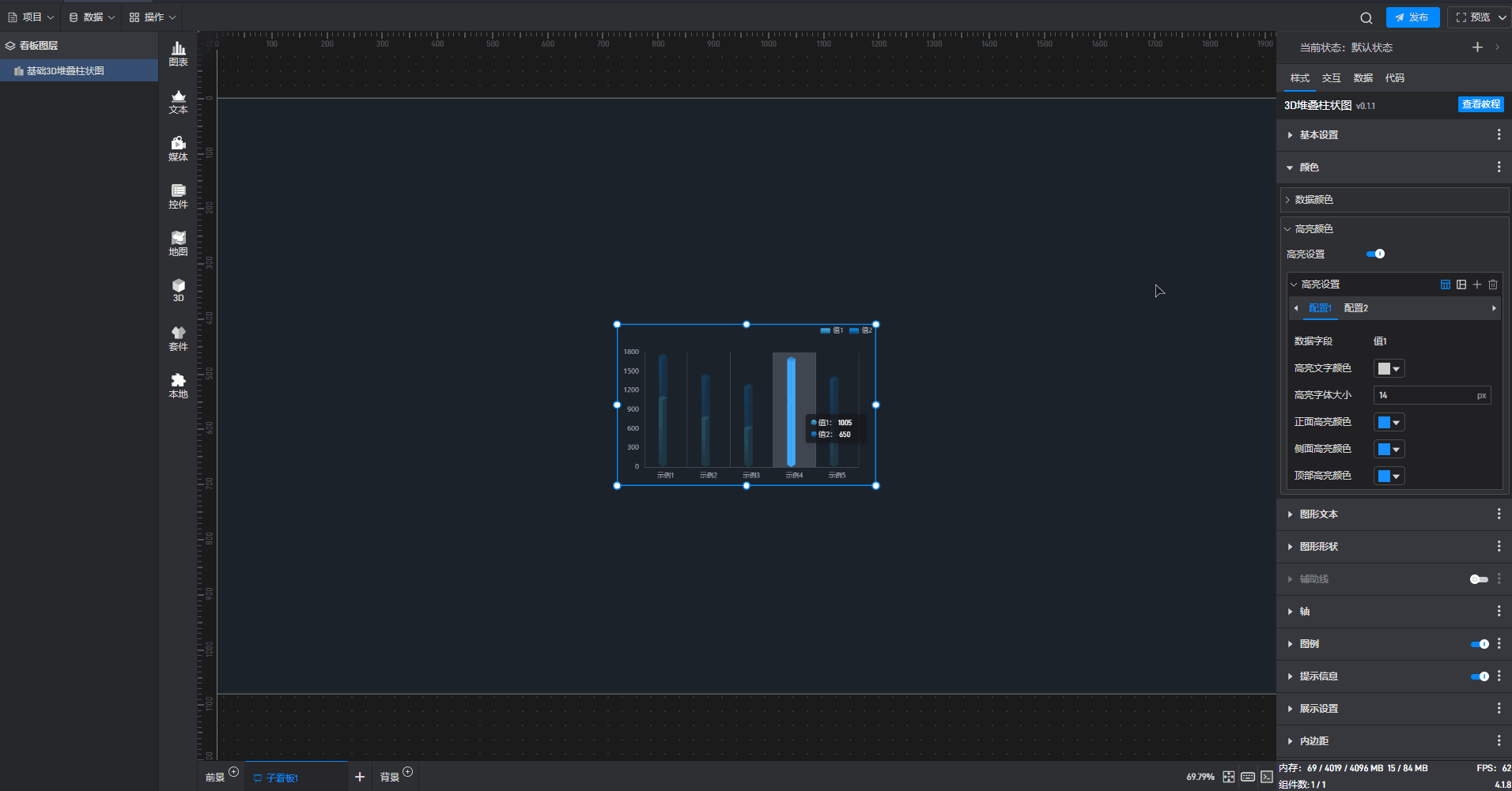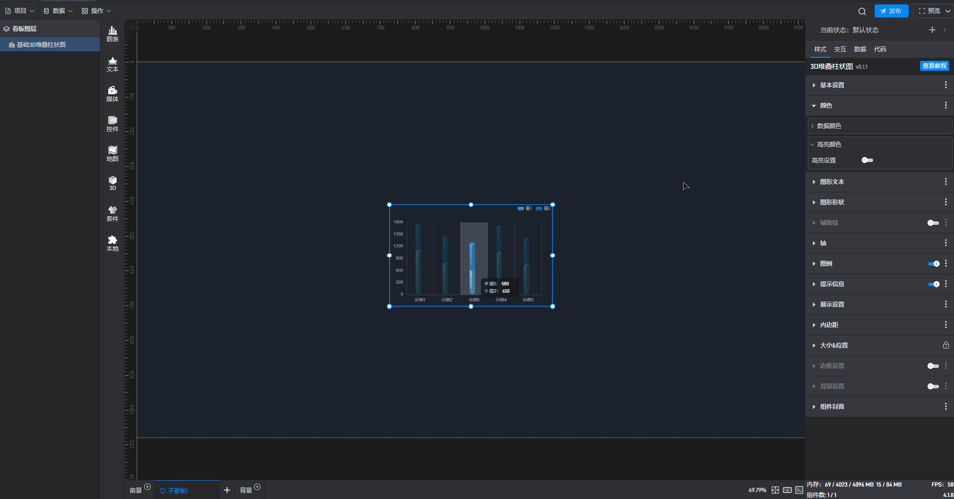 开启高亮设置,并设定高亮颜色,就可以看到组件在显示对应数据柱子时会显示设置的高亮颜色。