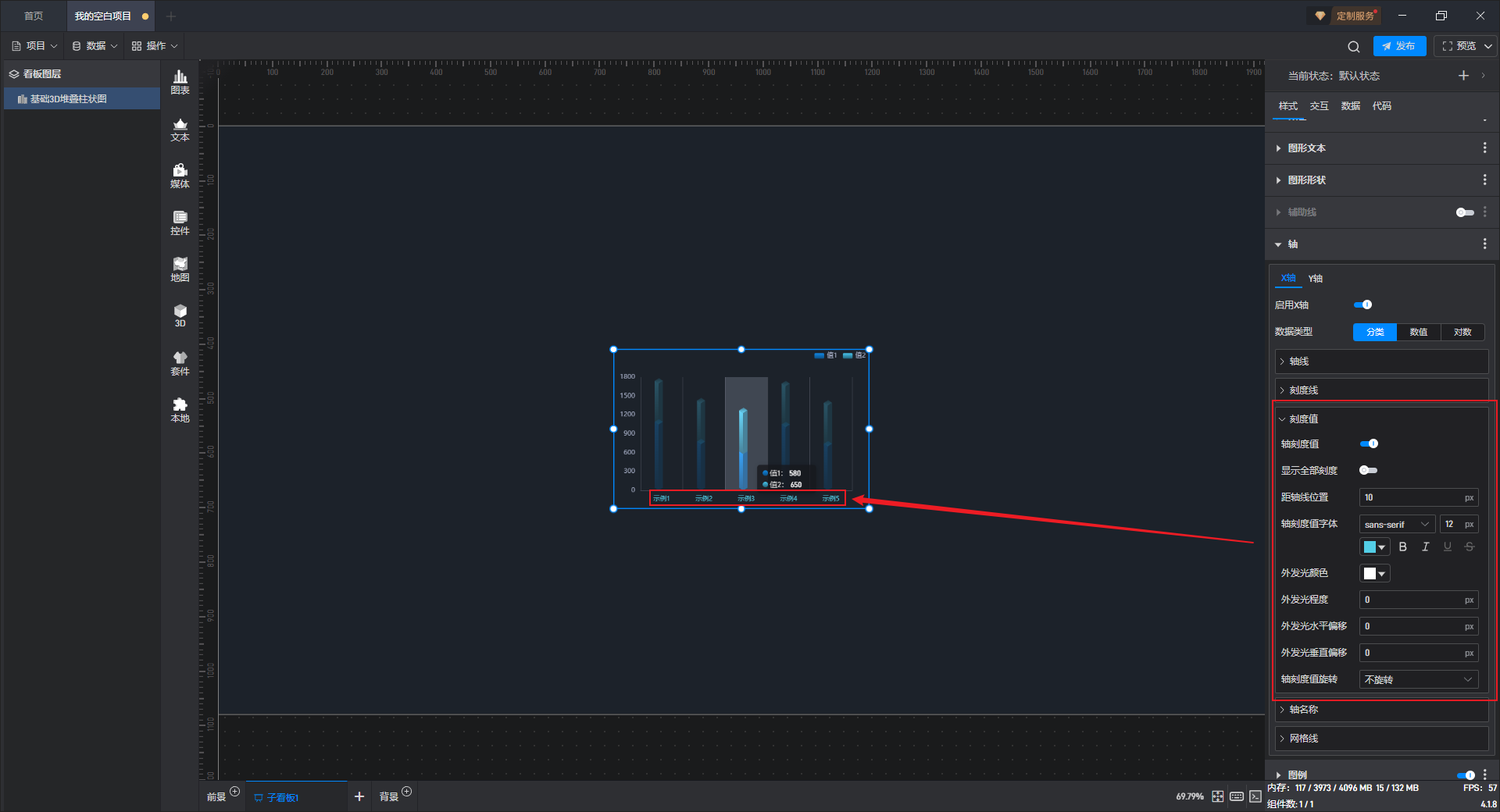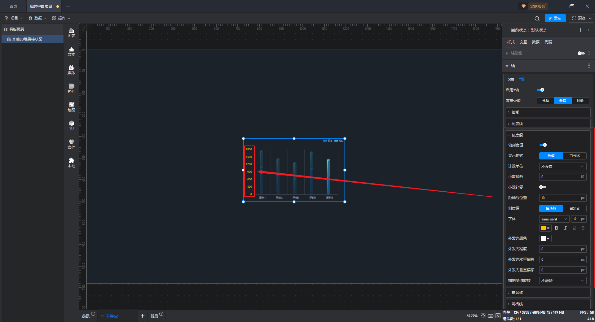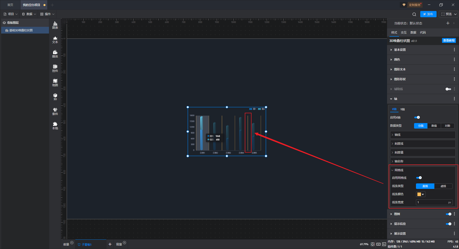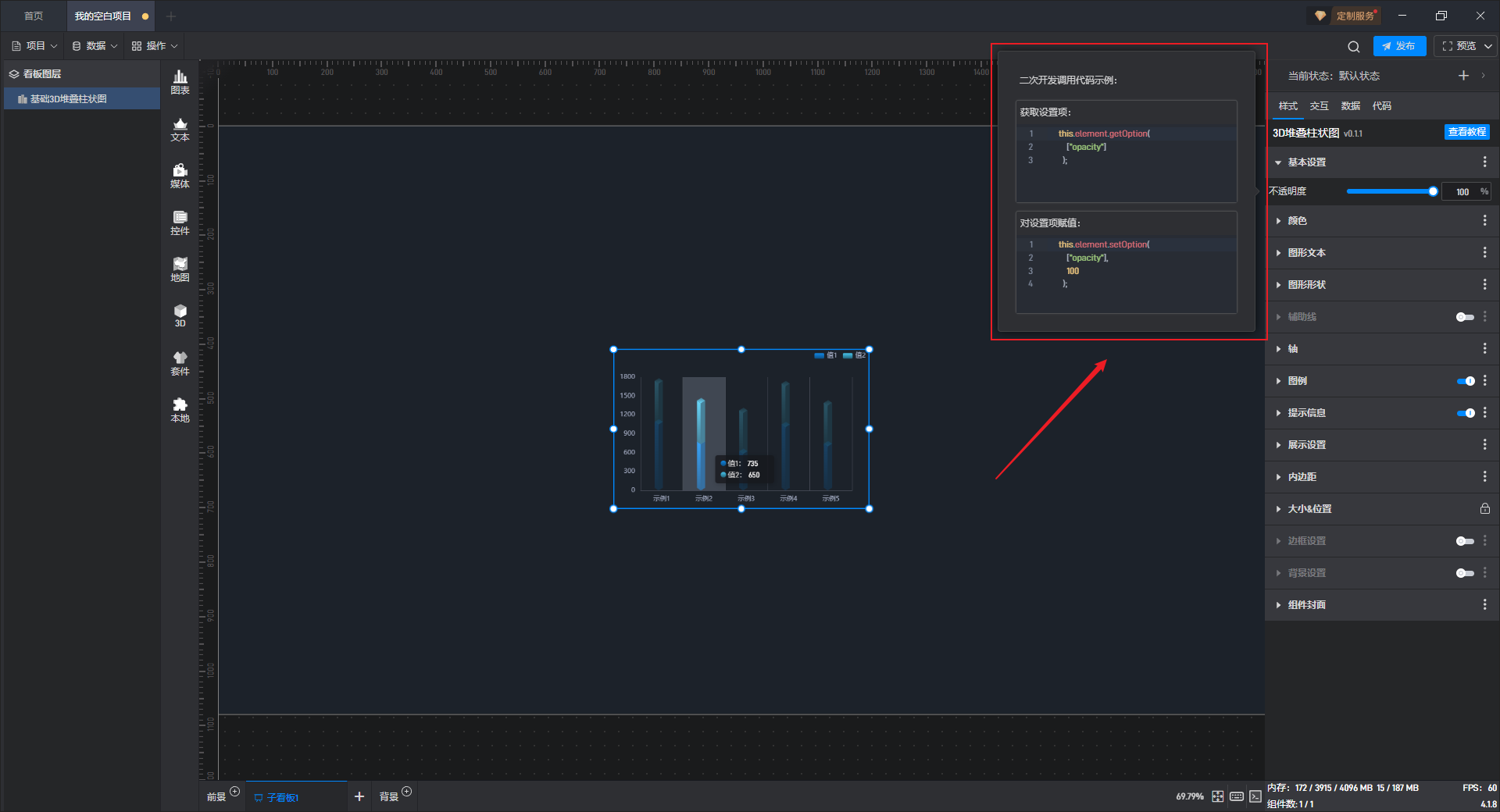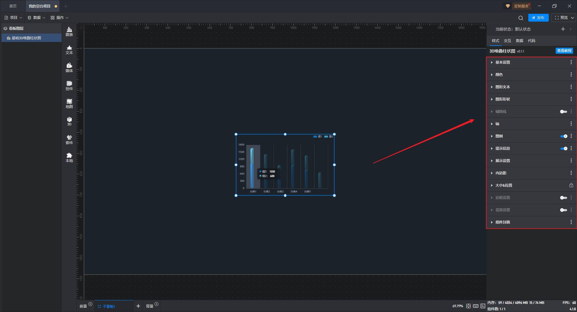 开启高亮设置,并设定高亮颜色,就可以看到组件在显示对应数据柱子时会显示设置的高亮颜色。