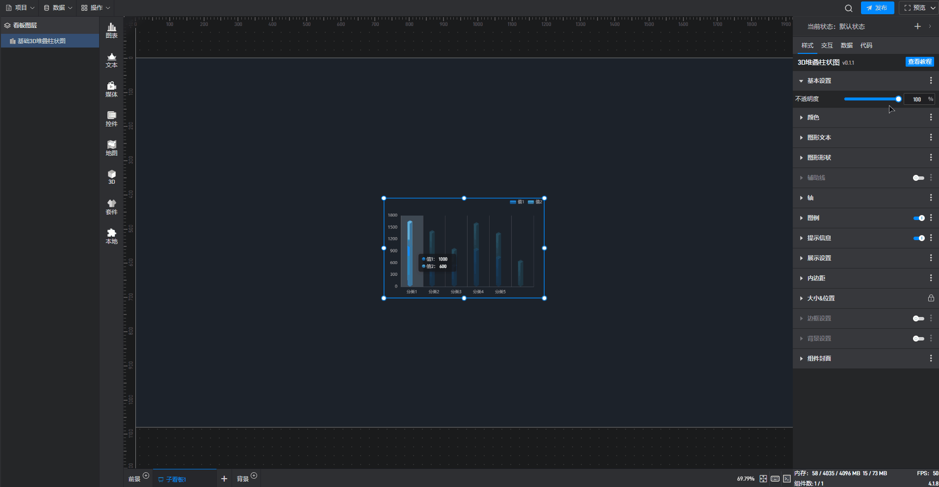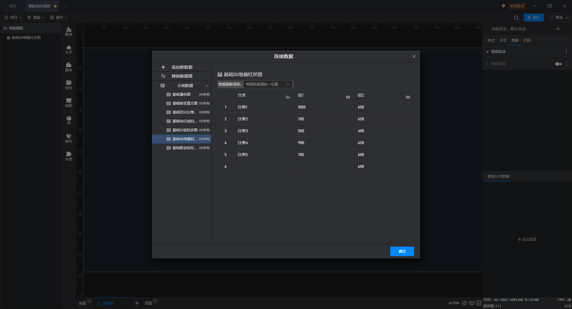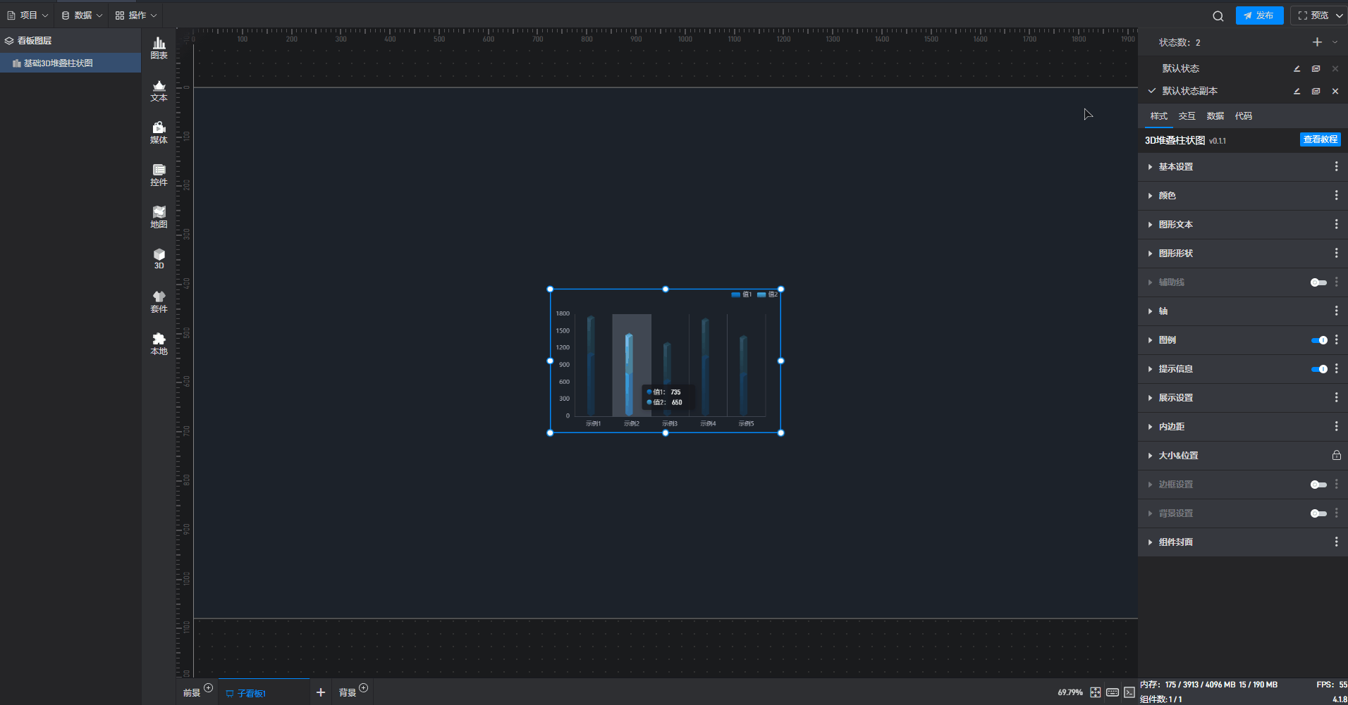 基础 3D 堆叠柱状图是3D 图表组件的一种预设样式。