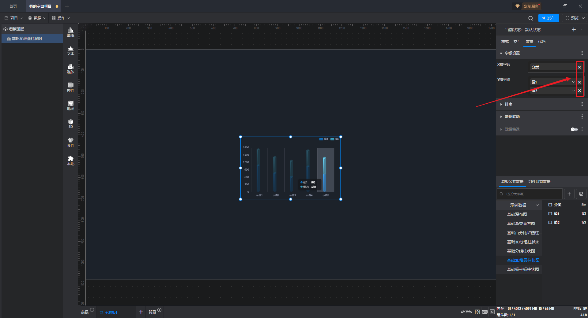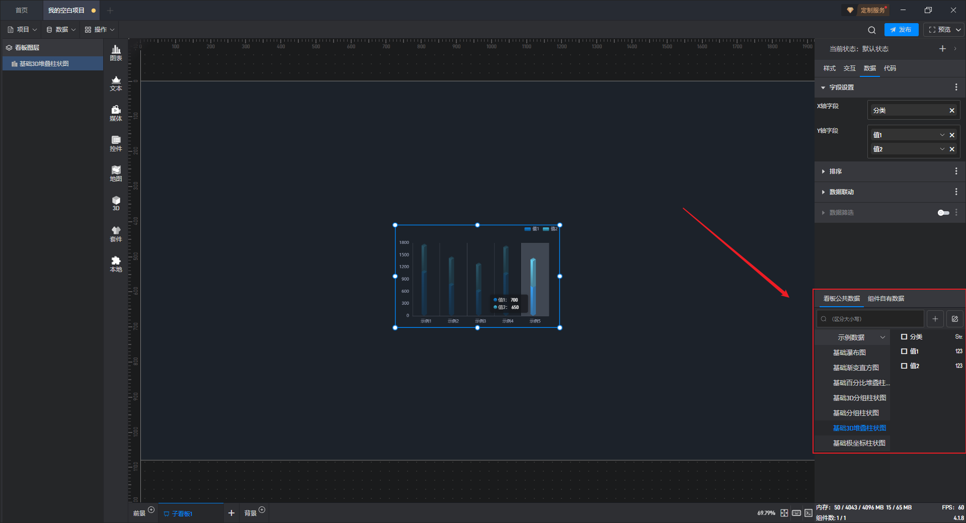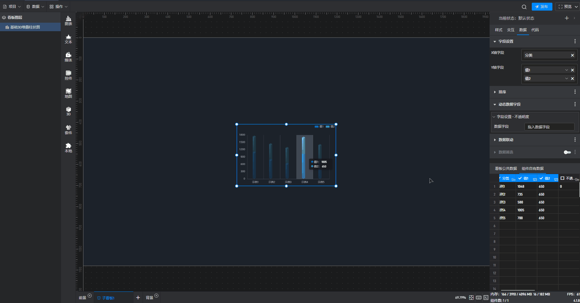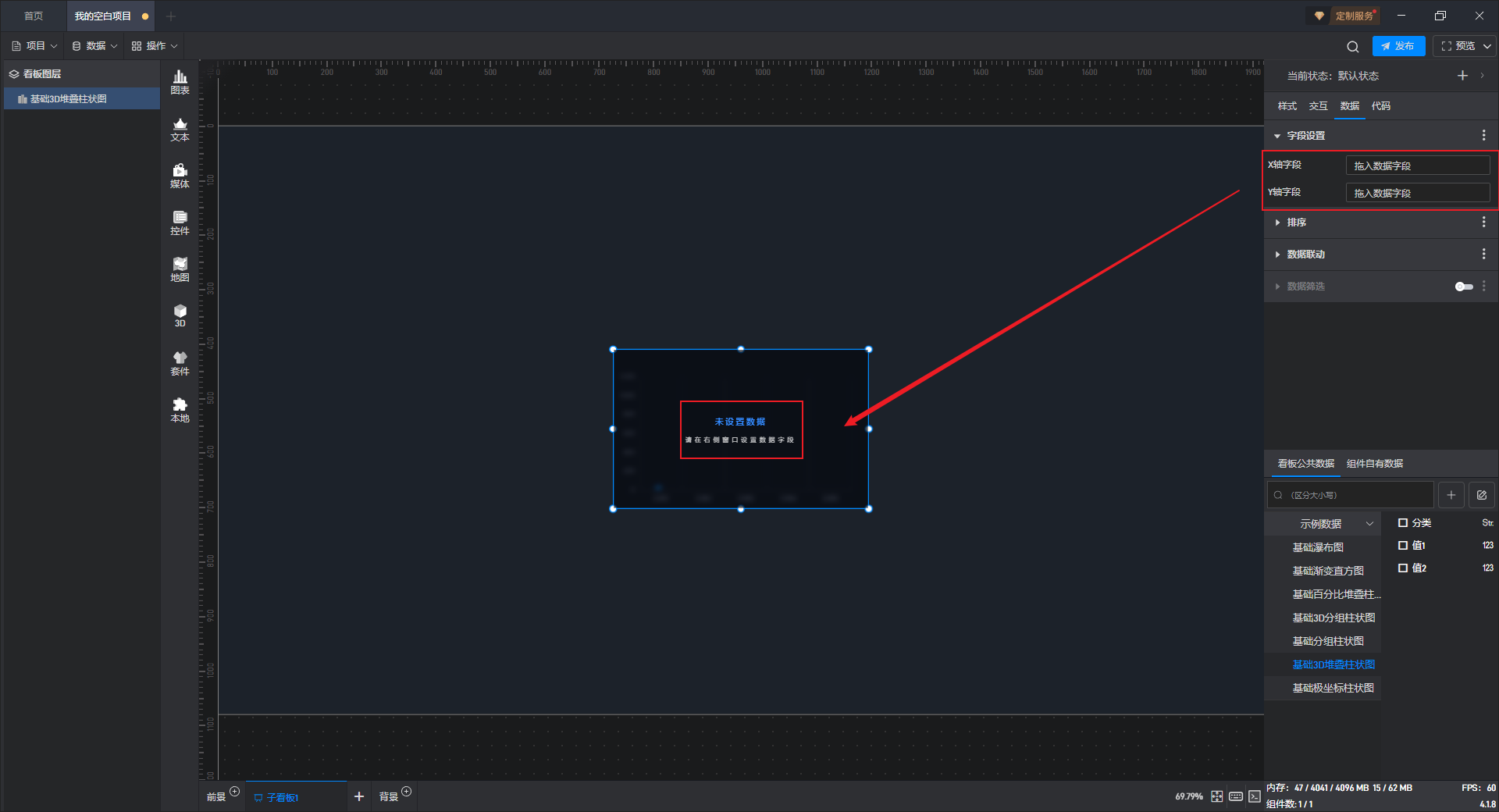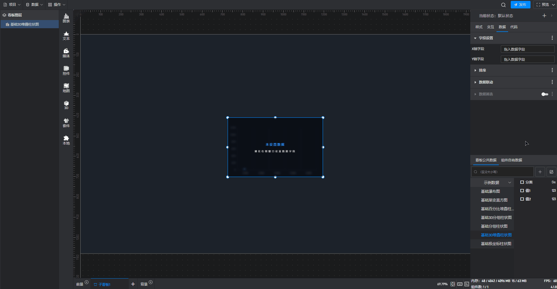 基础 3D 堆叠柱状图组件的数据由一个 X 轴字段和多个 Y 轴字段组成,一个 Y 轴字段对应一个柱子。