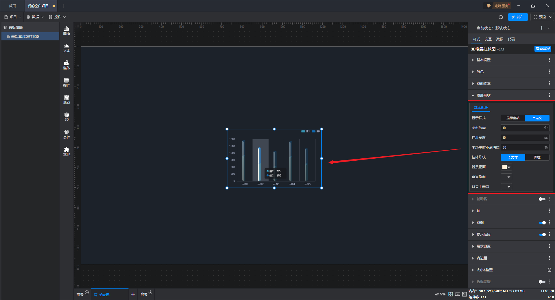 | 图形数量 | 柱子“自定义”显示样式则自定义设置柱子的数量,默认柱子数量为“10 个”。 |