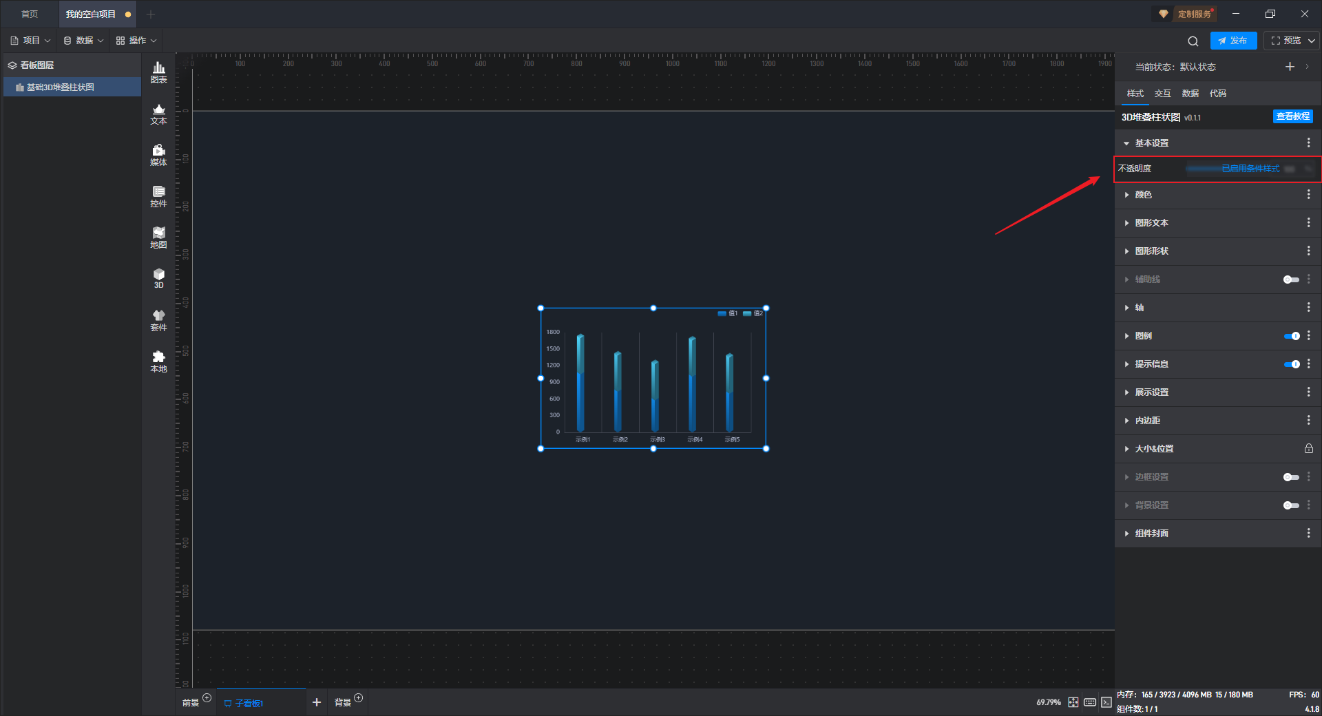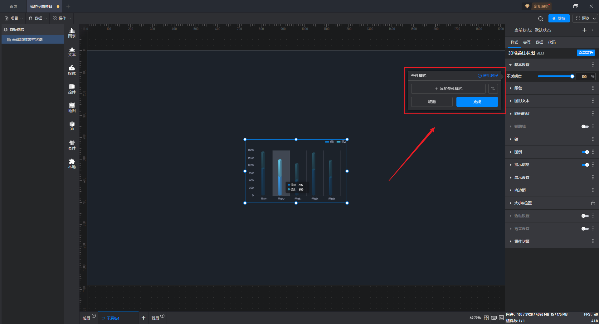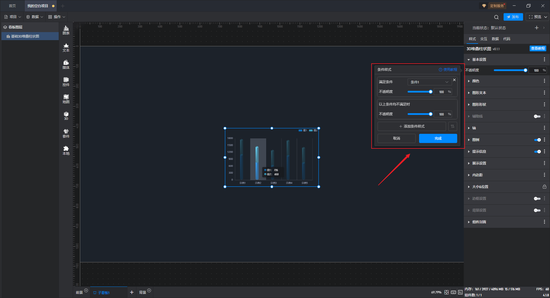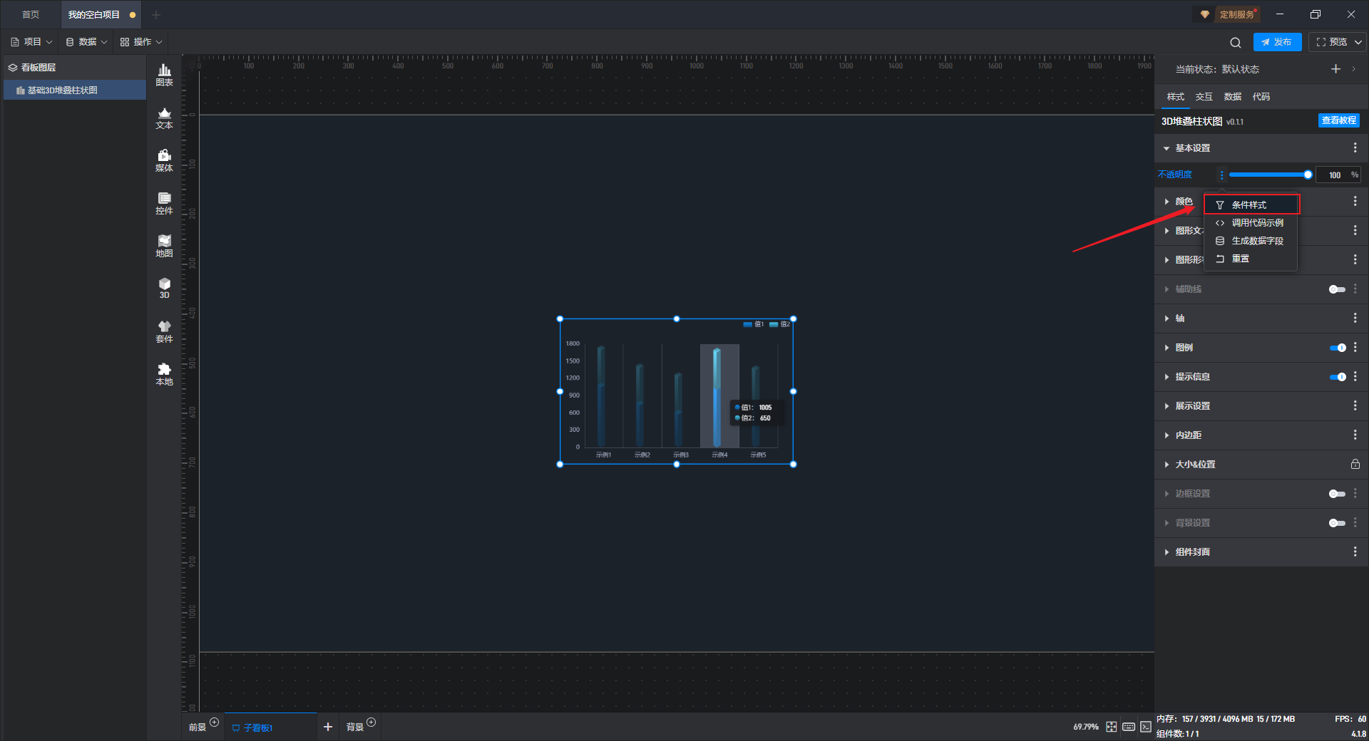 部分设置项的条件设置方式直接显示在该设置项中,可以直接在该设置项上设置,但基础 3D 堆叠柱状图的条件样式只能通过方式 1进行设置。