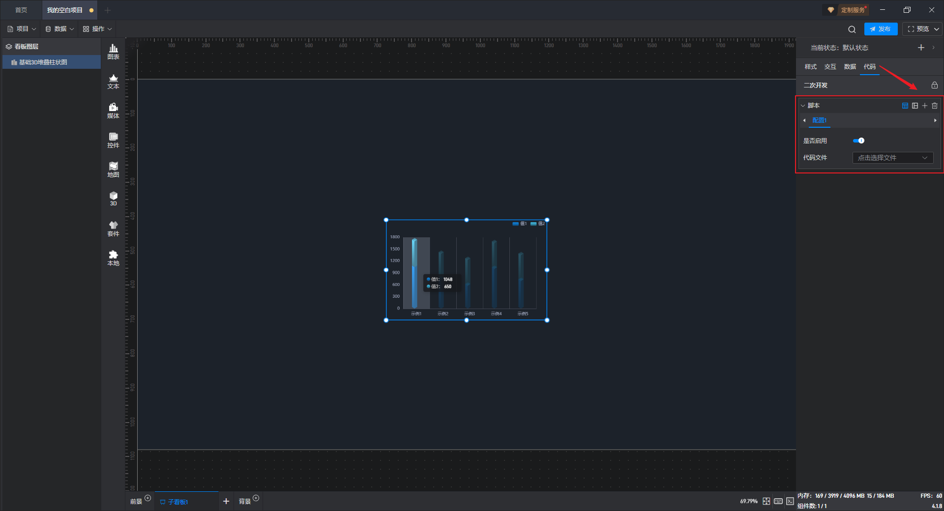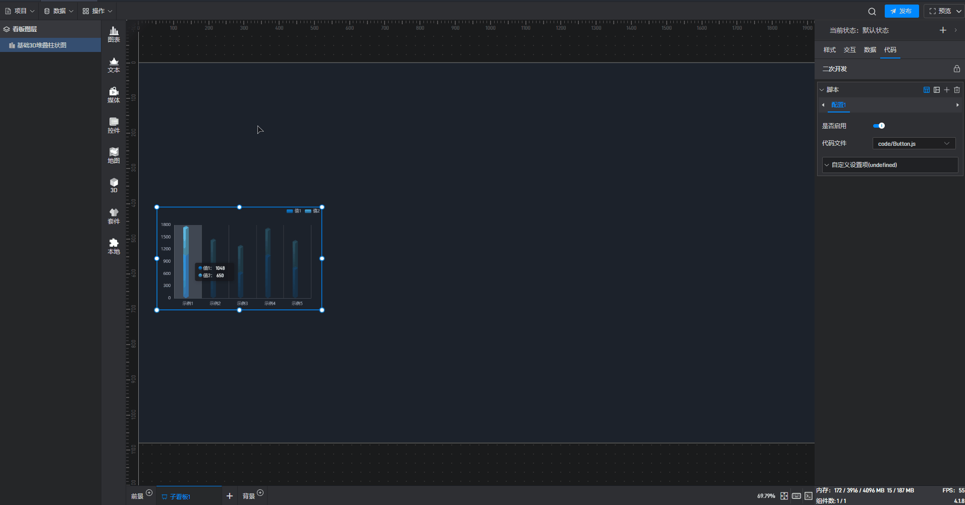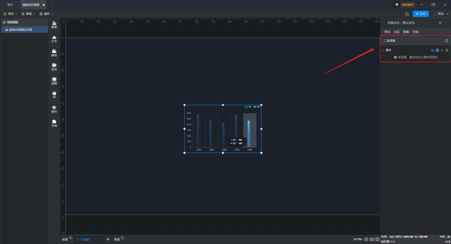 点击选中组件,在右侧设置窗口中切换到“代码”,可以对组件进行二次开发设置。