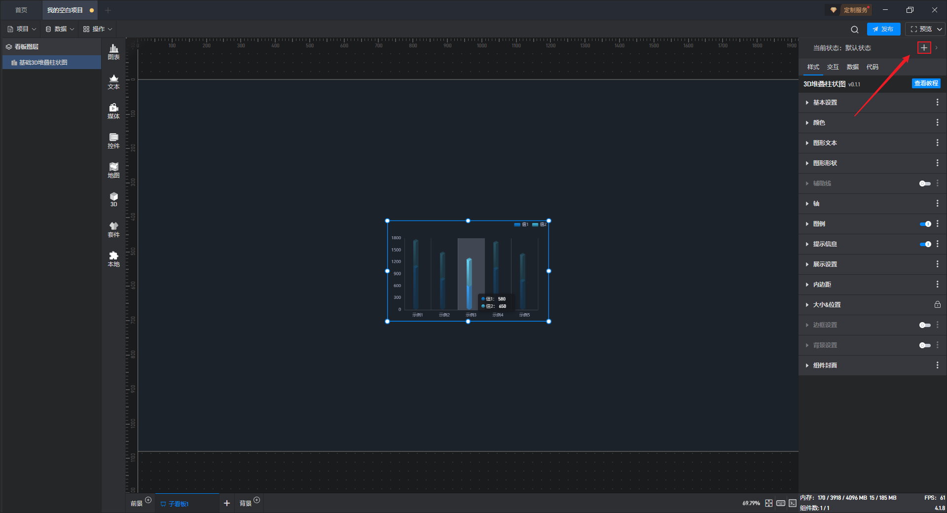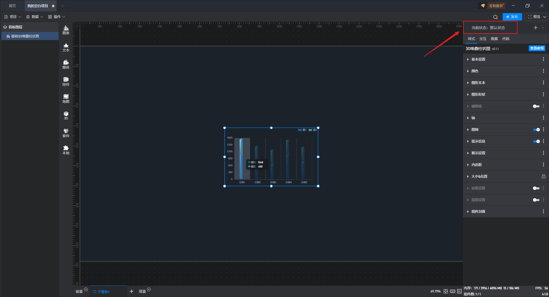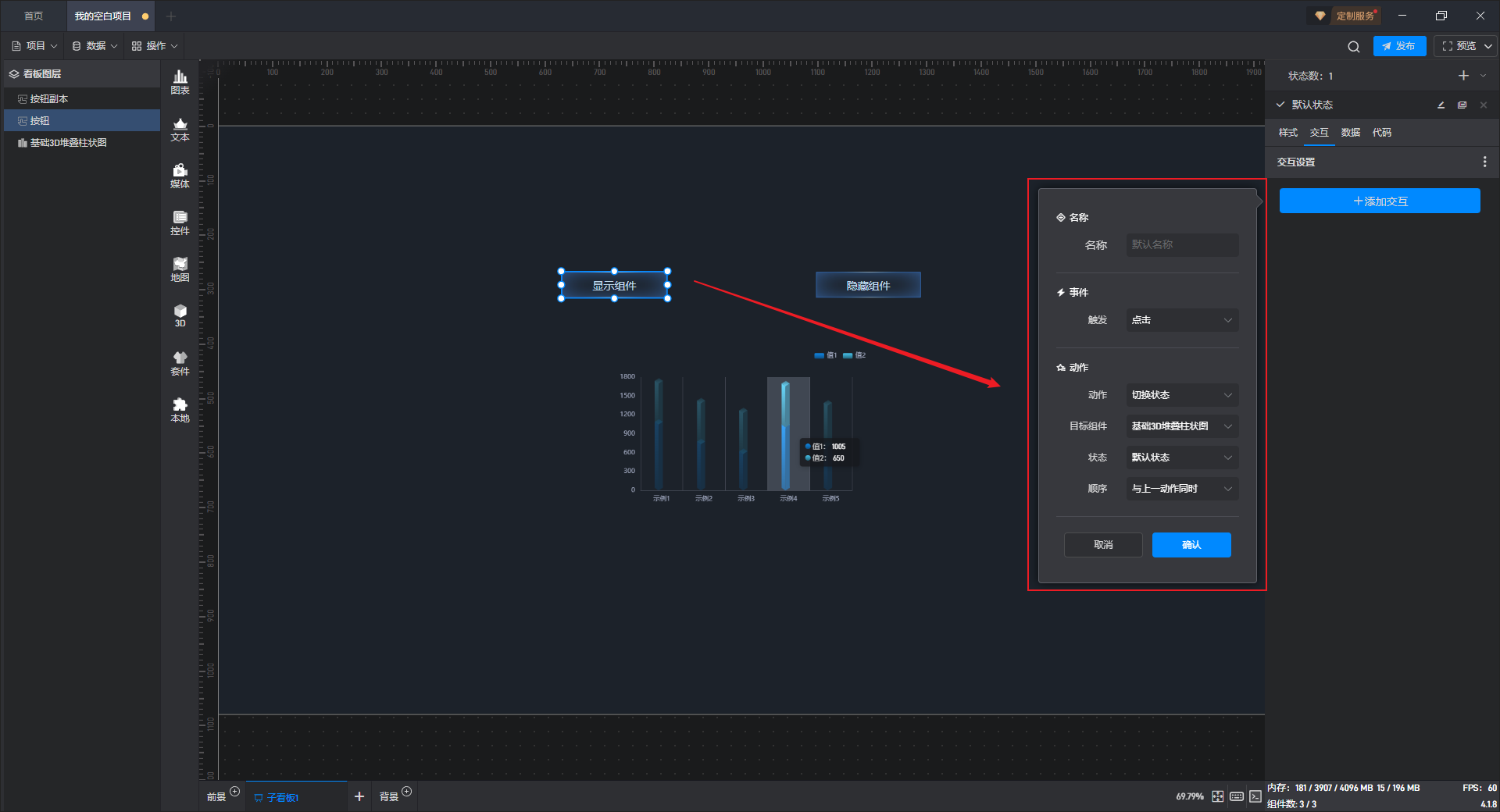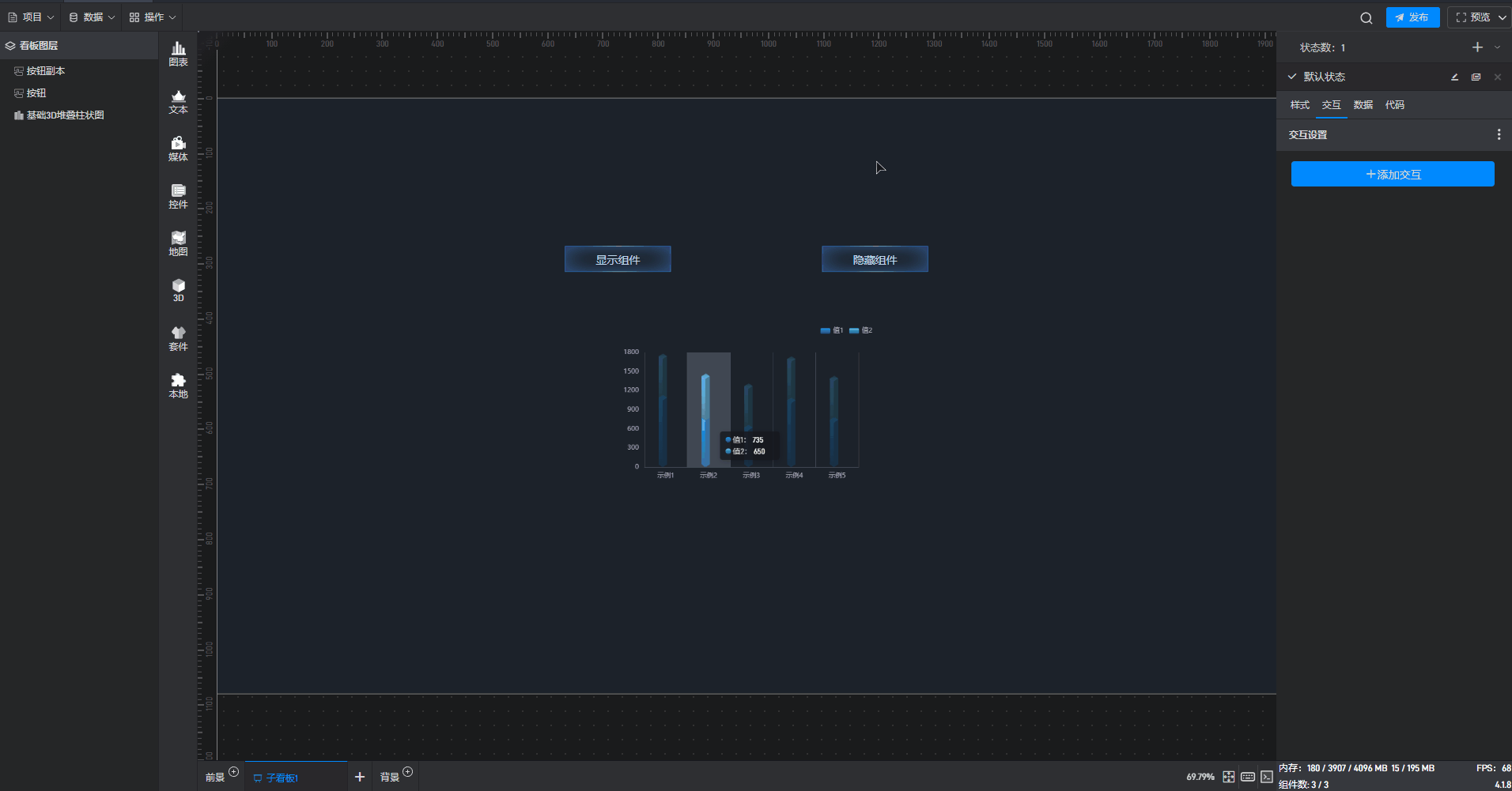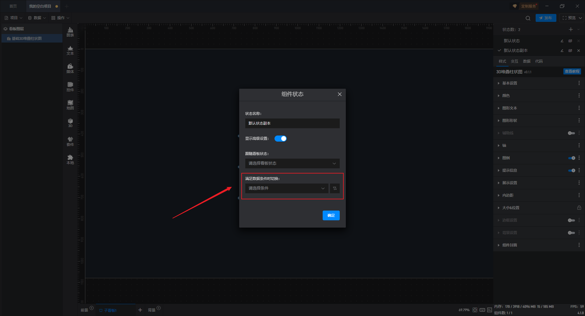 多状态主要用于通过数据条件或是点击交互(通常是点击其他组件来触发本组件的状态切换)来切换组件设置项的场景,这里的设置项包括组件的样式、交互、数据和代码。