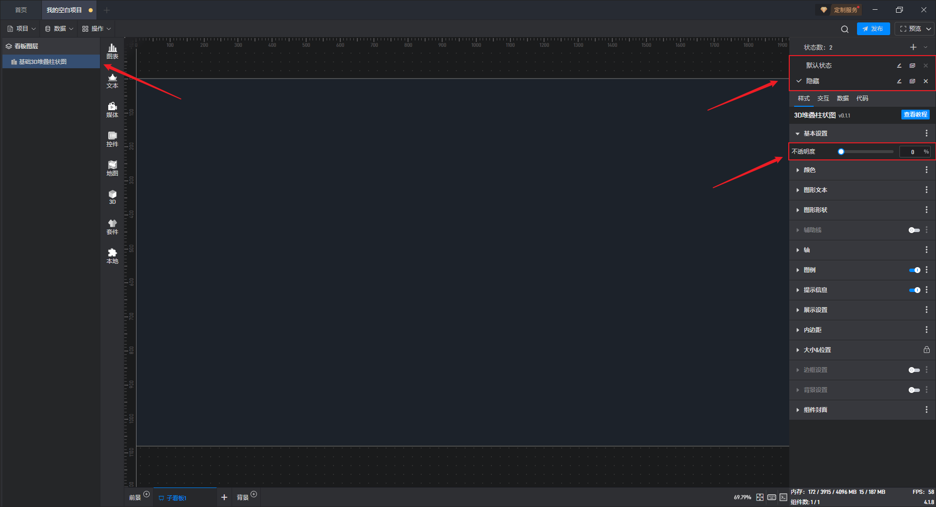 添加一个数值为“0”的数据到数据字段中,可以看到通过动态数据字段将不透明度的数值修改为“0”,从而使组件隐藏。