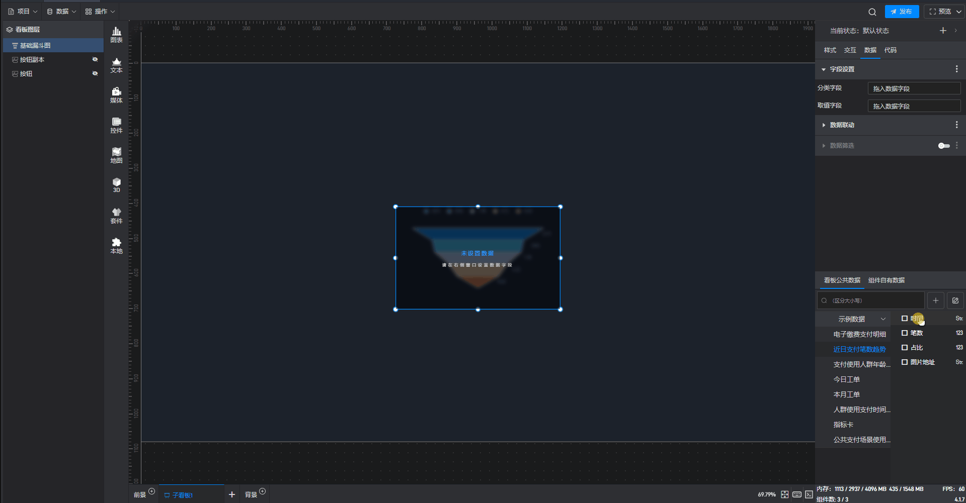 点击选中组件,在右侧“数据”设置窗口中切换到“看板公共数据”(同一个项目中所有数据源是共享的)。